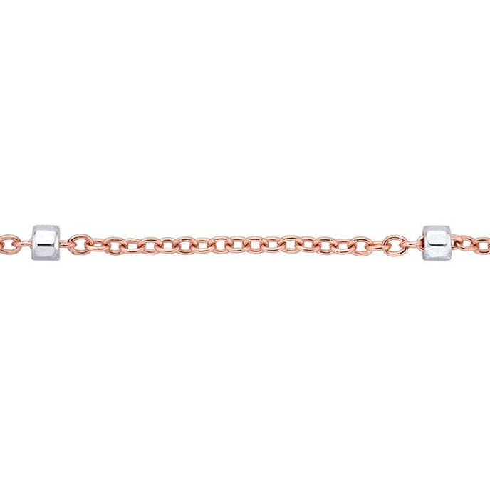 This 14/20 rose gold-filled cable chain offers a classic profile and sterling silver roundel beads spaced evenly along its length. This chain is plated with 14-karat rose gold to ensure a uniform color.