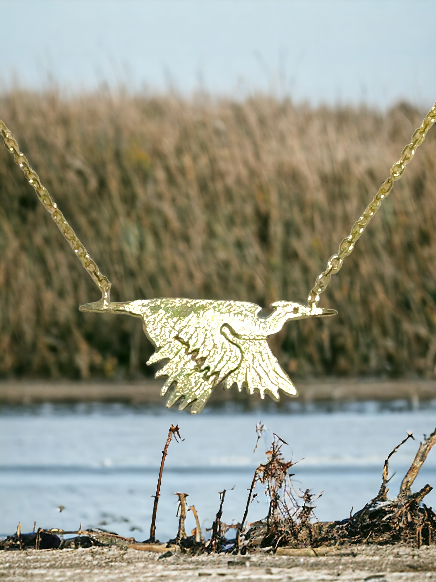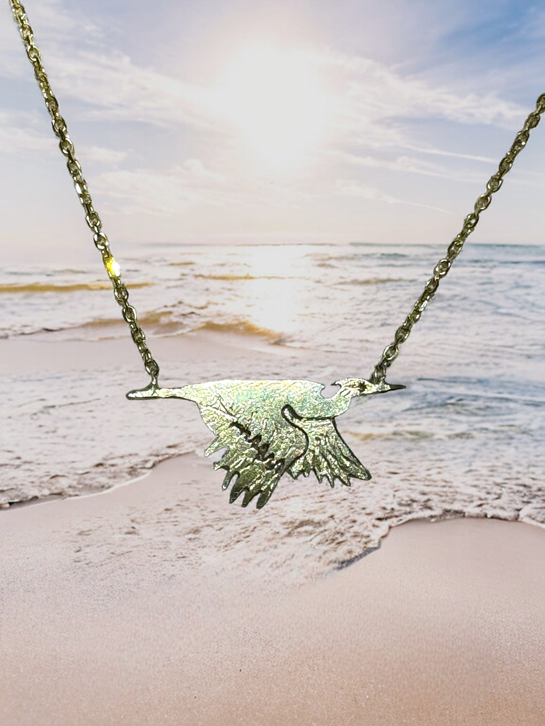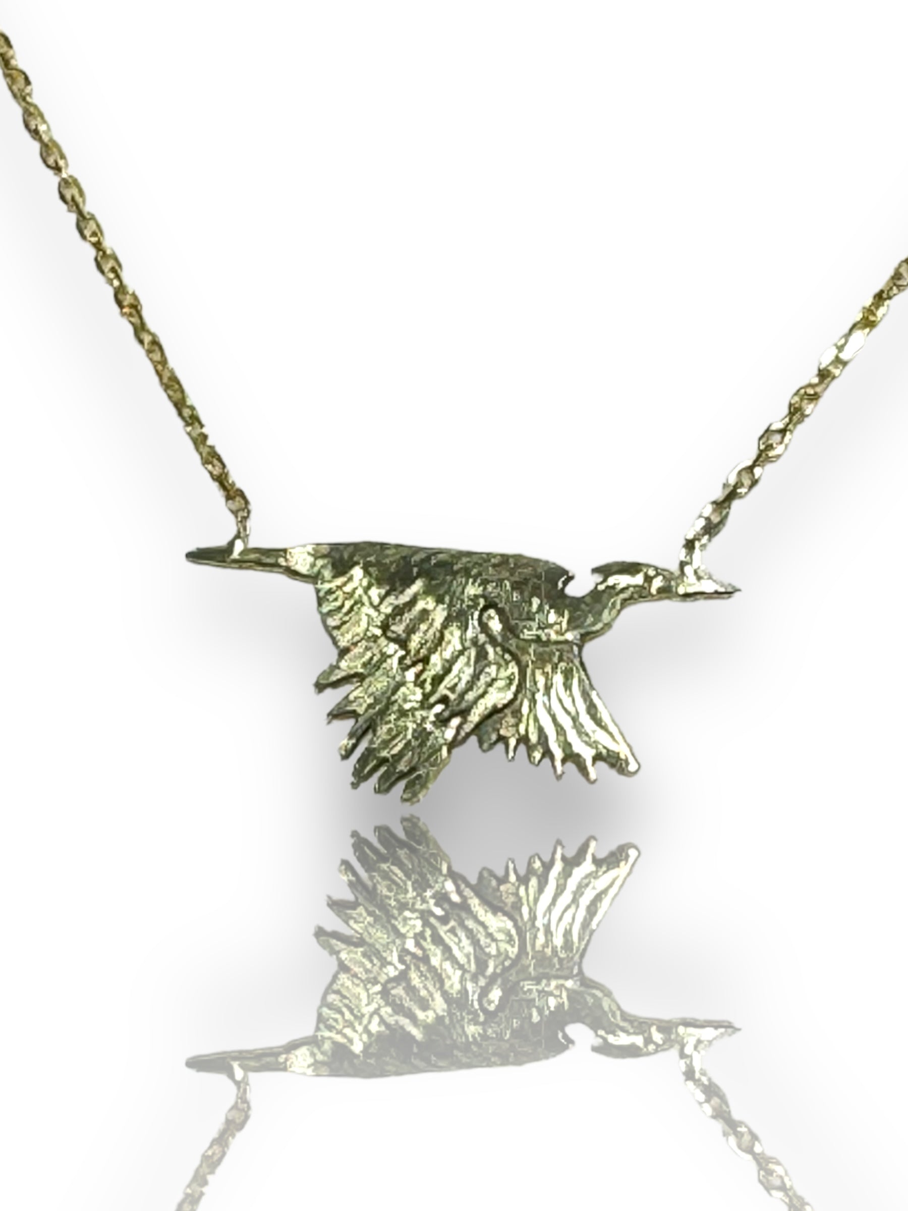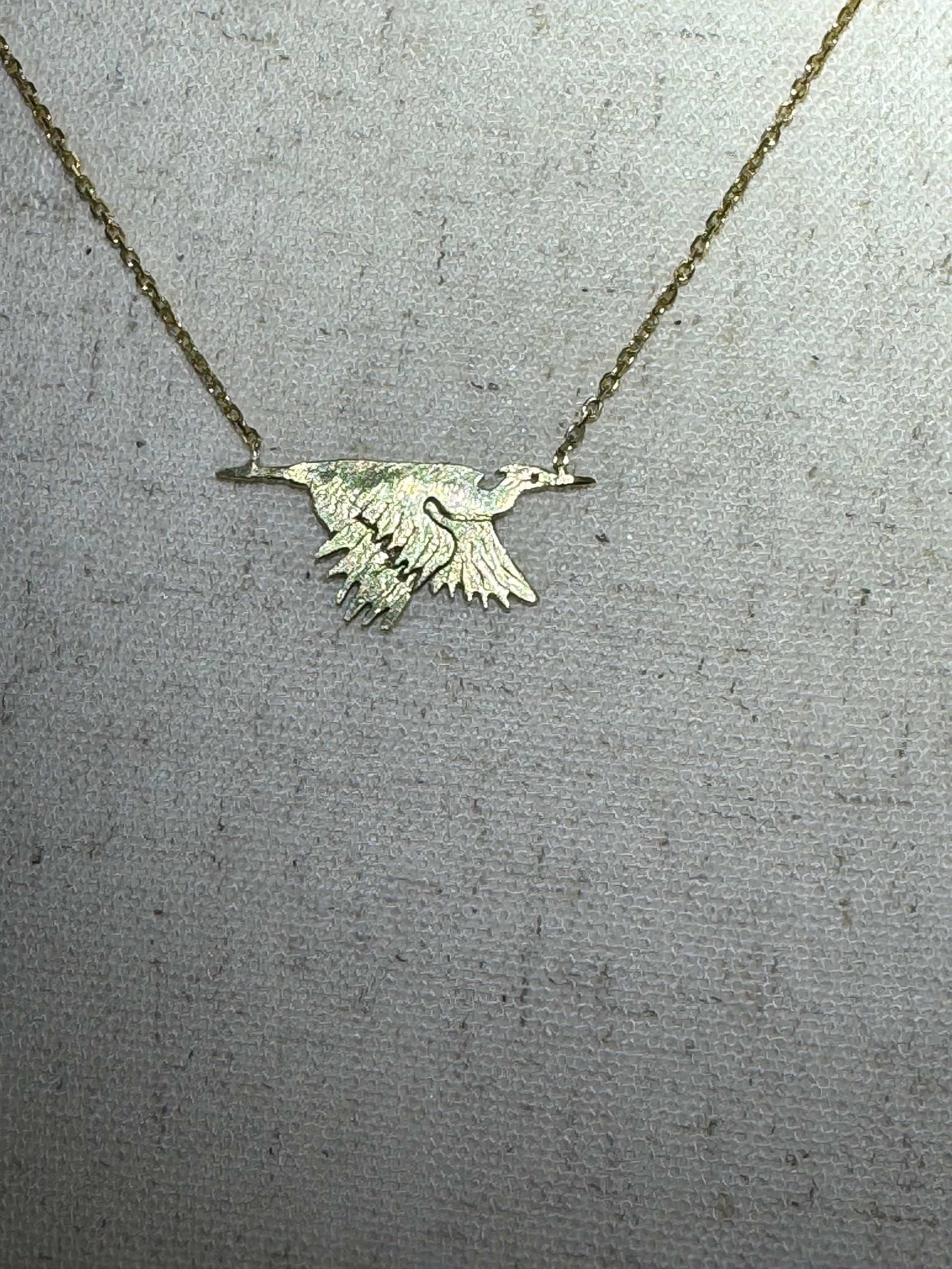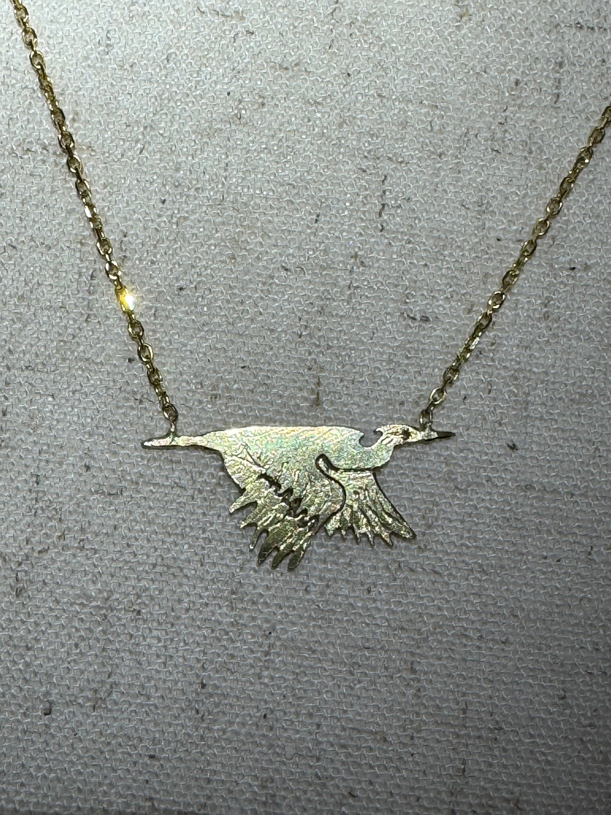 Pictured: Rich 18k yellow gold flying heron attached to an 18” 14k yellow gold chain.