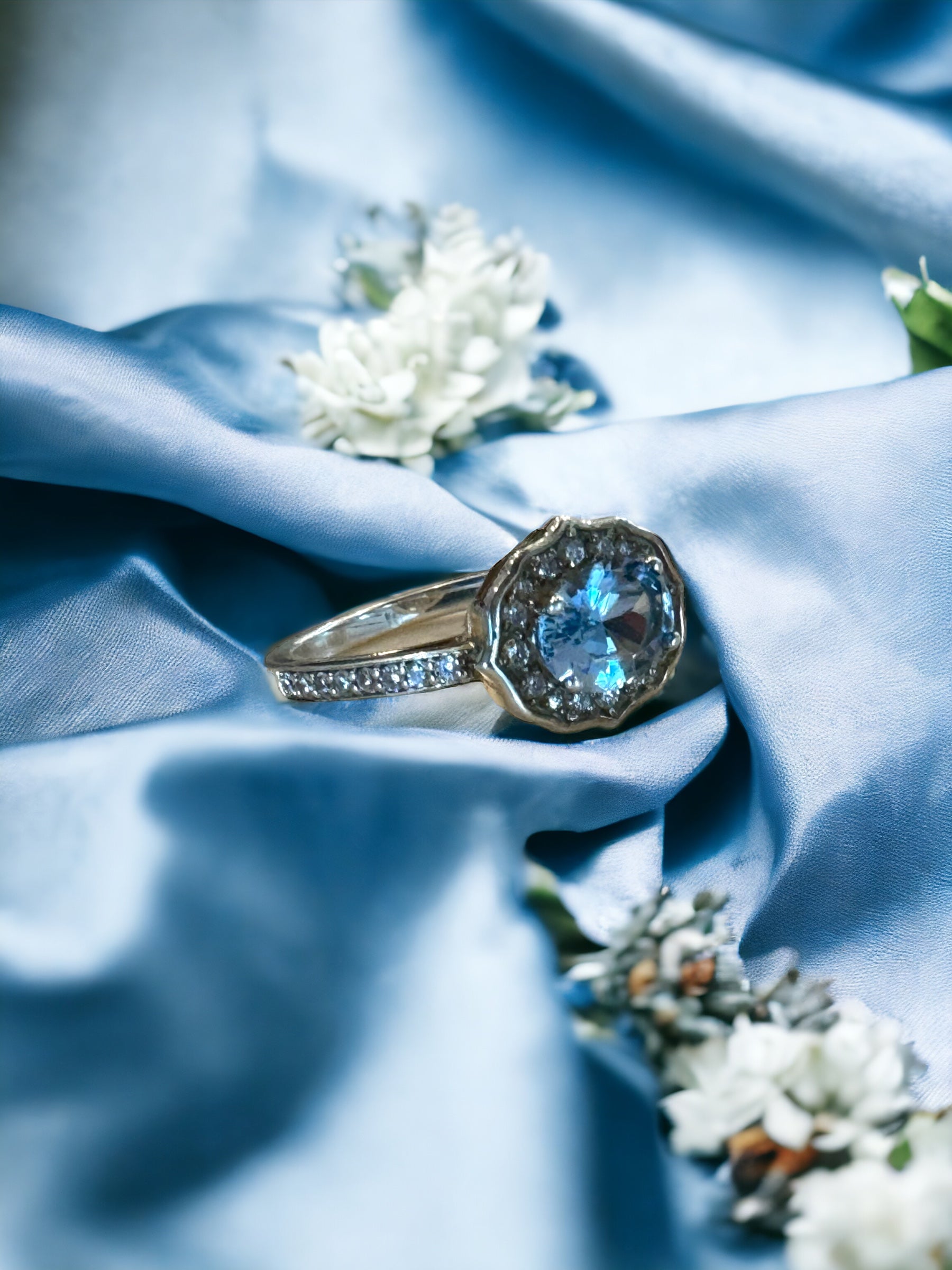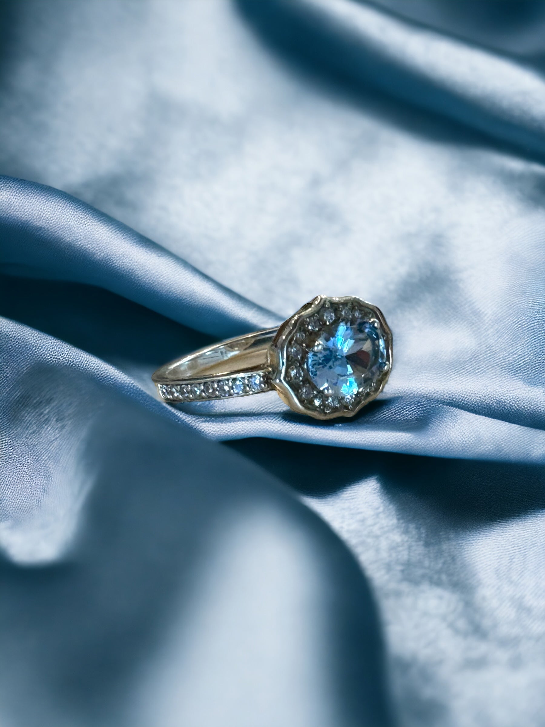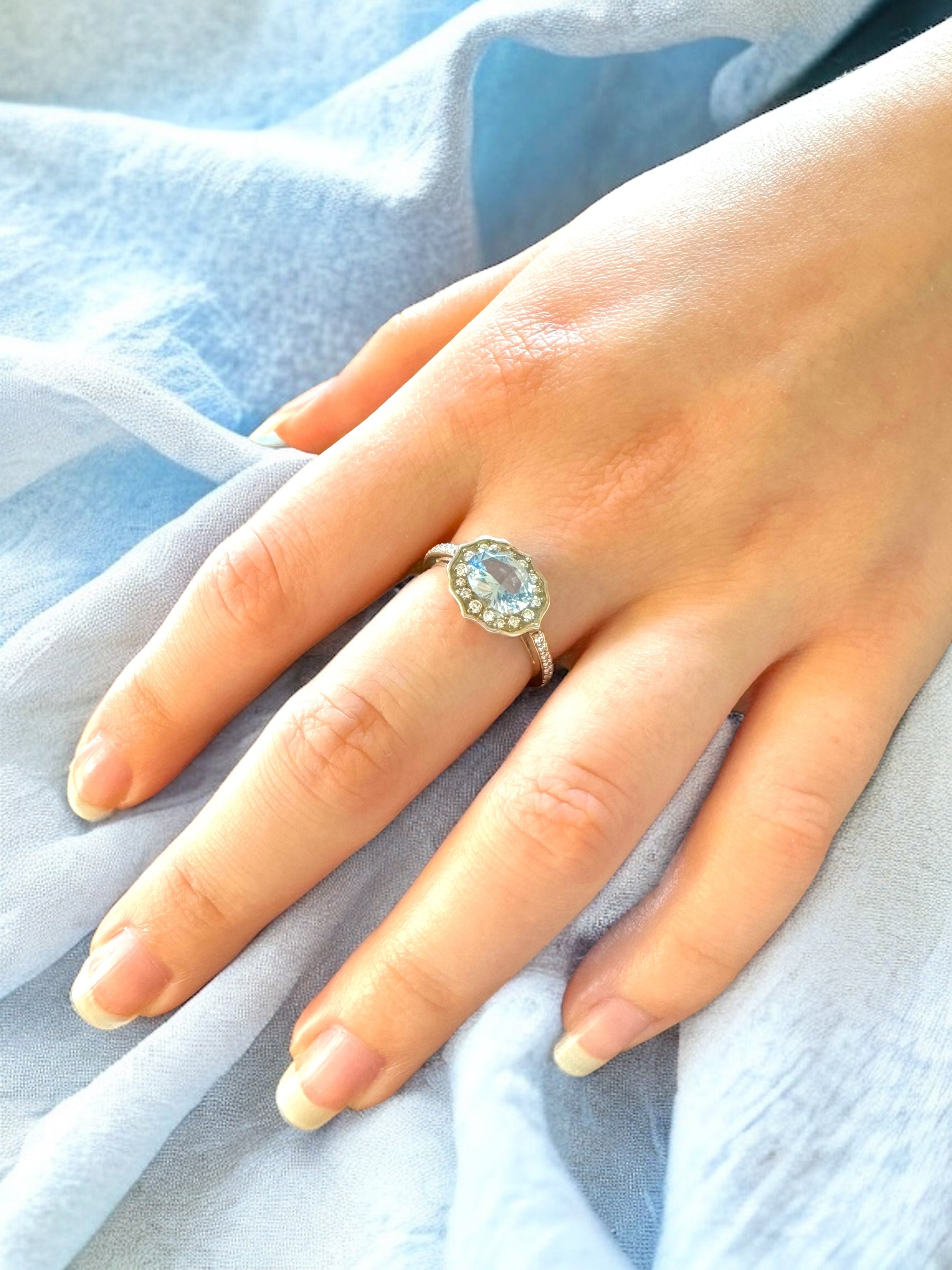 Expertly crafted with a stunning 8mm x 6mm lab-created aquamarine stone at its center, surrounded by a halo of 32 diamonds, this bespoke ring exudes elegance and beauty, crafted with exquisite attention to detail and timeless design. Boasting F color and VS or better quality, the diamonds provide exceptional sparkle in spite of their small size. The sterling silver setting ensures durability and affordability, making this exquisite piece perfect for everyday wear.
