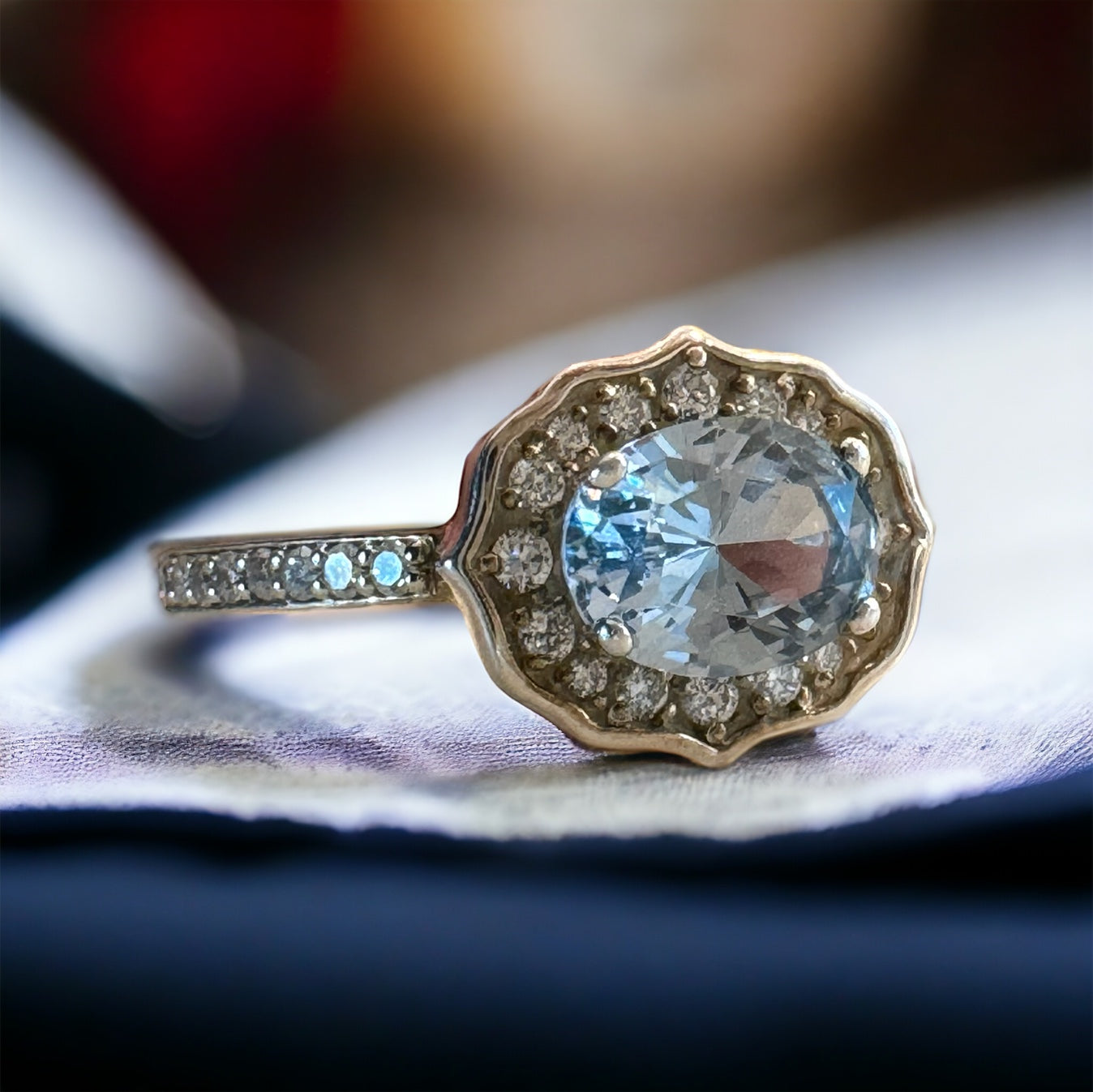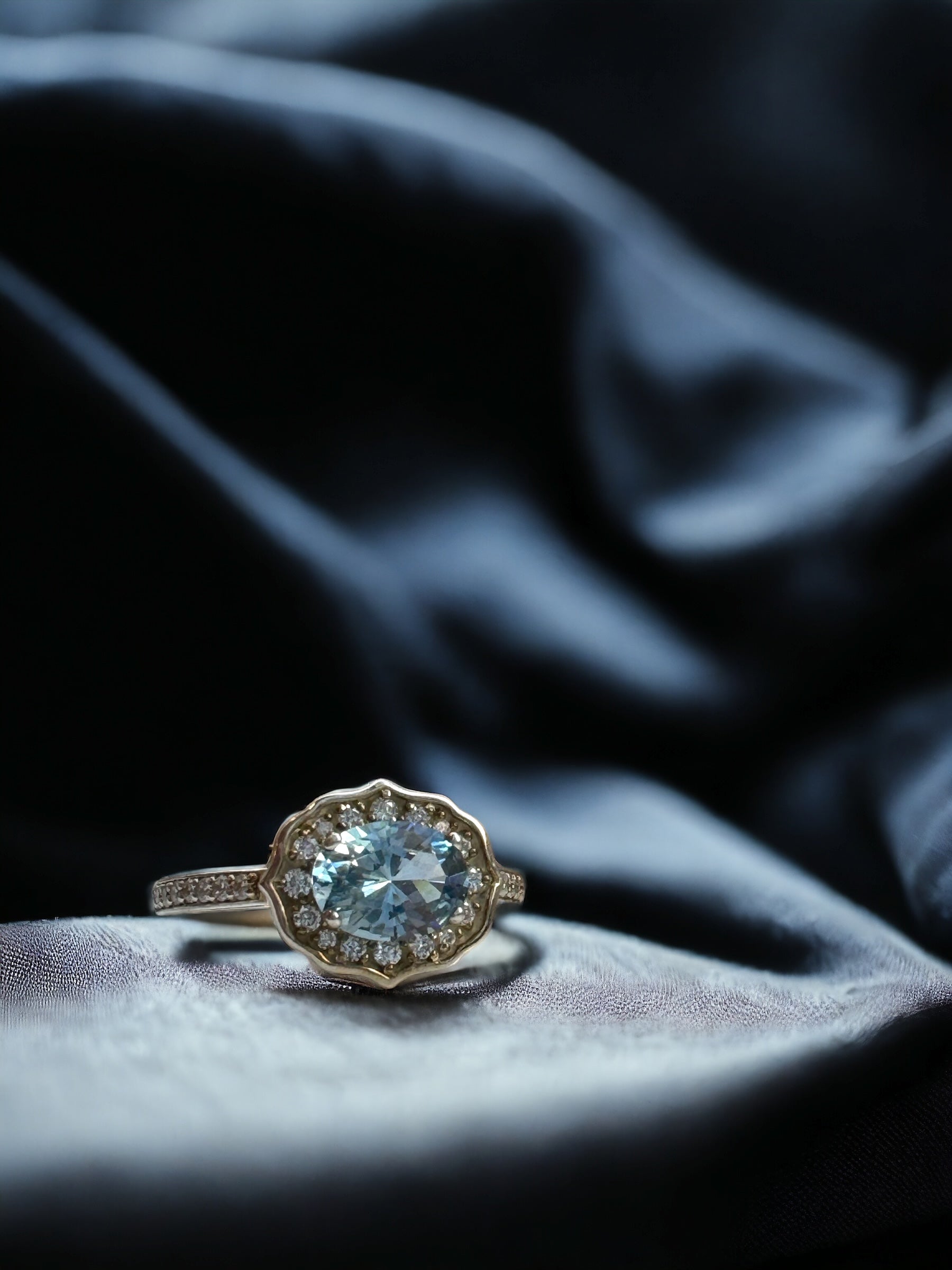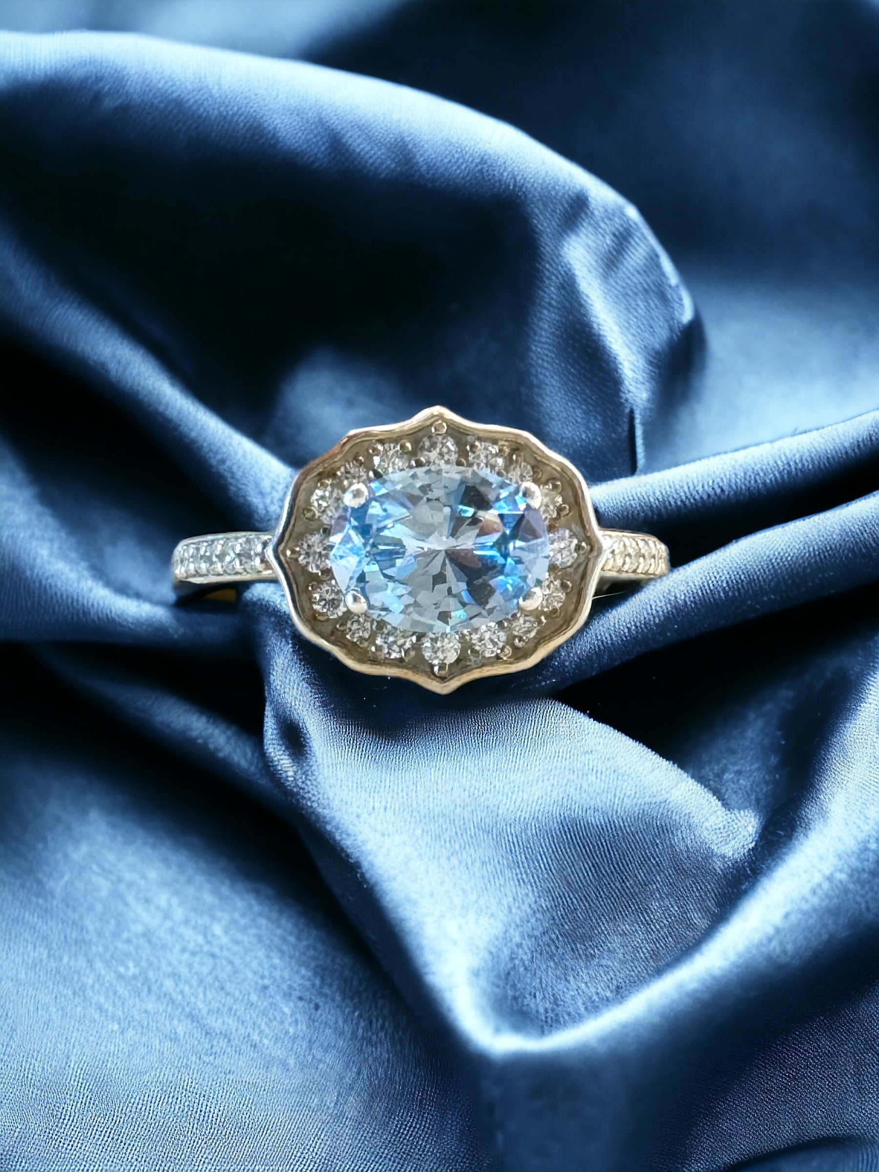 Expertly crafted with a stunning 8mm x 6mm lab-created aquamarine stone at its center, surrounded by a halo of 32 diamonds, this bespoke ring exudes elegance and beauty, crafted with exquisite attention to detail and timeless design. Boasting F color and VS or better quality, the diamonds provide exceptional sparkle in spite of their small size. The sterling silver setting ensures durability and affordability, making this exquisite piece perfect for everyday wear.