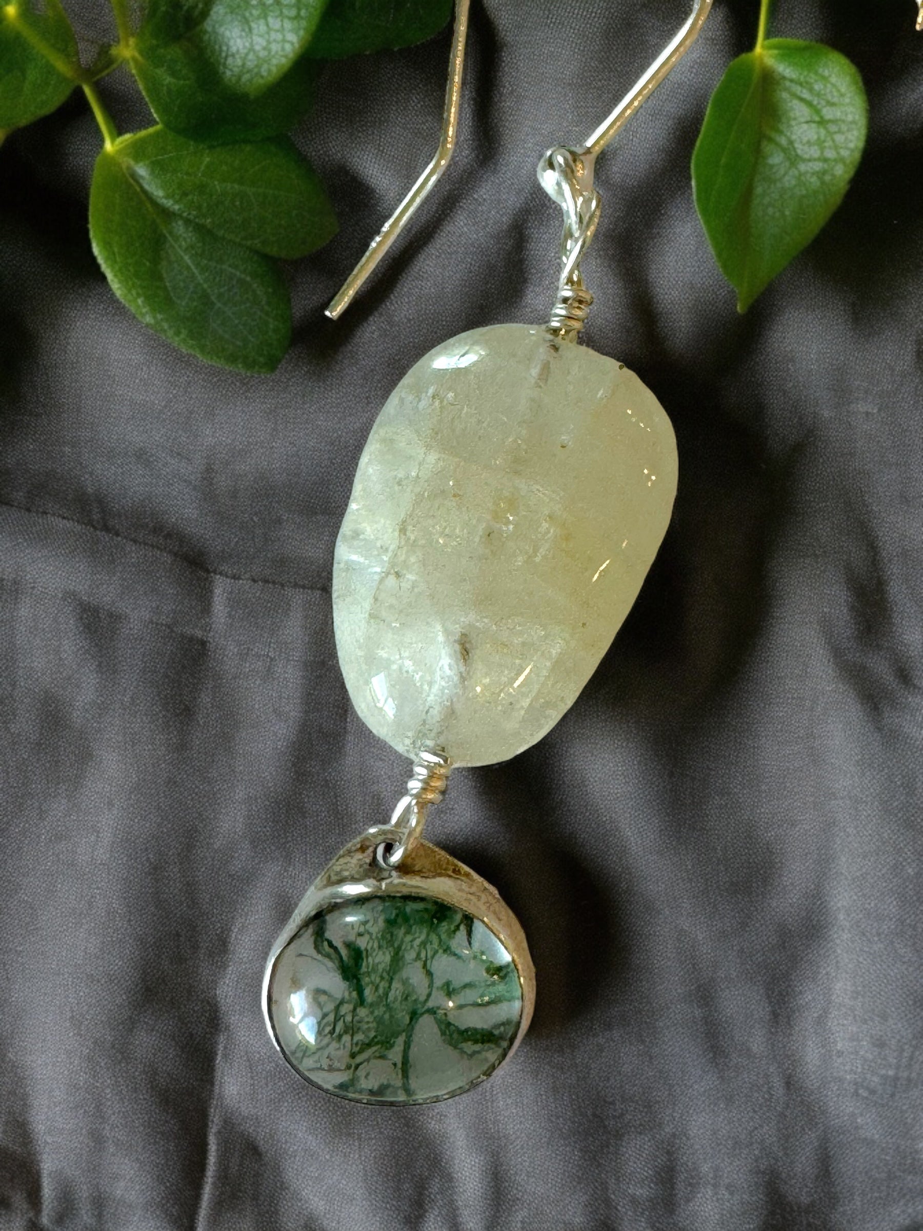 Coordinating but not perfectly matched, aquamarine nuggets dangle from sterling silver ear wires with a ring and bead. Below, two coordinating moss agates are set in open sterling silver bezels.