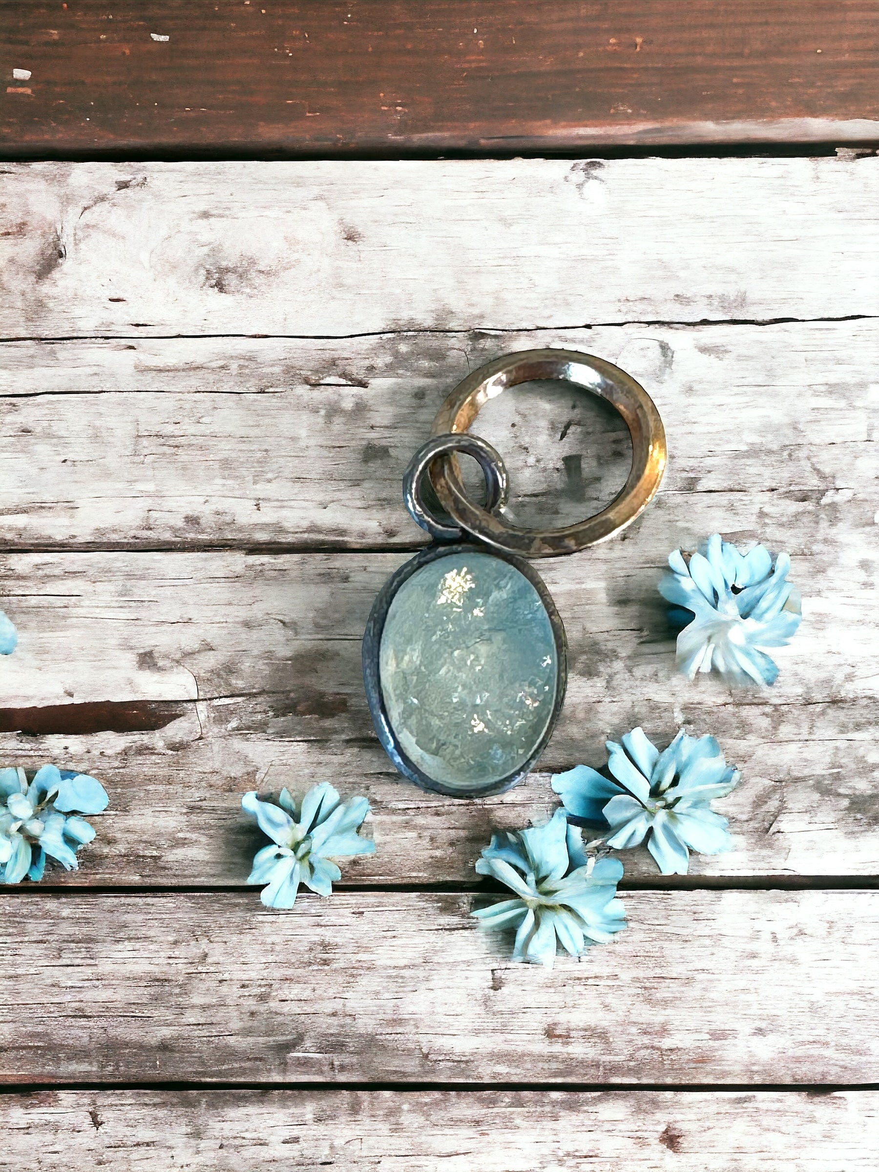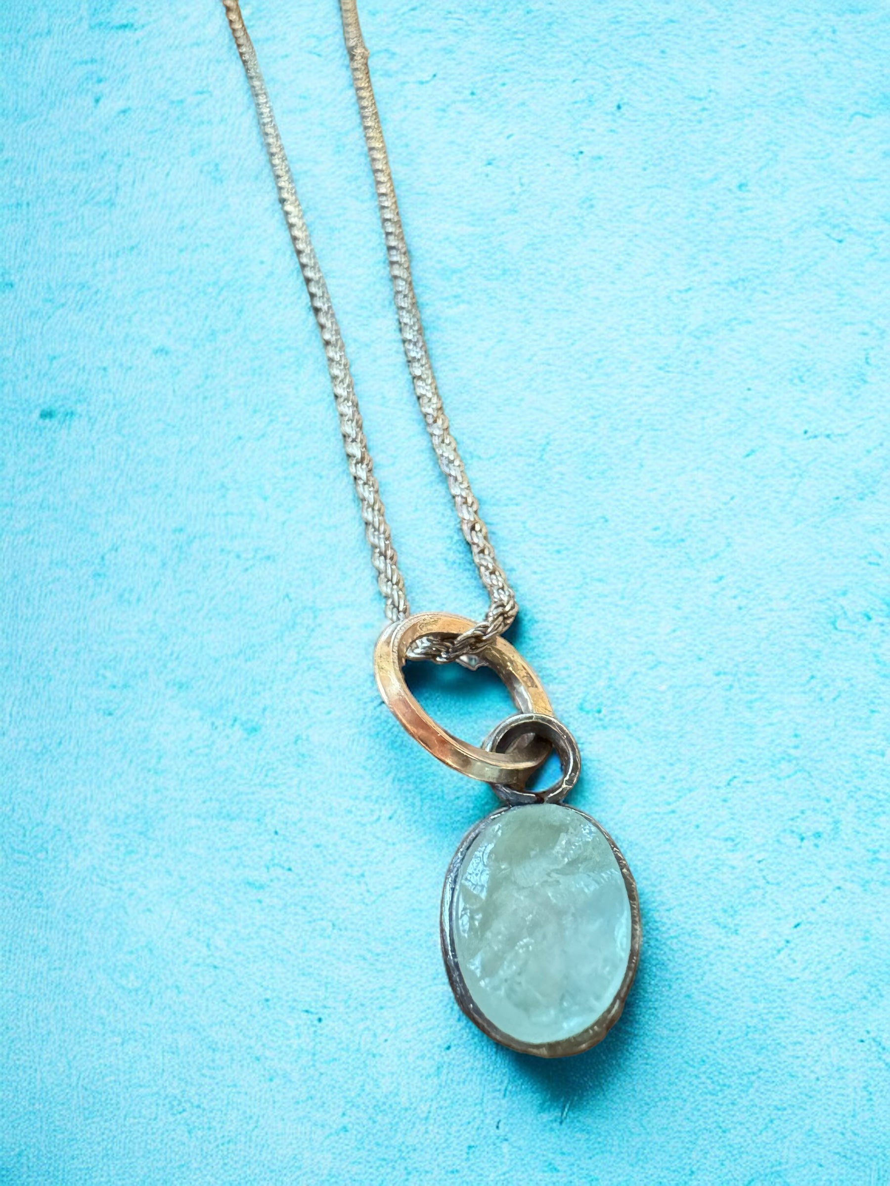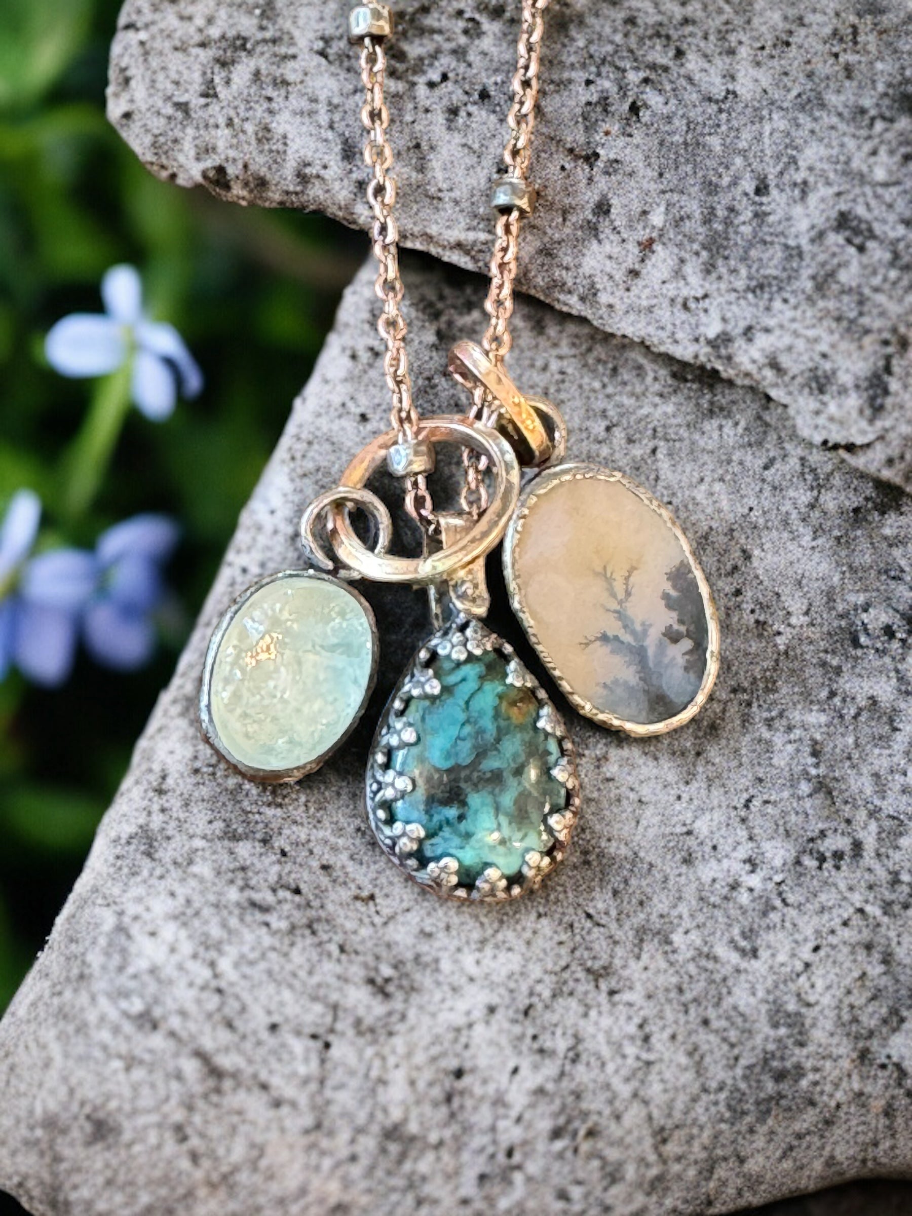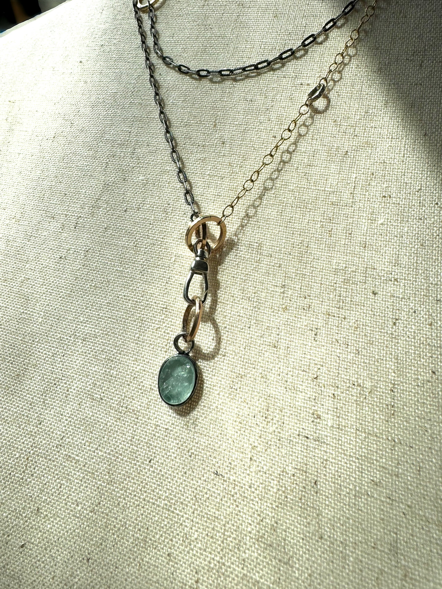 This Aquamarine slice set in sterling silver with a rose gold ring bail, adds a subtle hint of blue to any outfit. Displayed on the included oxidized silver rope chain in the second and third photo. All other charms and chains featured in the photos are available for purchase separately.