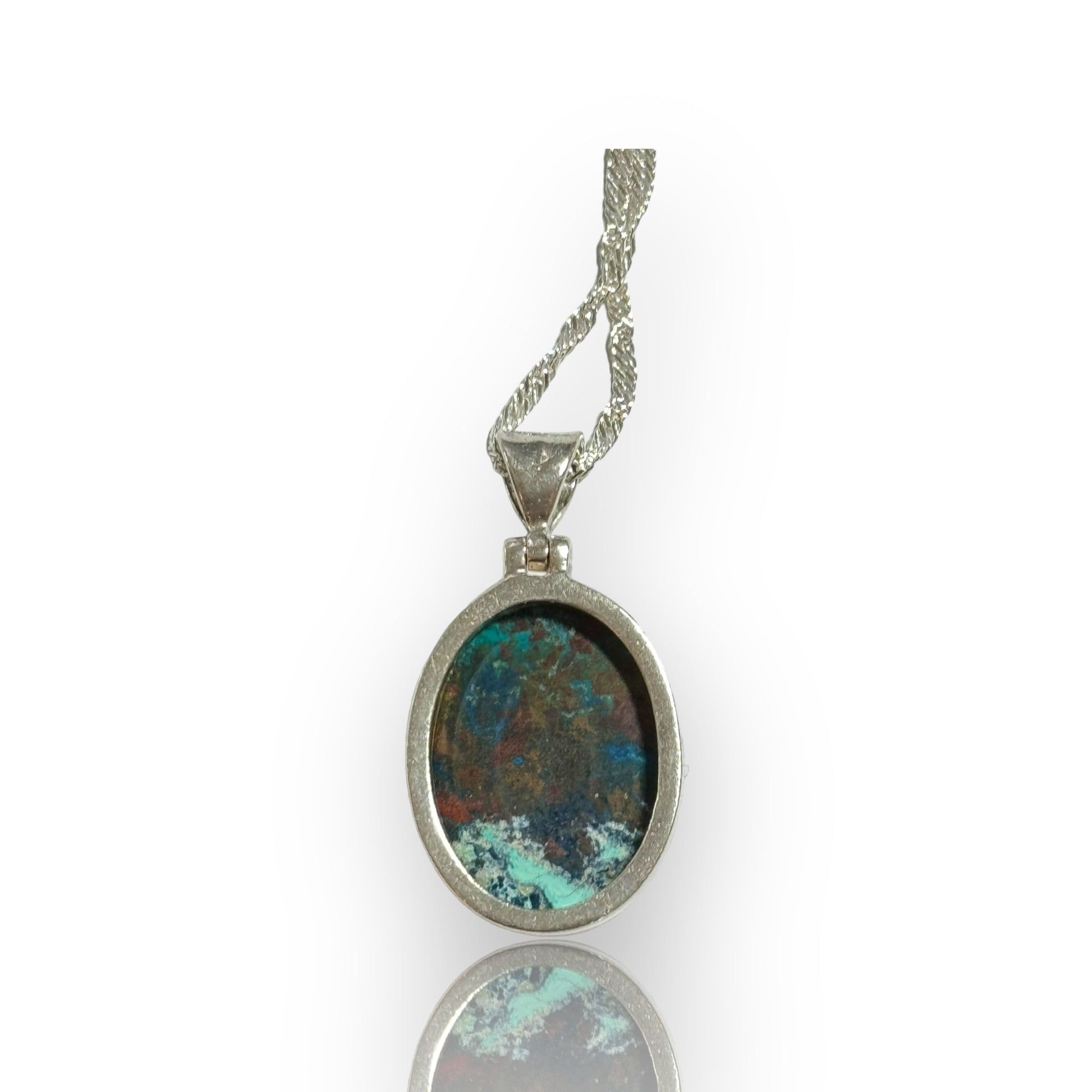 Azurite, Malachite and Chrysocolla Pendant In an open backed sterling silver bezel setting. The design of the bezel setting, which exposes the back of the stone, allows the Azurite, Malachite and Chrysocolla to touch the skin, promoting emotional stability and inner peace.