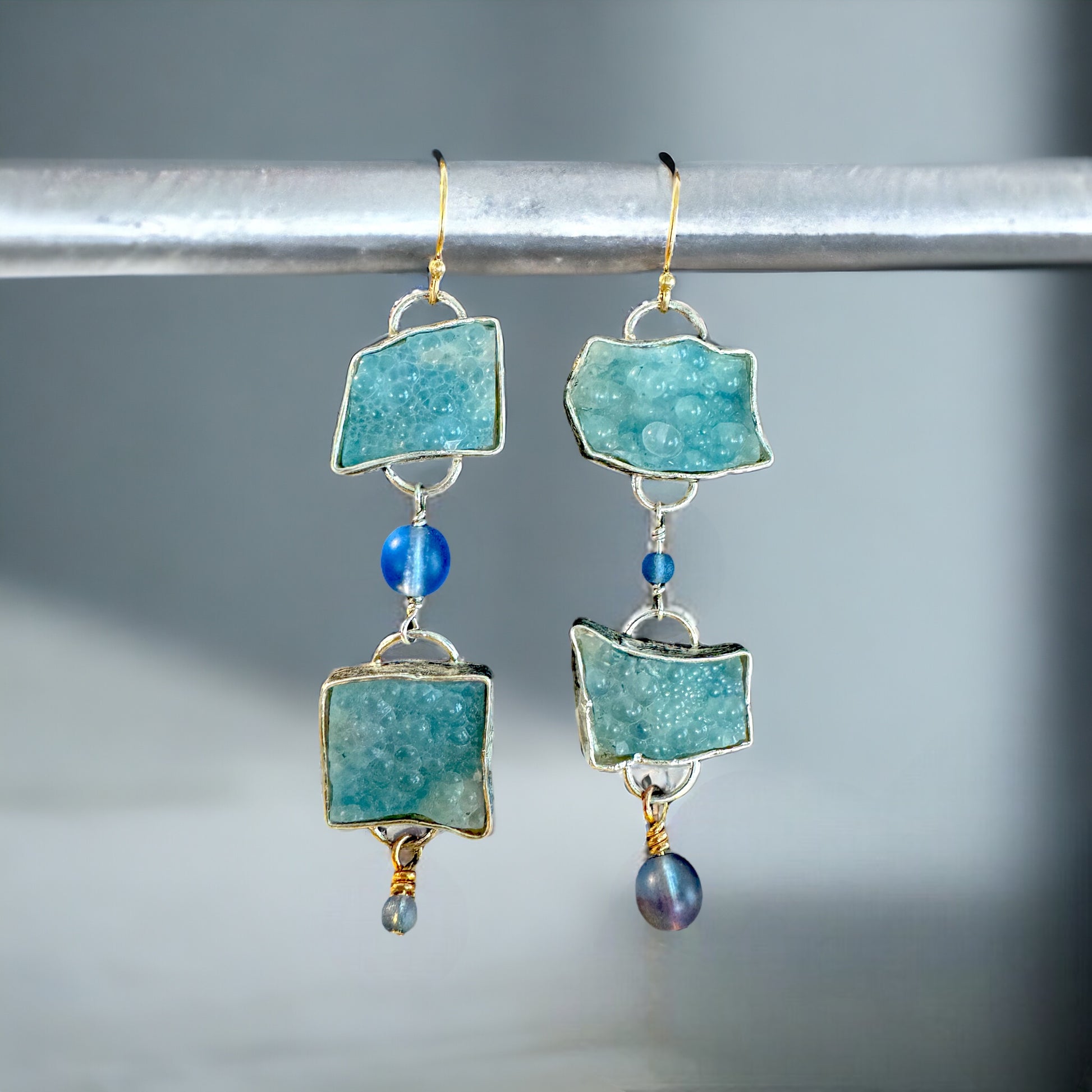 Sterling silver bezels hold rough, botryoidal agate in this beach-inspired set of drops. The stones are complemented by sterling silver and 14k gold-filled wire, as well as opalite beads. Wear these drops on 14k gold ear wires for a stunning seaside look.