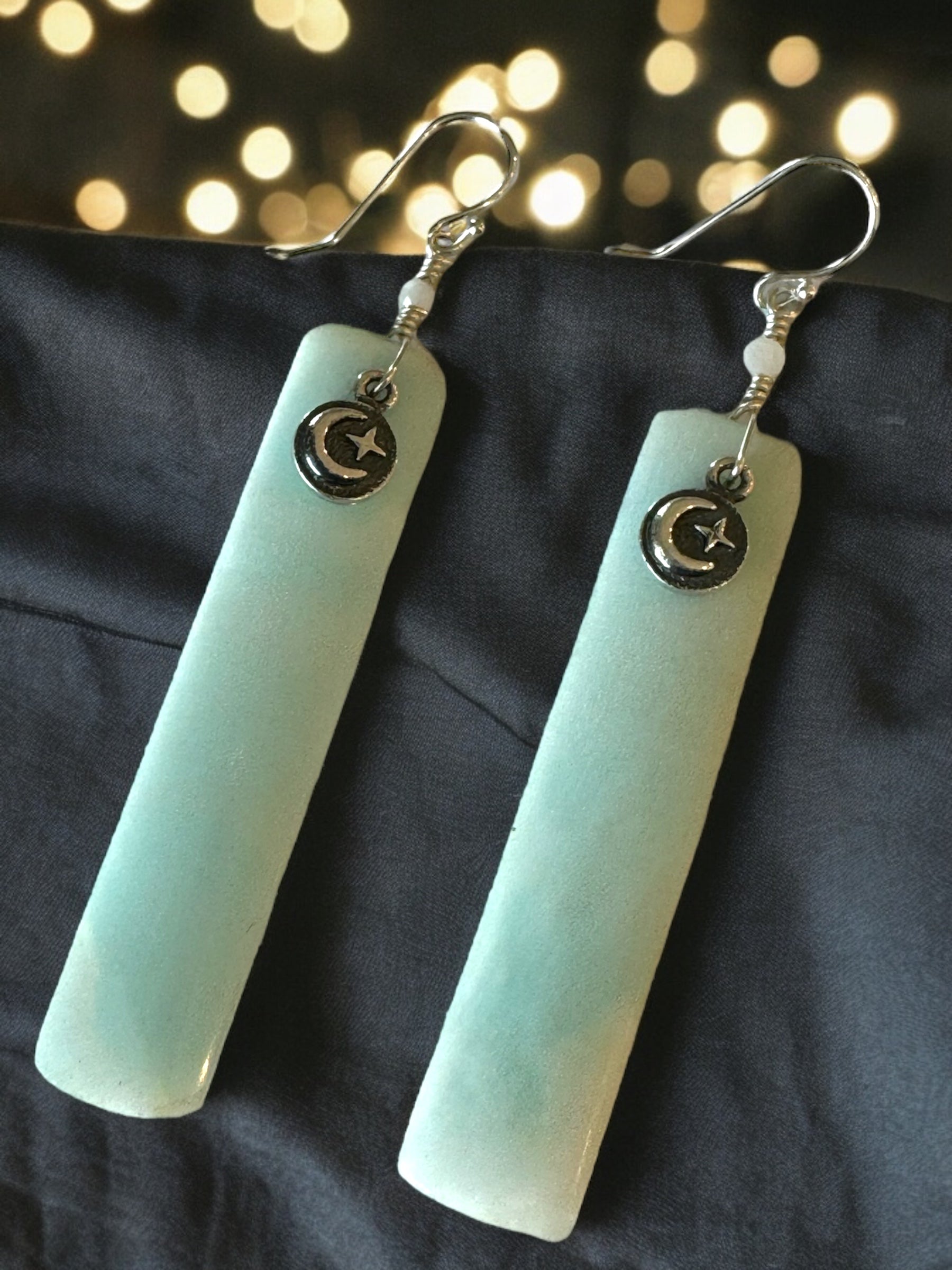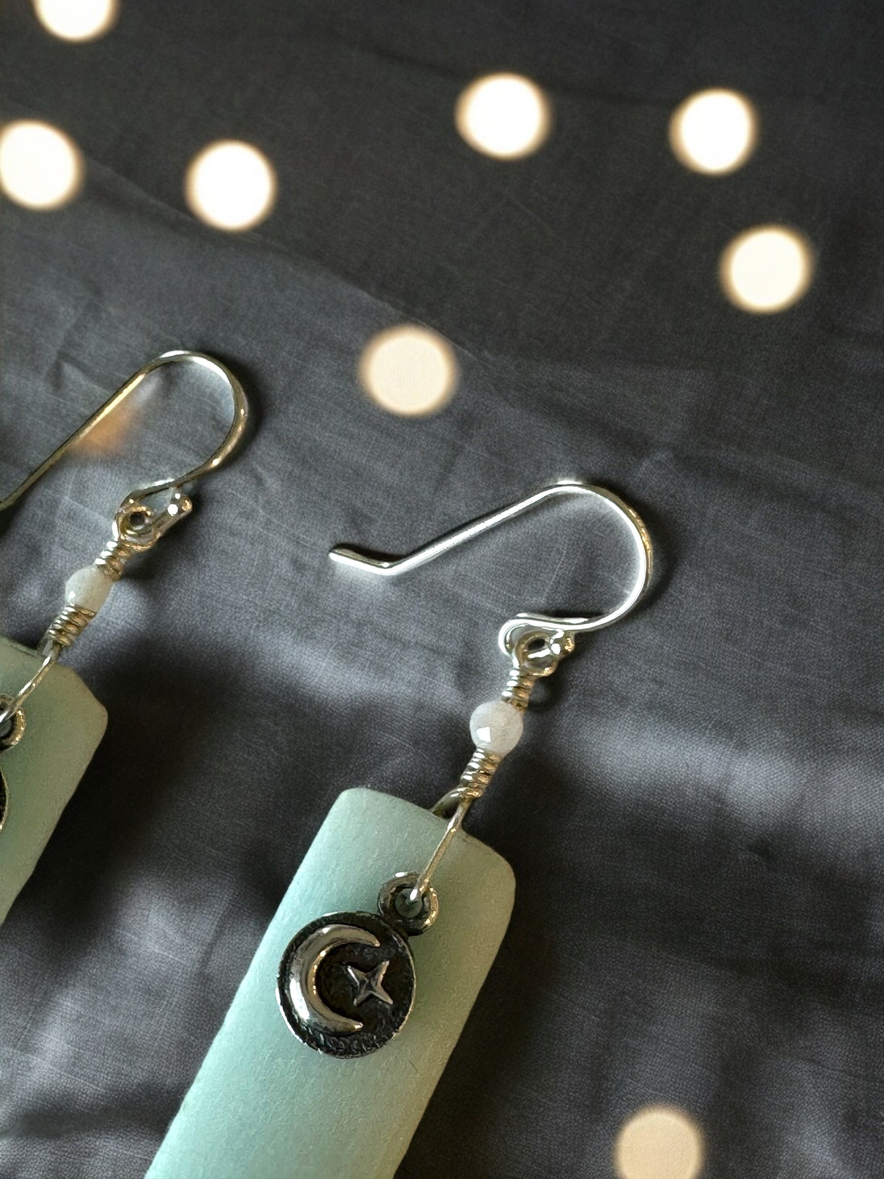 Amazonite slices adorned with small sterling silver moon and star charms suspended by wire-wrapped moonstone beads on sterling silver ear wires.