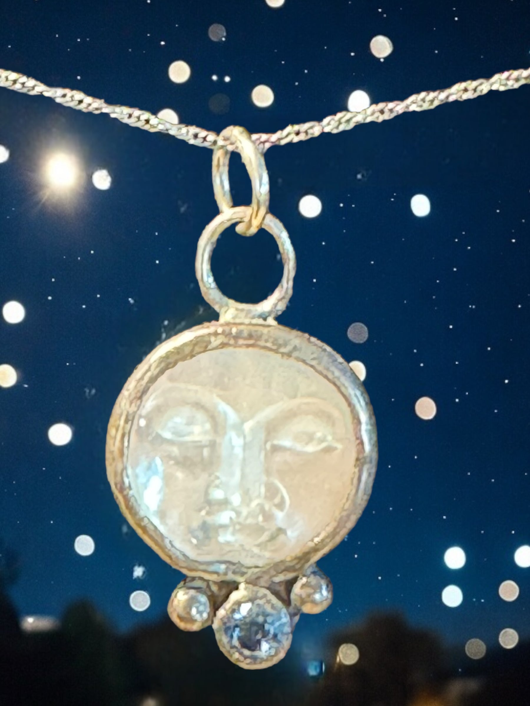 This pendant features a stunningly carved mother of pearl moon-face set above a round blue topaz, elegantly encased in high-quality sterling silver. The reverse features a North Star motif.