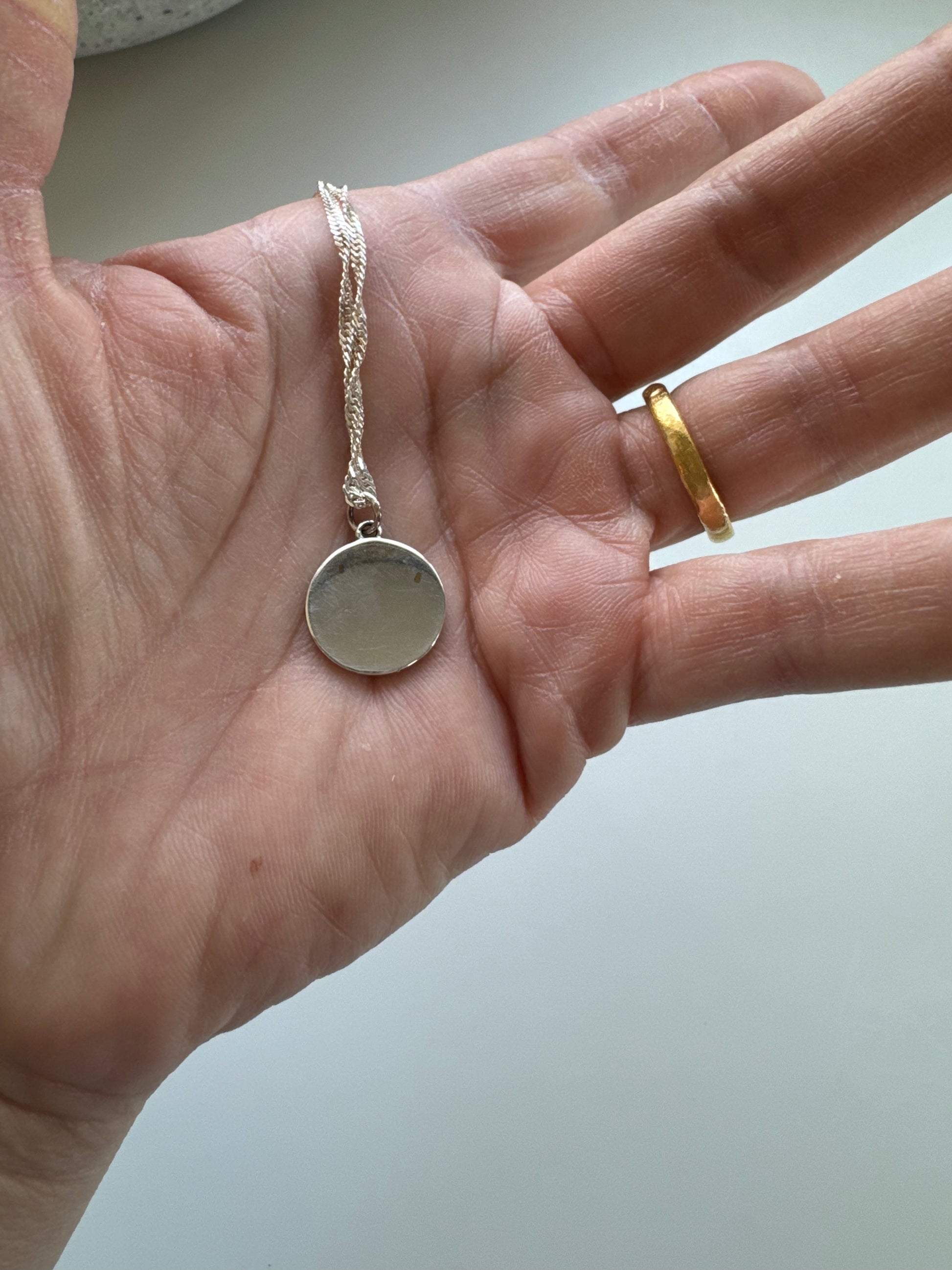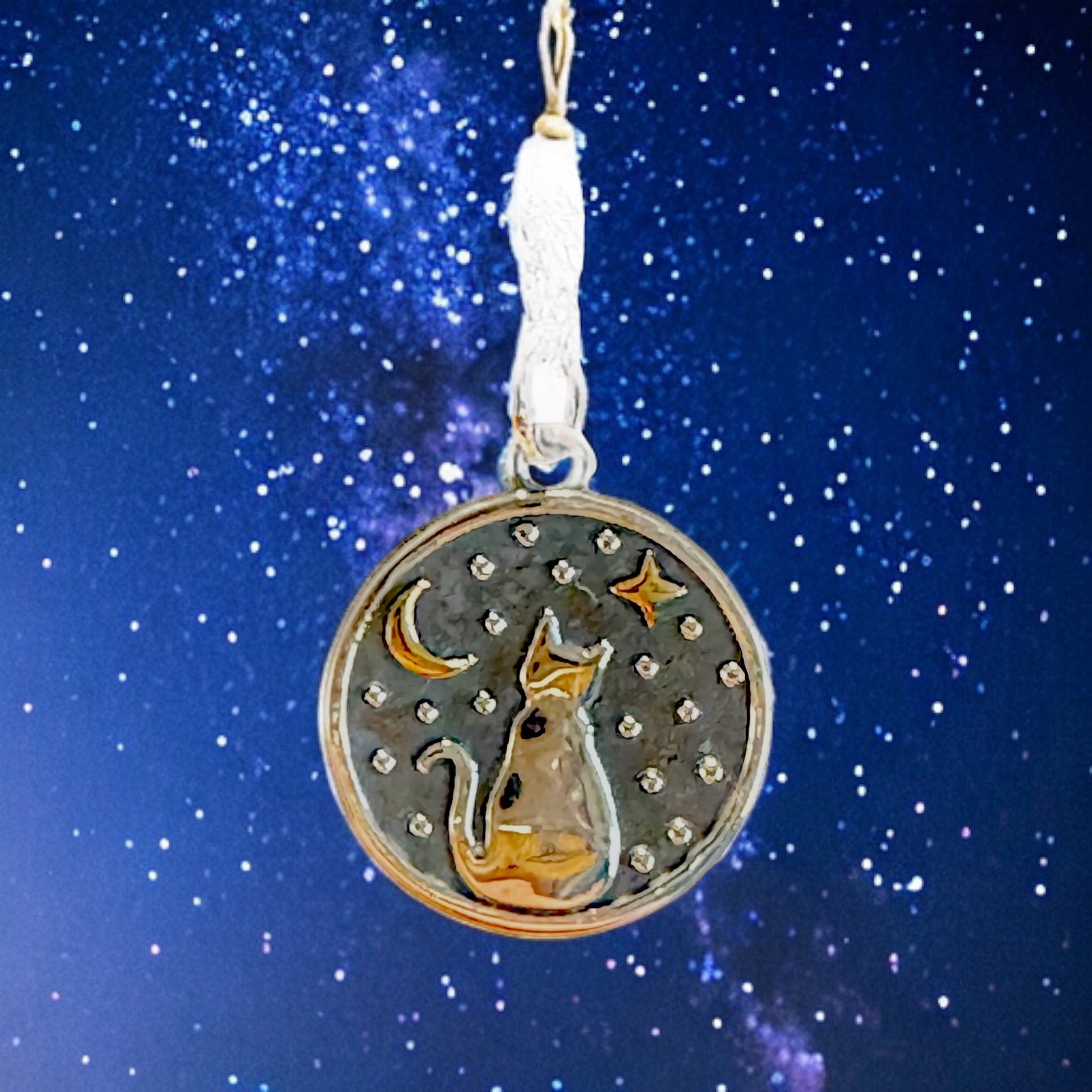This Celestial Pet Charm features a cat or dog silhouetted against a starry sky on a stunning bronze and silver background. Engrave the plain silver back for a personalized touch.