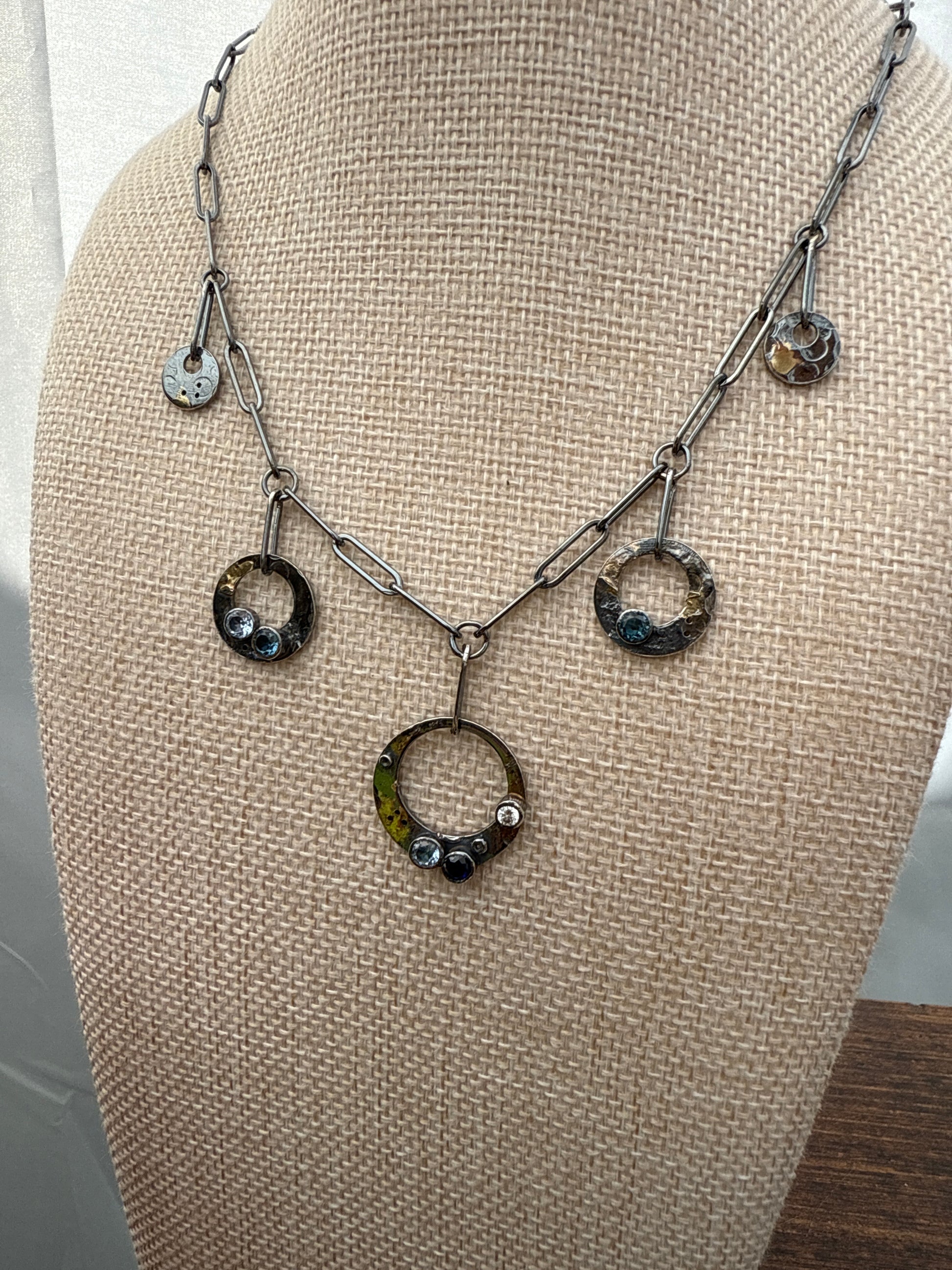 18” Sterling silver with blue and white sapphires, aquamarines, and topaz. Accented with 18 karat gold Keum-boo.