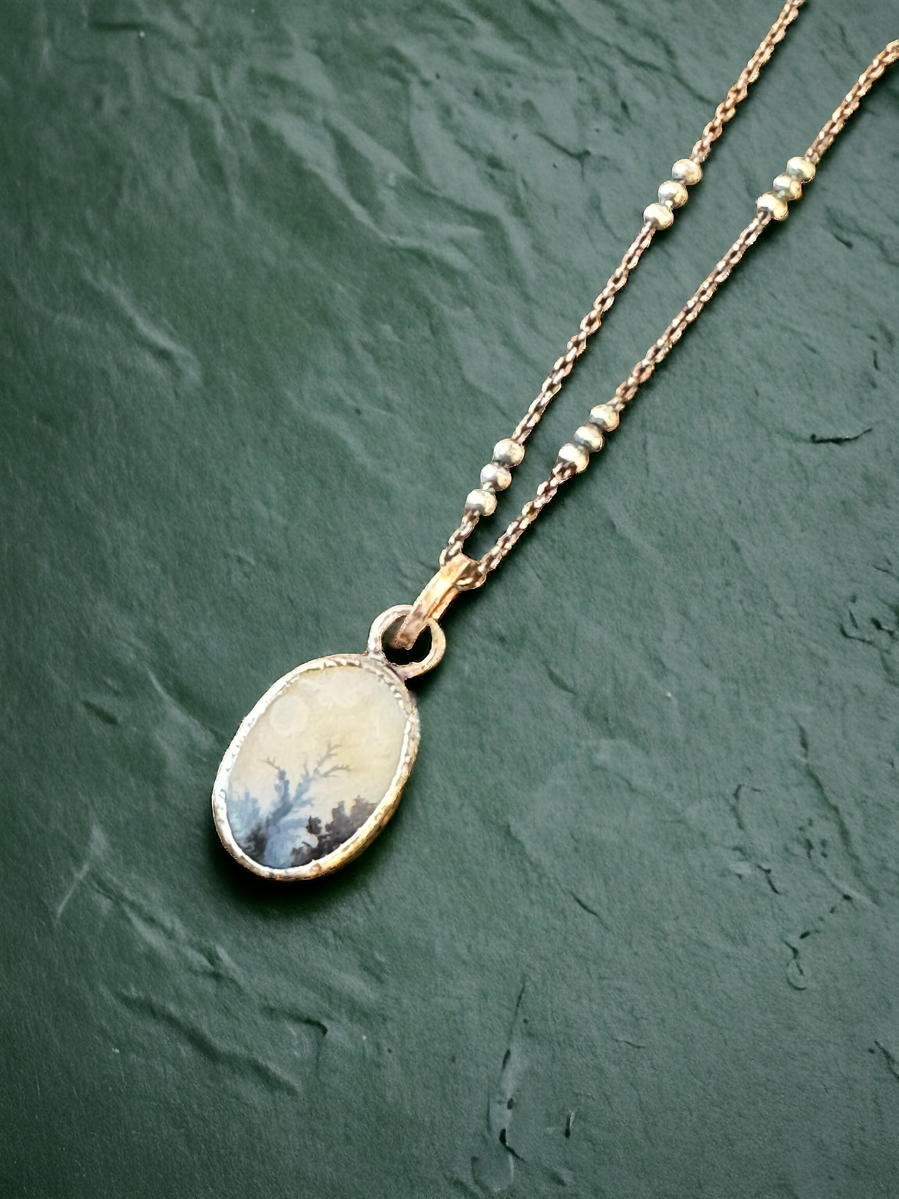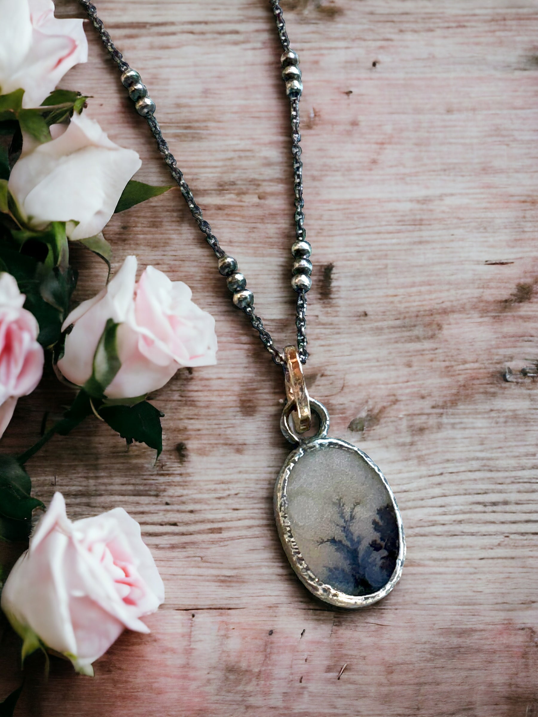 This petite oval pendant showcases a stunning dendritic agate in oxidized silver, completed with a 14k rose-gold bail. The oxidized beaded chain shown is included. Other styles may be purchased separately.