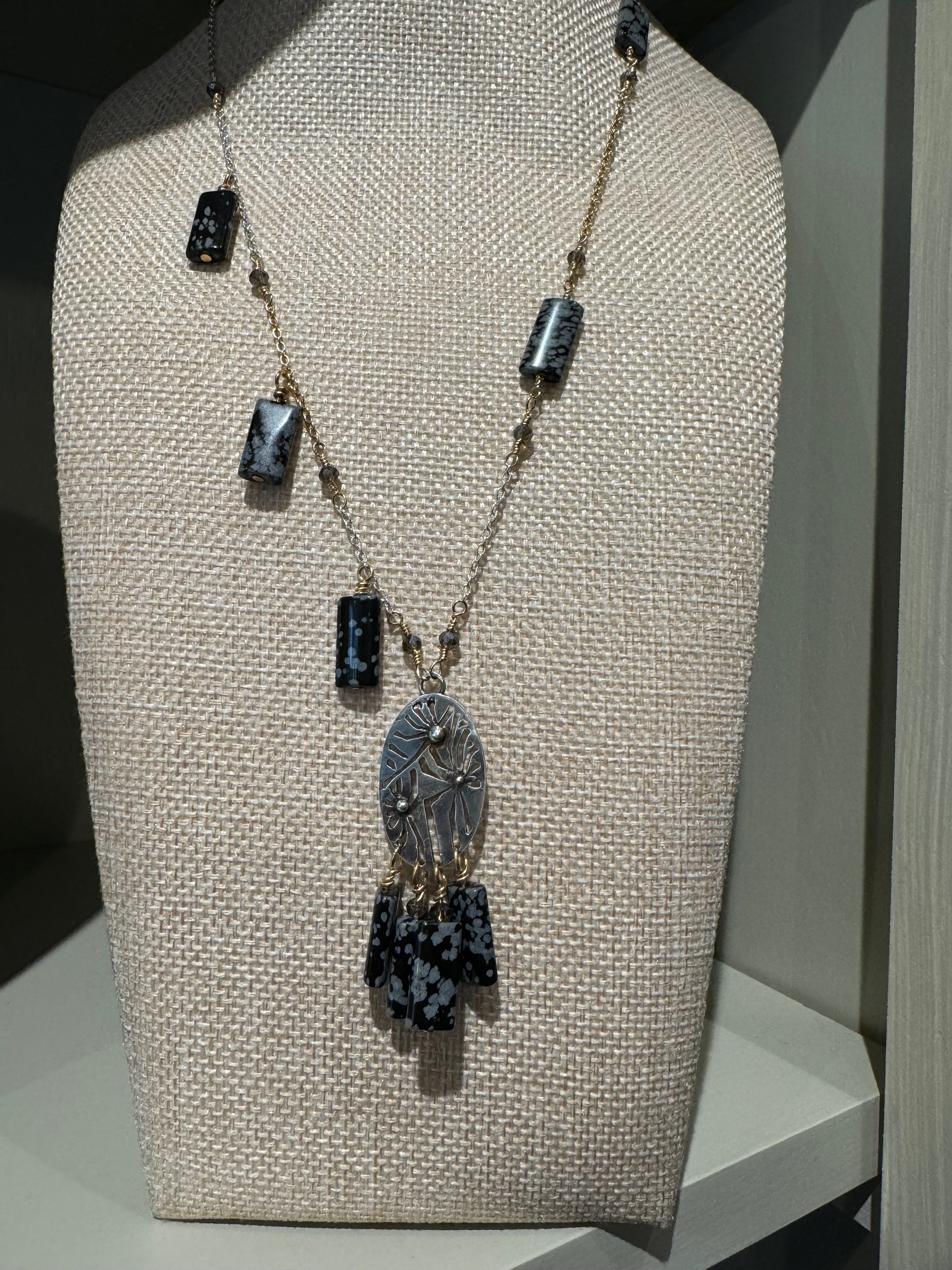 Dandelion Necklace with Gold Accents and Snowflake Obsidian