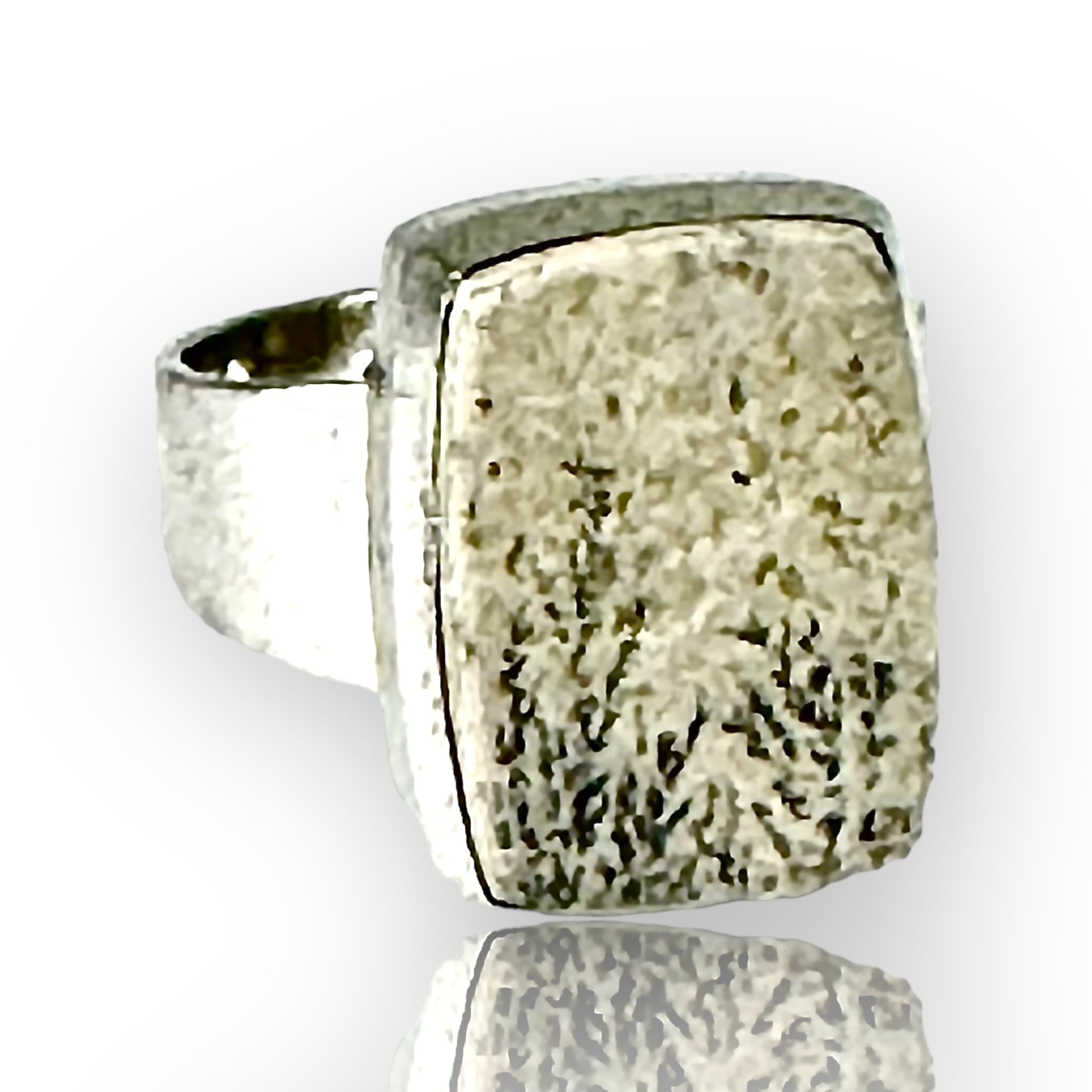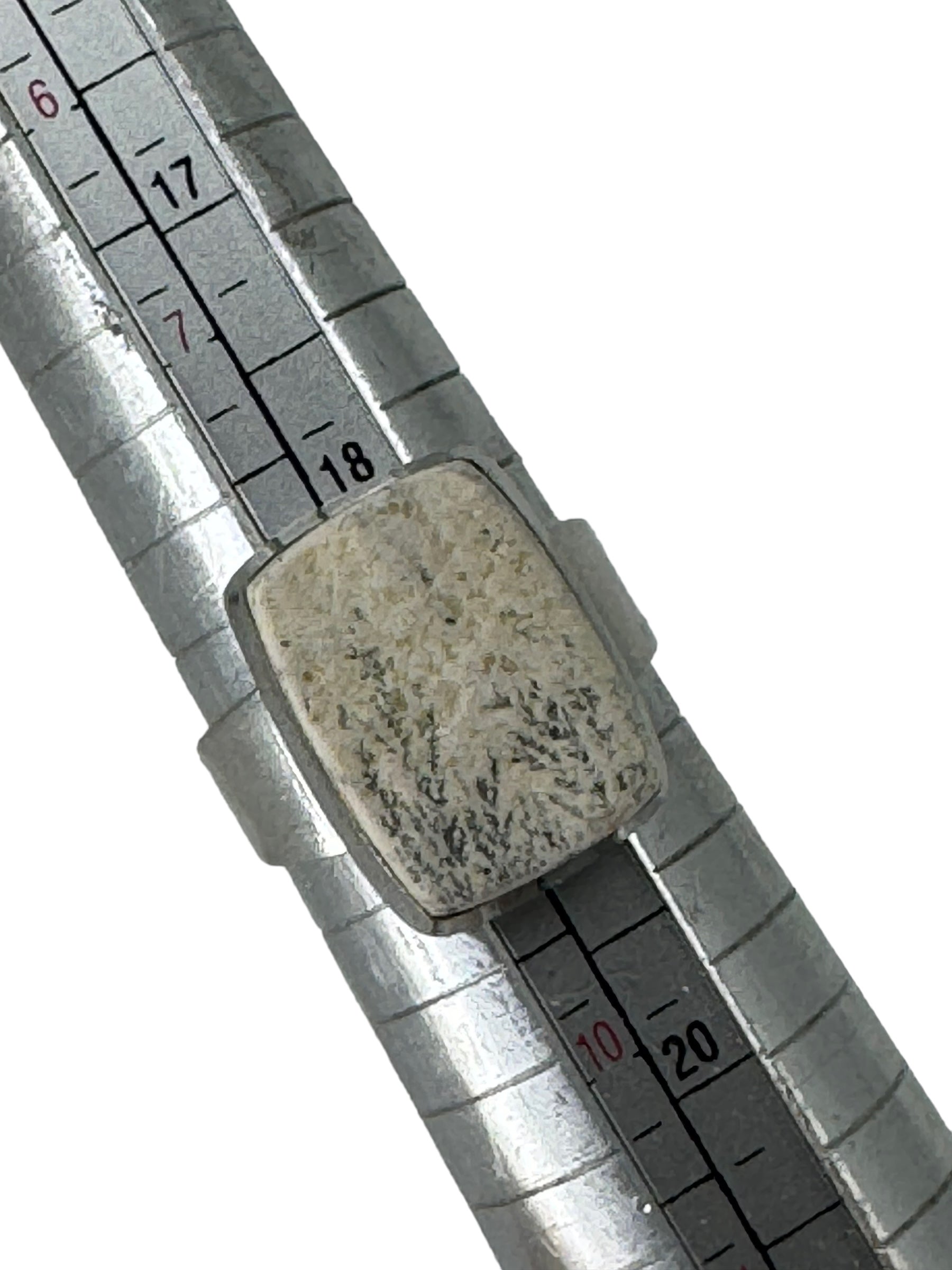Dendrites adorn the face of this stone set in a chunky sterling silver ring. US size 8.5.