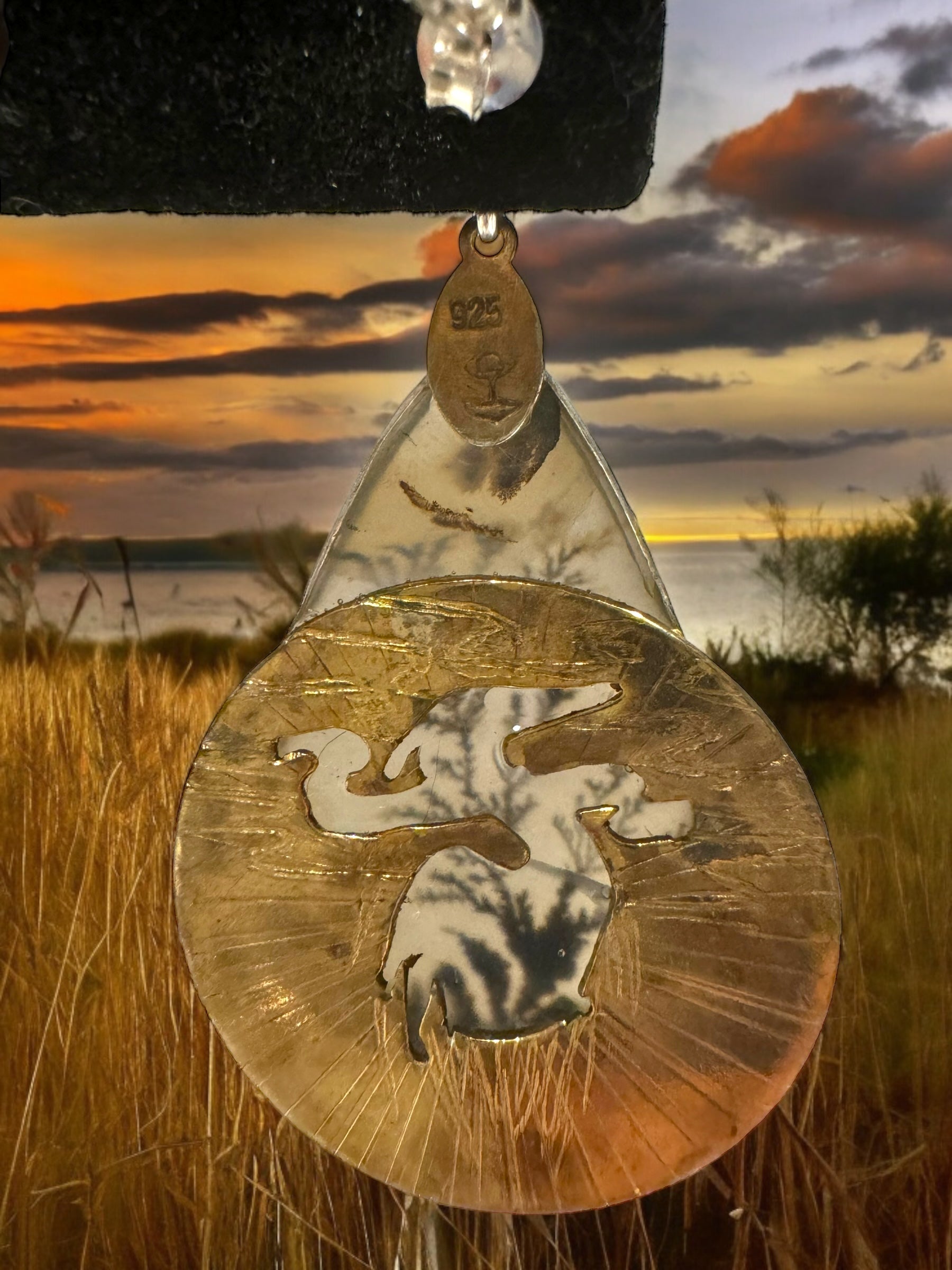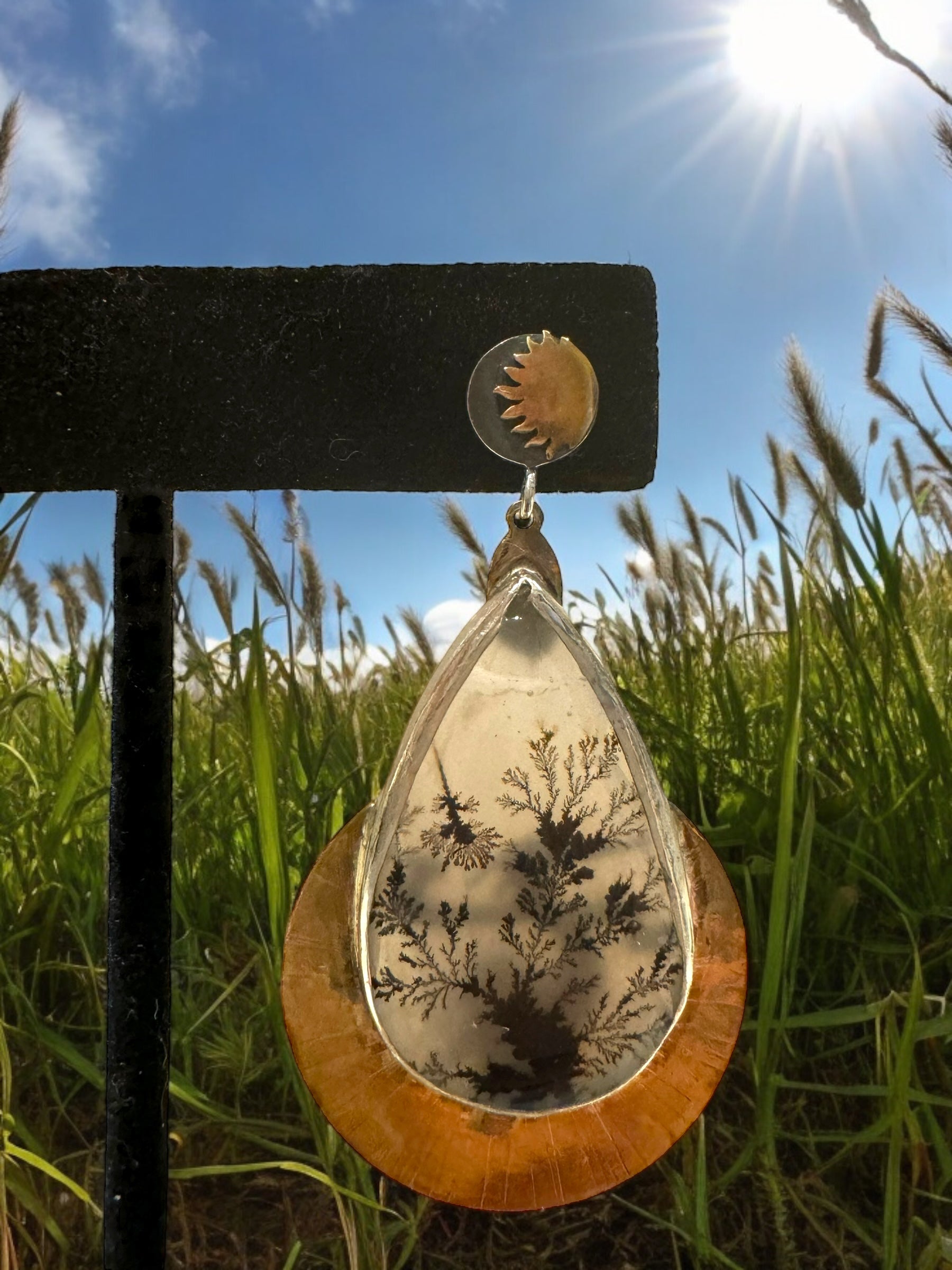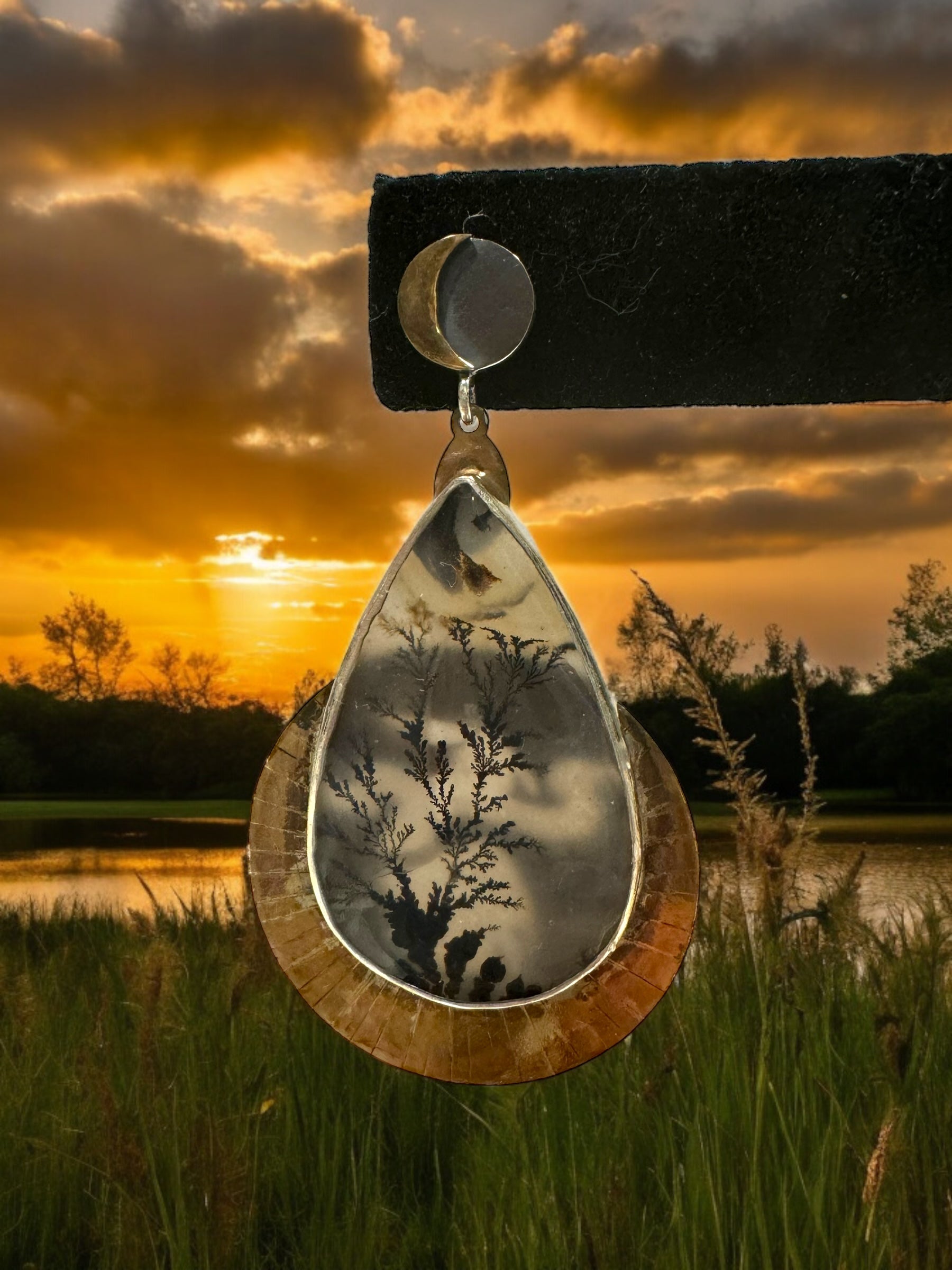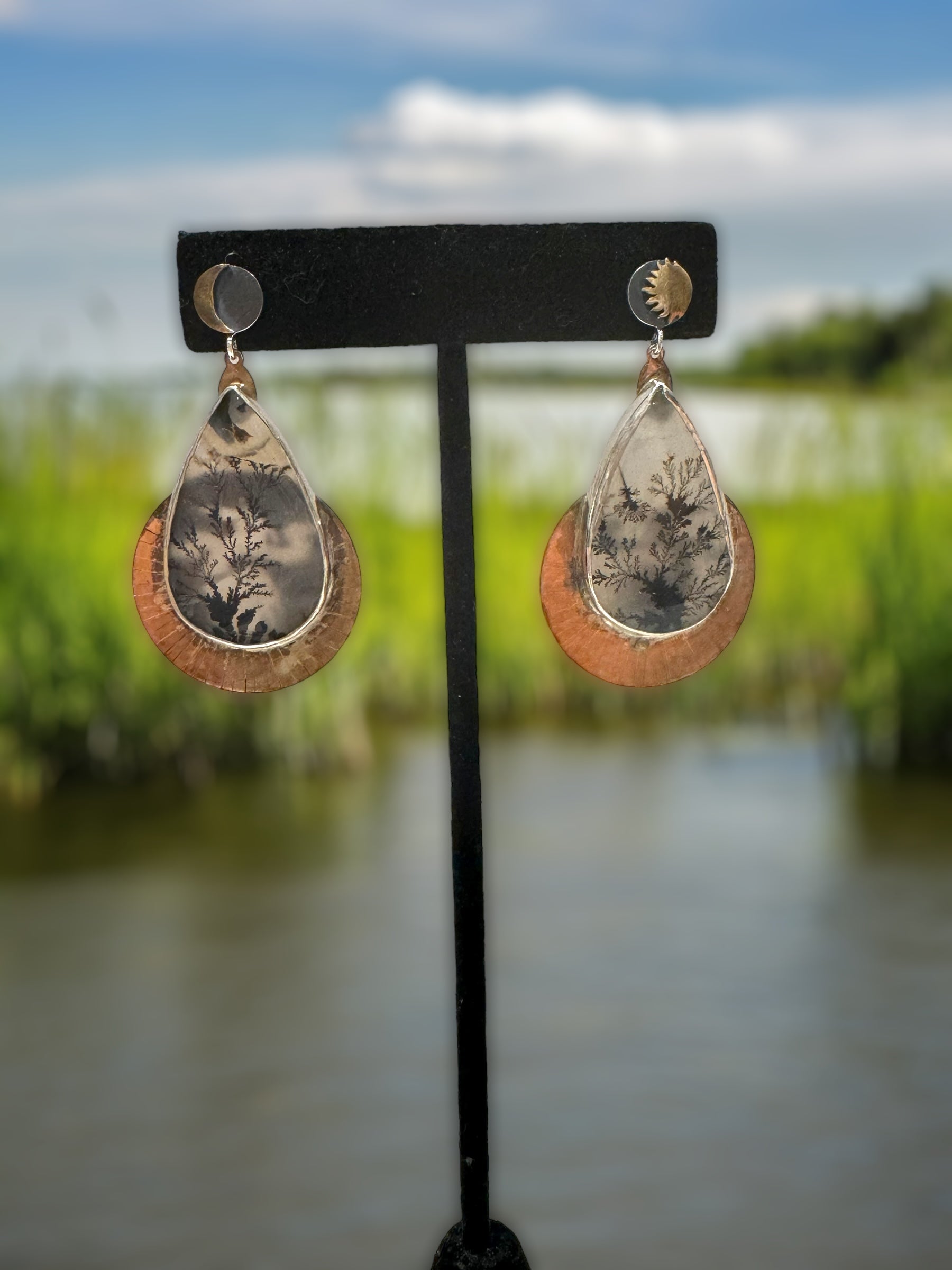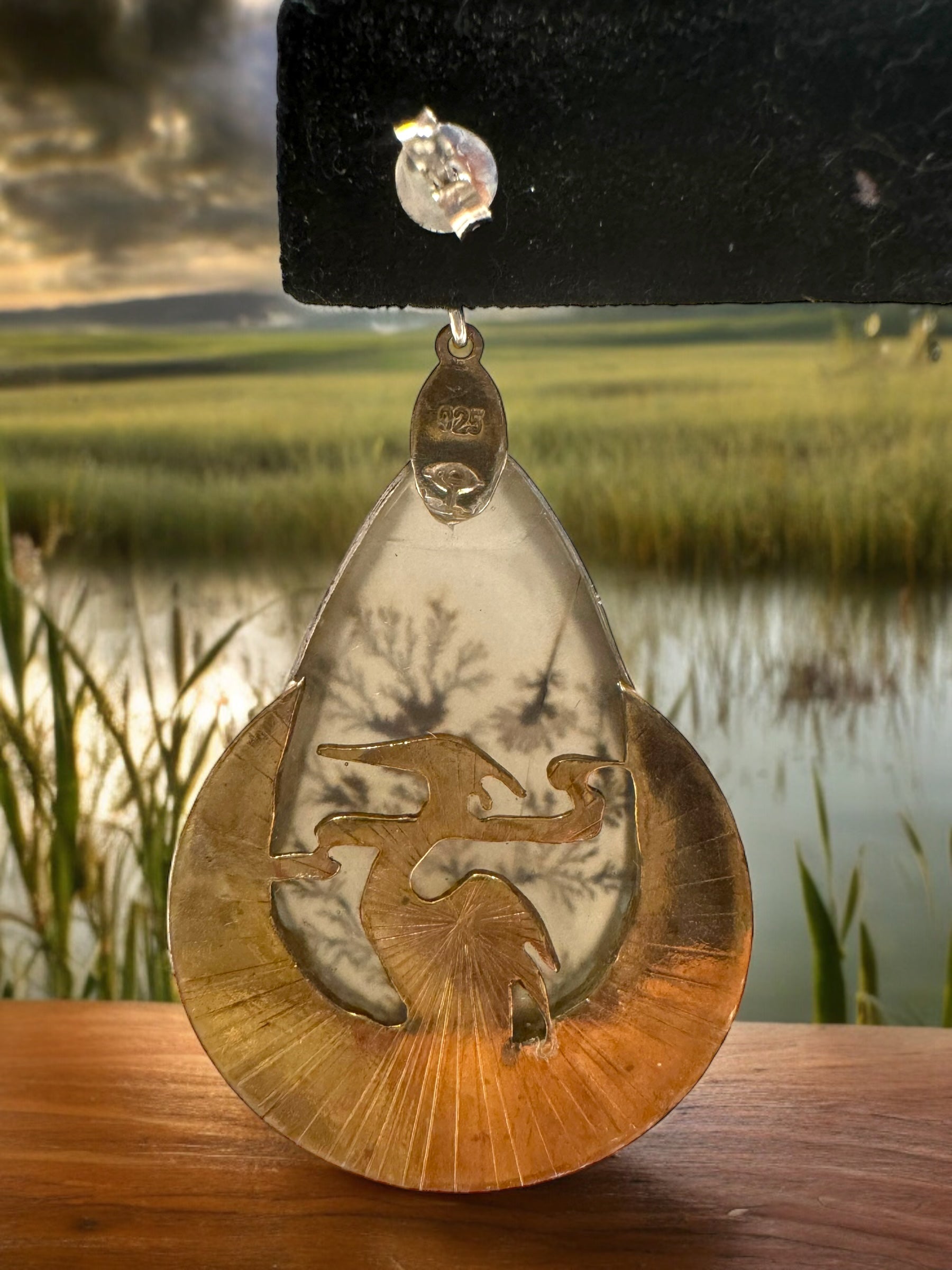 Sterling silver and 24k gold plated bronze with a beautifully matched pair of dendritic agates, one of which features a natural “moon“ inclusion. The mismatched posts feature a sun and a moon. The reverse has a cut out of herons. One is in shadow in the sun, the other is glowing in the light of the moon!