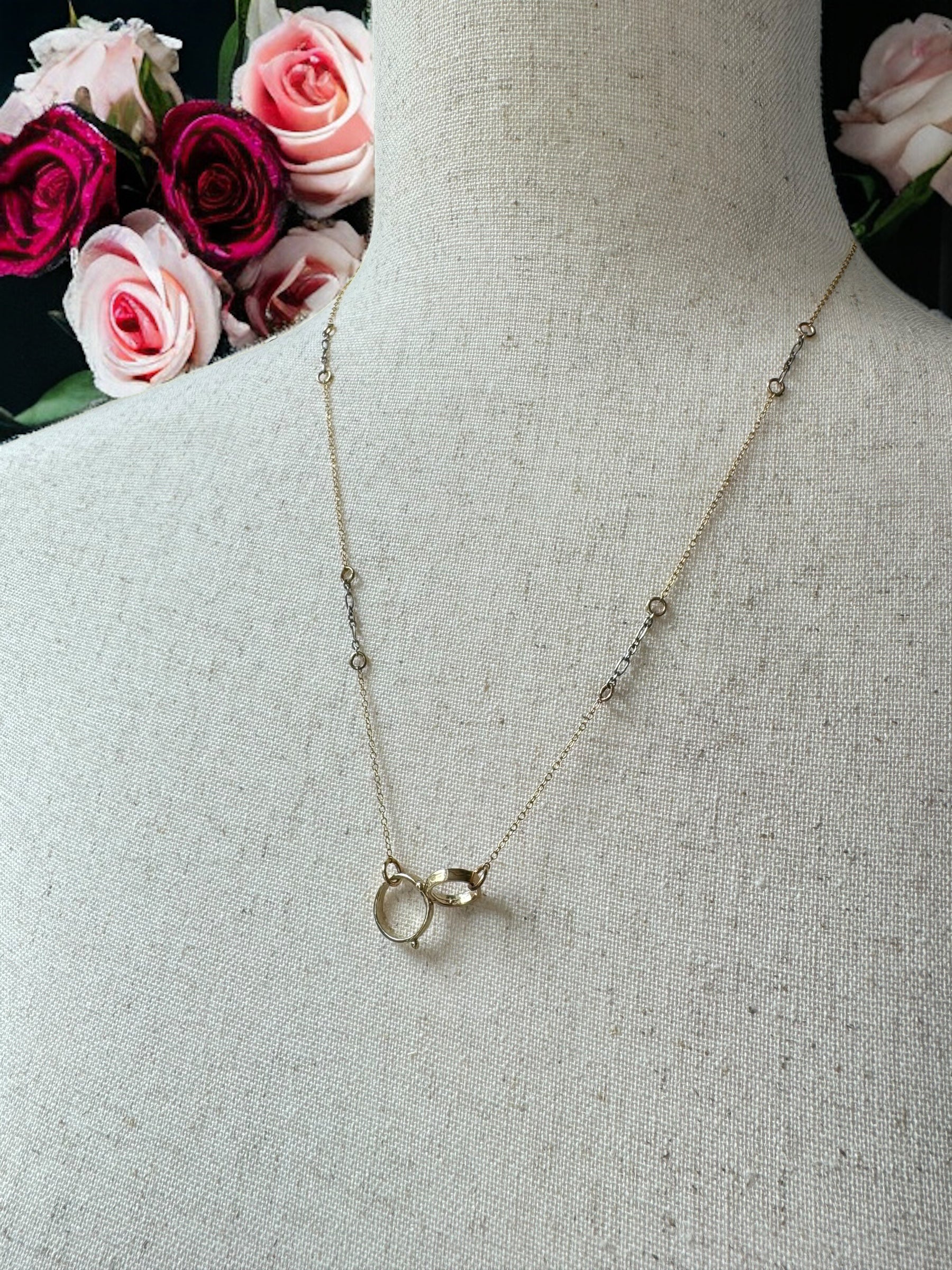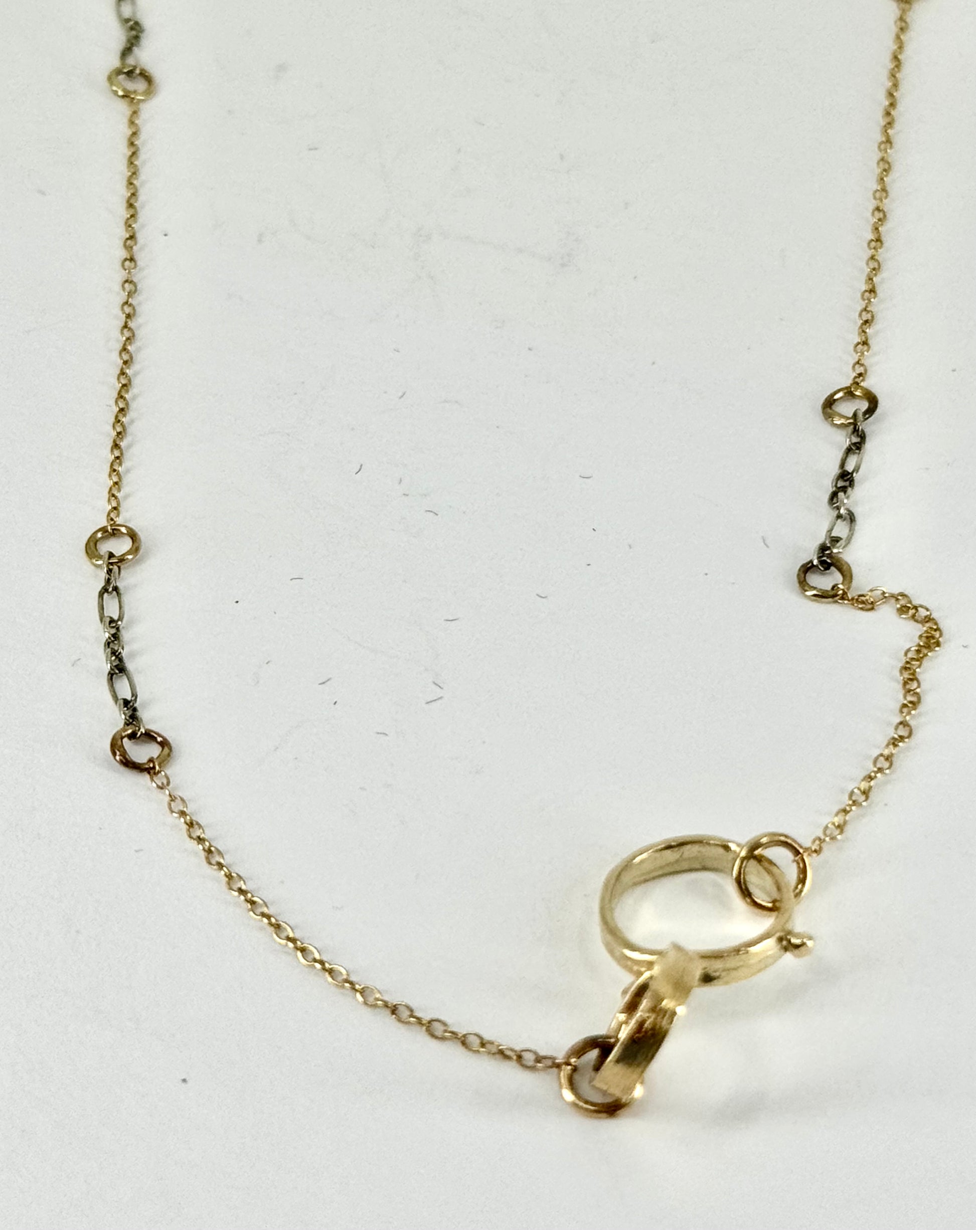 Indulge in ultimate luxury with our Double Link Gold Necklace. Hand-carved and cast in 14k gold, the centerpiece boasts a unique double link design. The custom chain in oxidized silver and 14k gold adds an extra touch of elegance. Elevate any outfit with this exquisite and sophisticated piece.