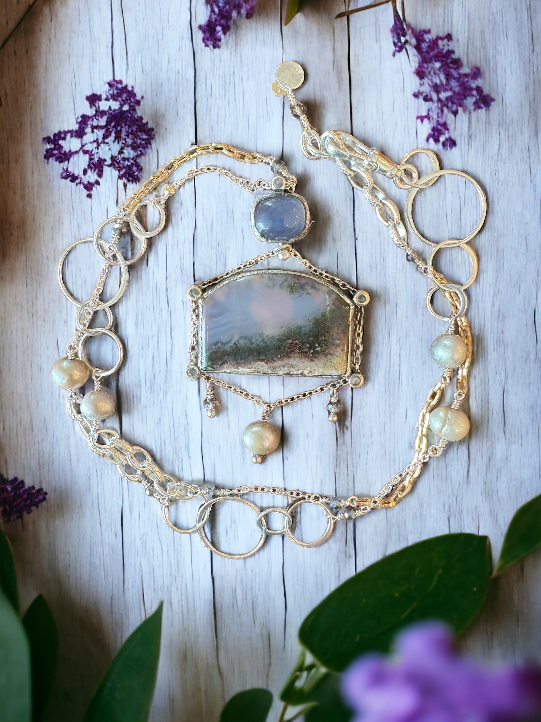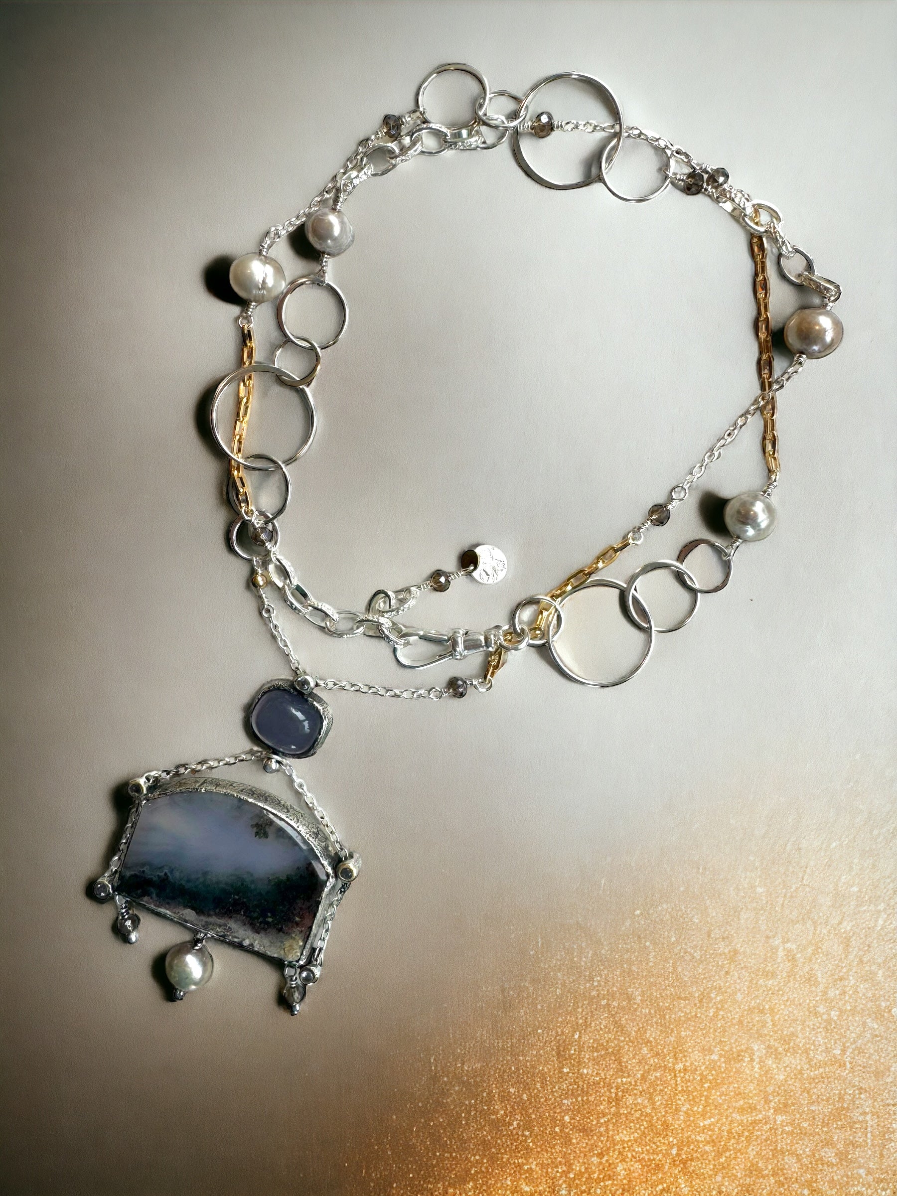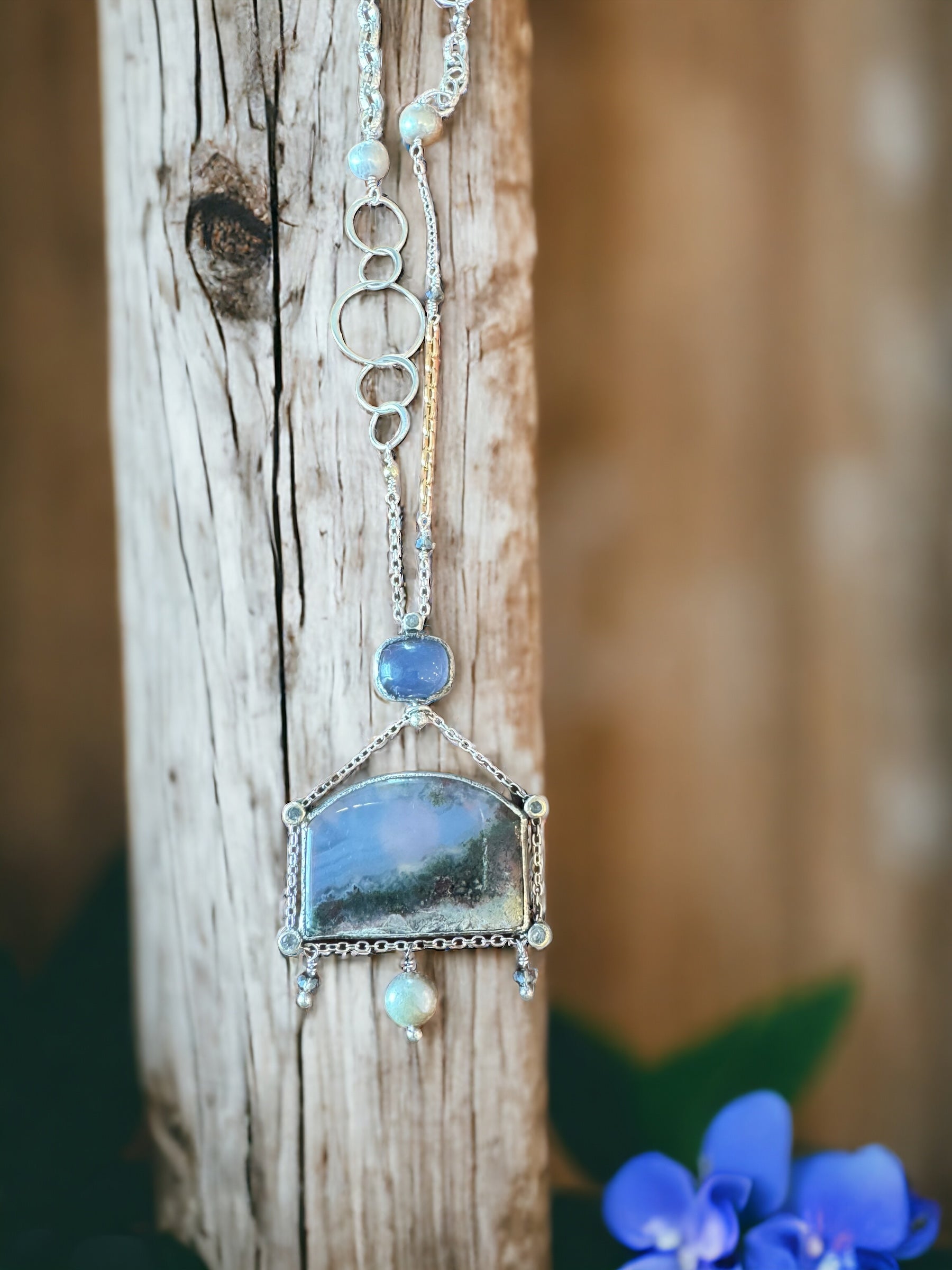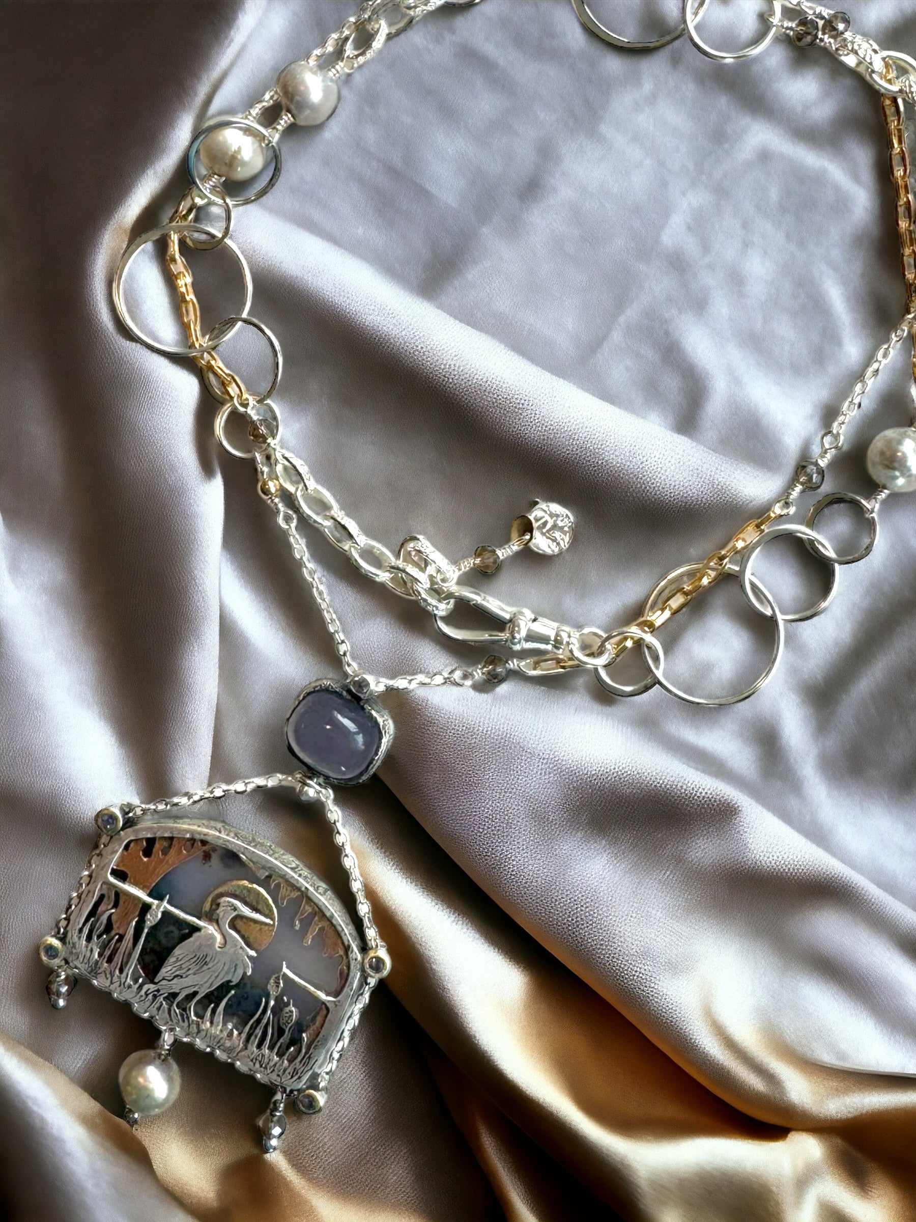 Crafted with a combination of gold, silver, and bronze, this stunning heron pendant features a focal stone of mossy agate and accents of Holley Blue chalcedony, tanzanites, labradorite, and grey pearls. Its adjustable length of 18” to 24” and signature mixed media style chain make it versatile for any occasion.