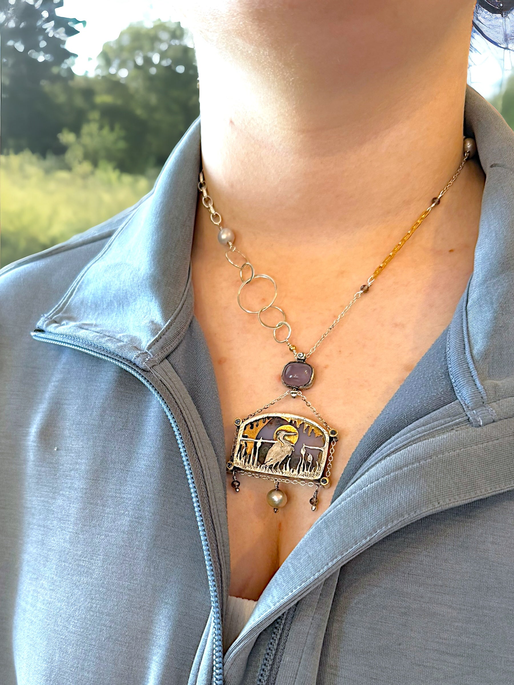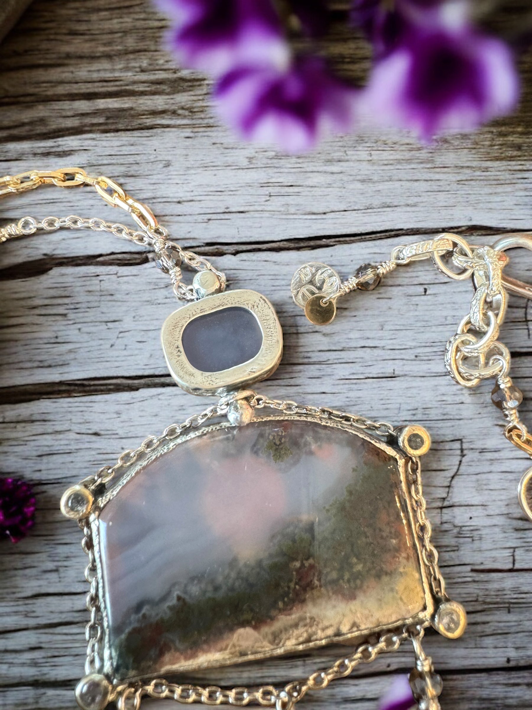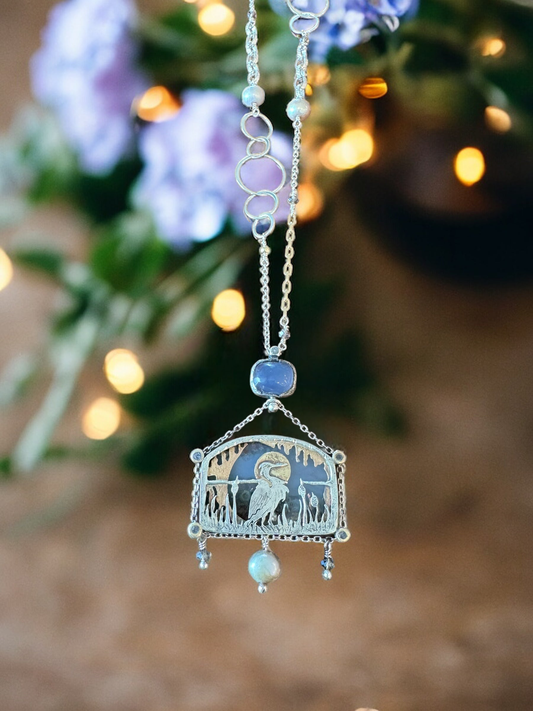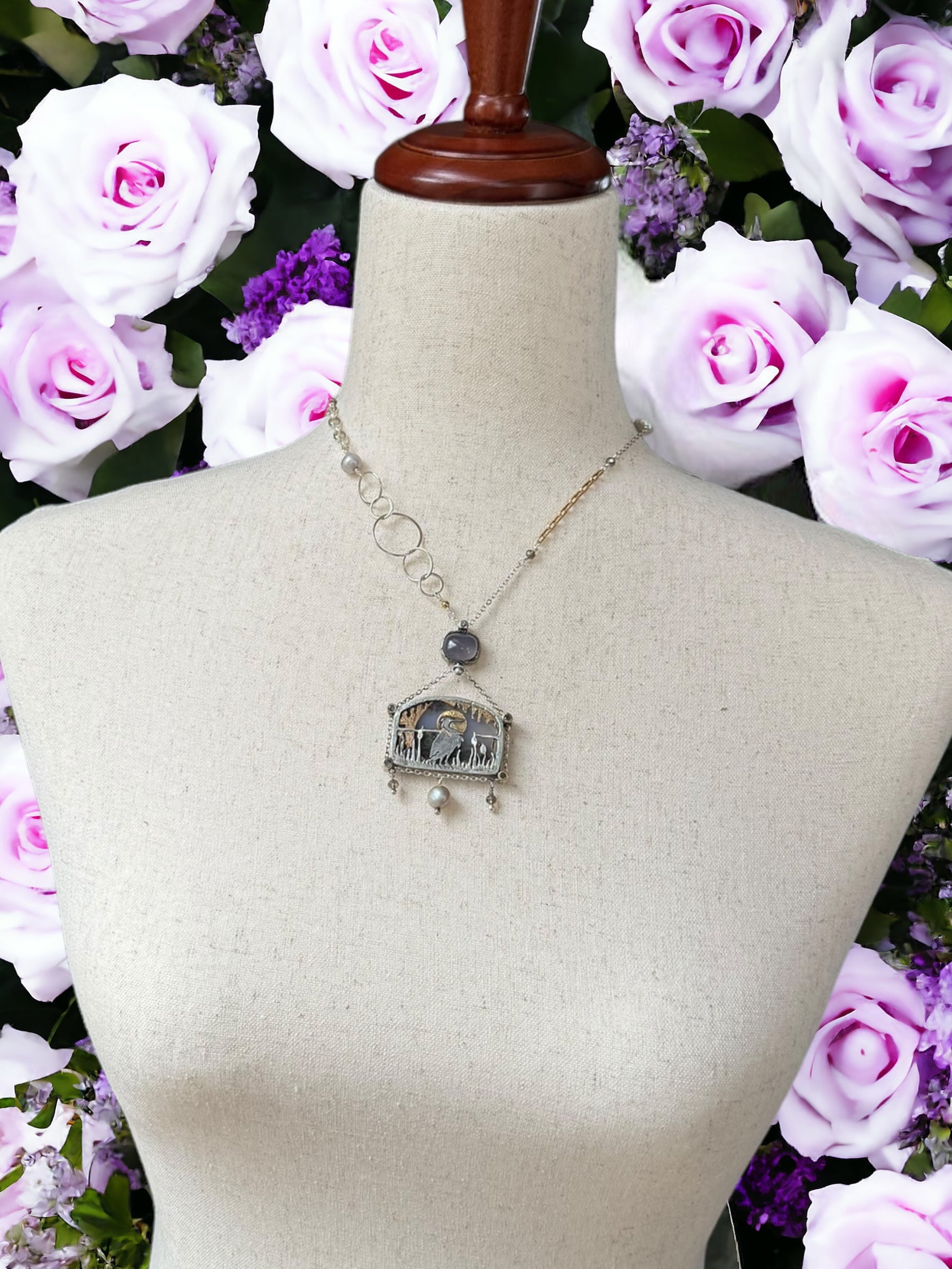 Crafted with a combination of gold, silver, and bronze, this stunning heron pendant features a focal stone of mossy agate and accents of Holley Blue chalcedony, tanzanites, labradorite, and grey pearls. Its adjustable length of 18” to 24” and signature mixed media style chain make it versatile for any occasion.