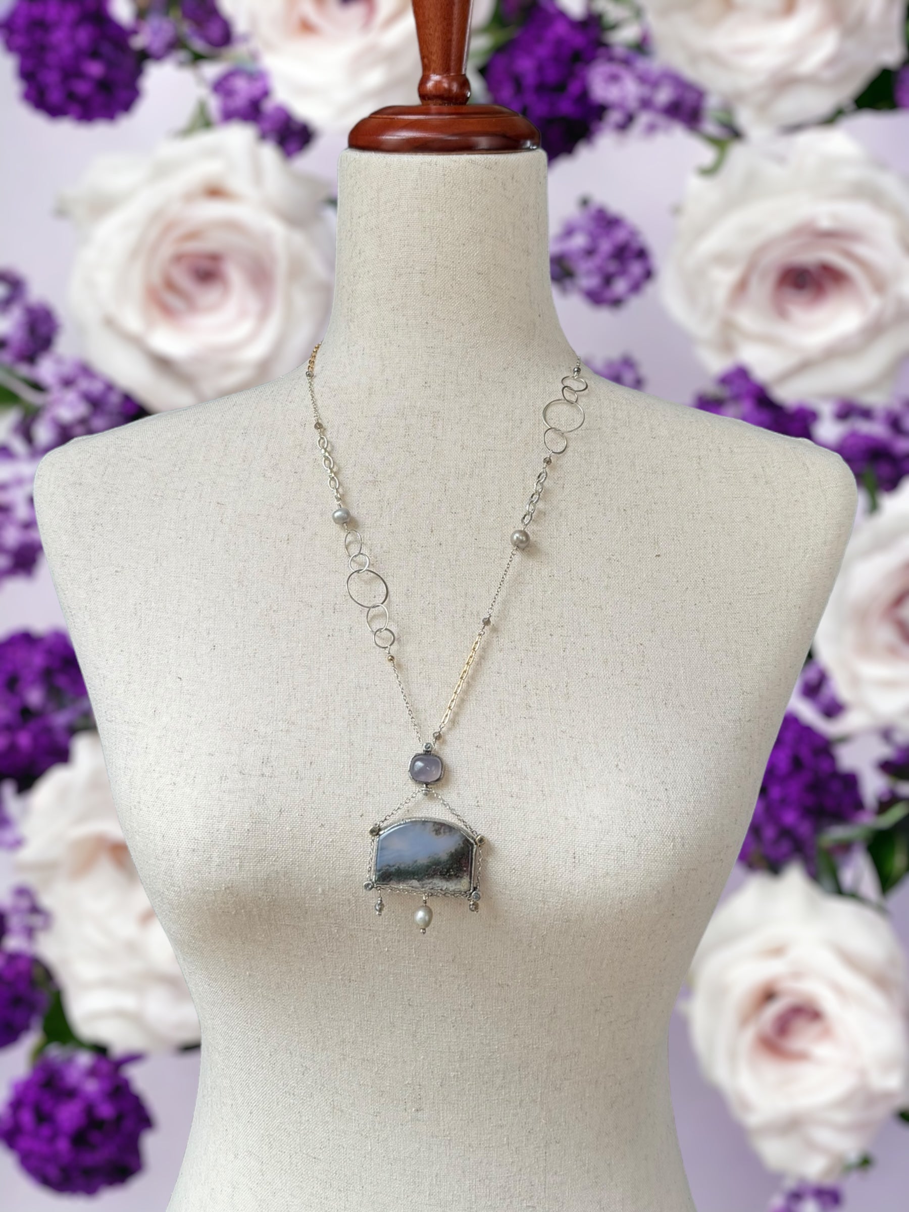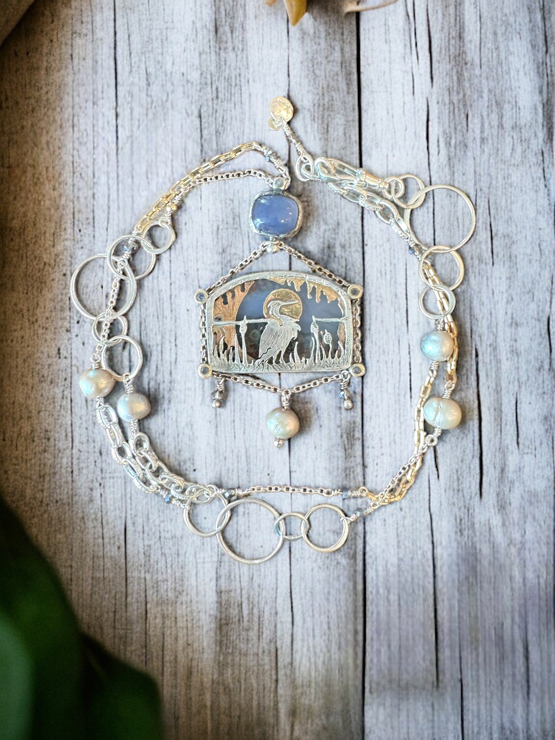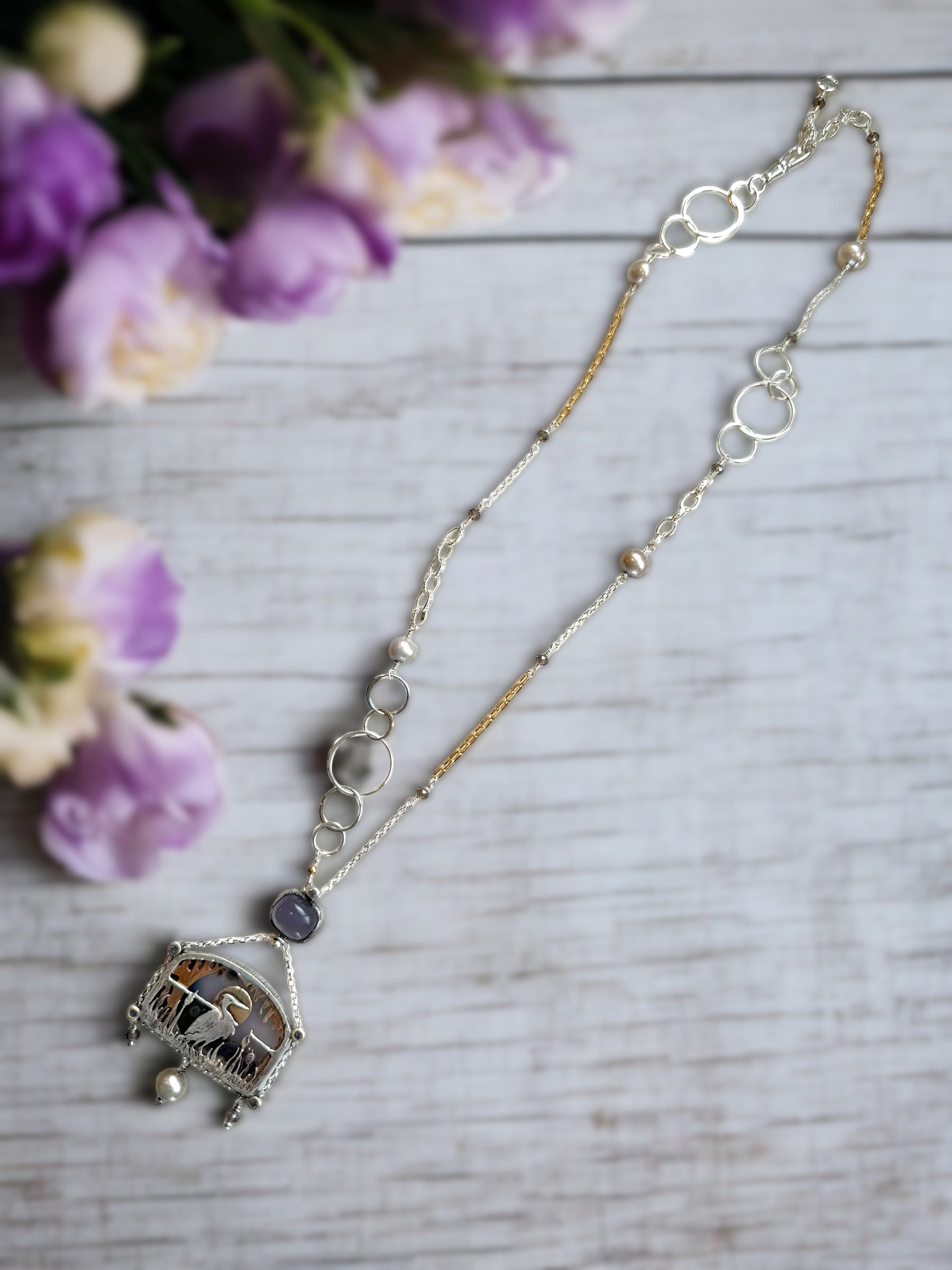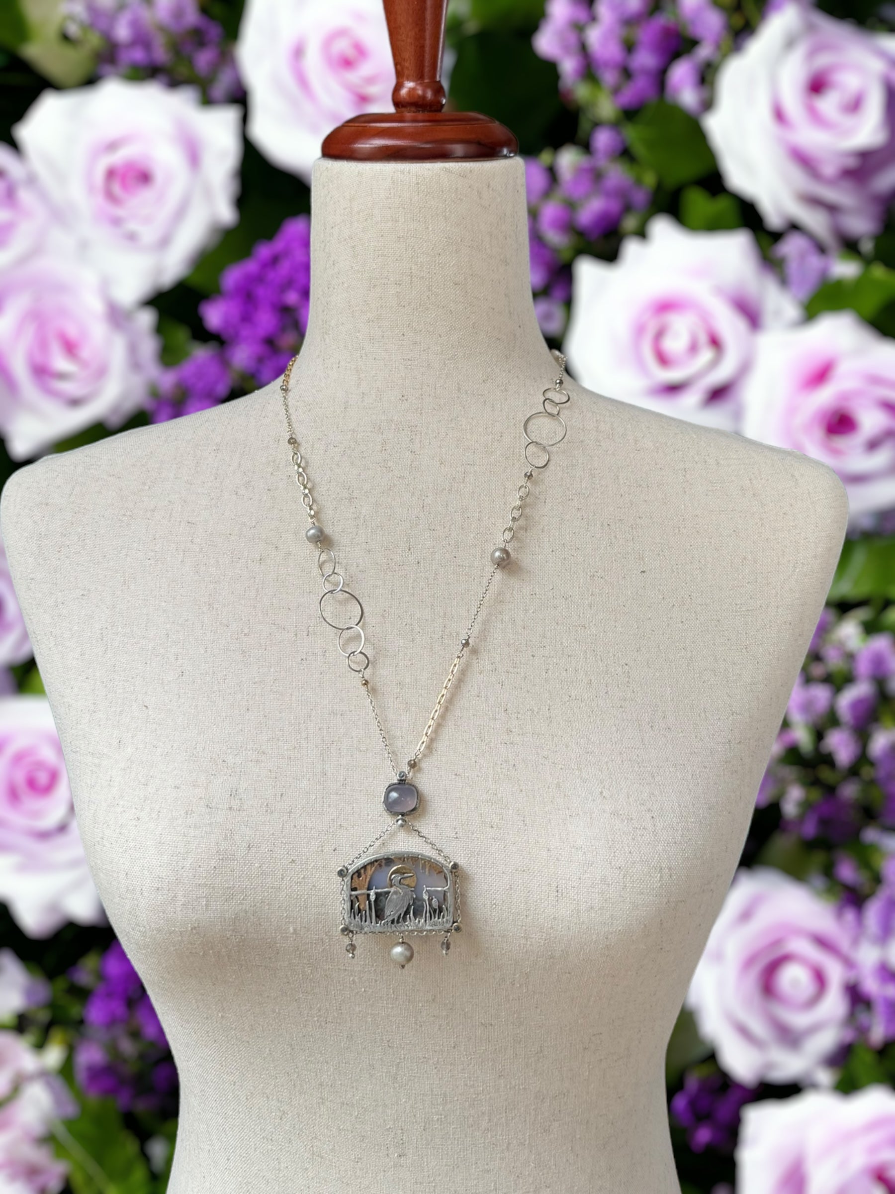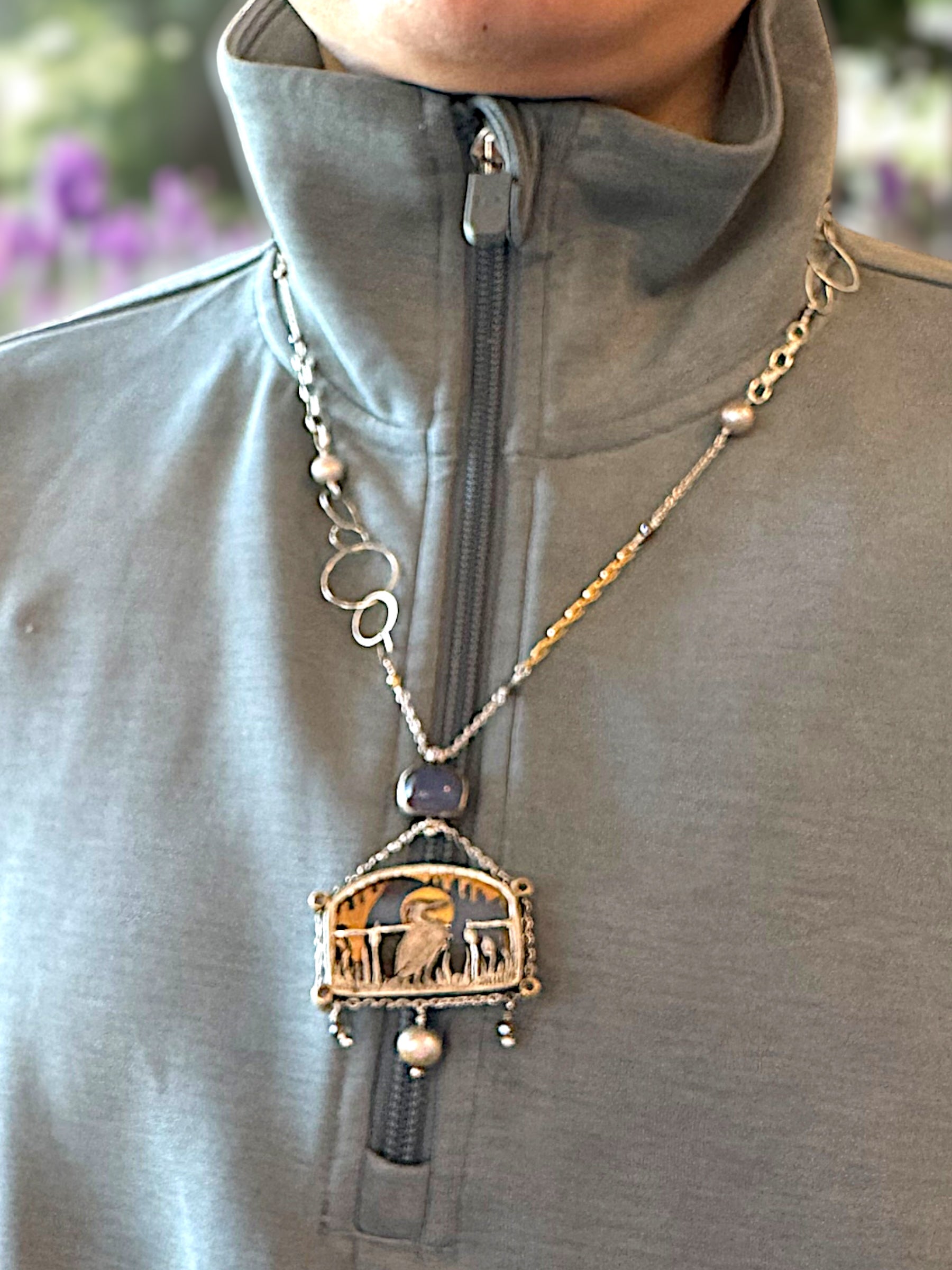 Crafted with a combination of gold, silver, and bronze, this stunning heron pendant features a focal stone of mossy agate and accents of Holley Blue chalcedony, tanzanites, labradorite, and grey pearls. Its adjustable length of 18” to 24” and signature mixed media style chain make it versatile for any occasion.