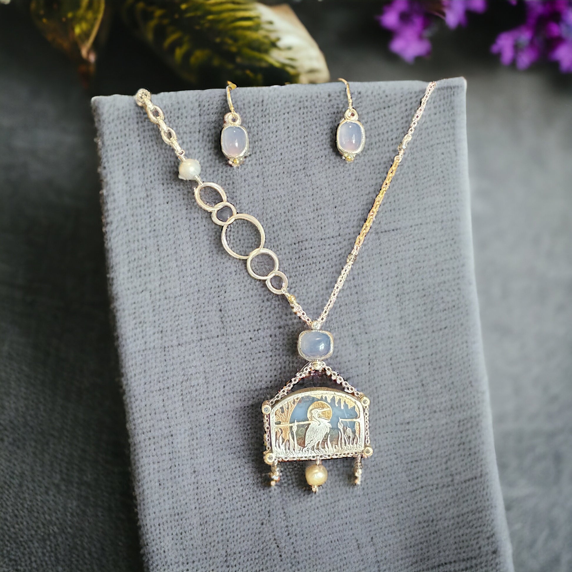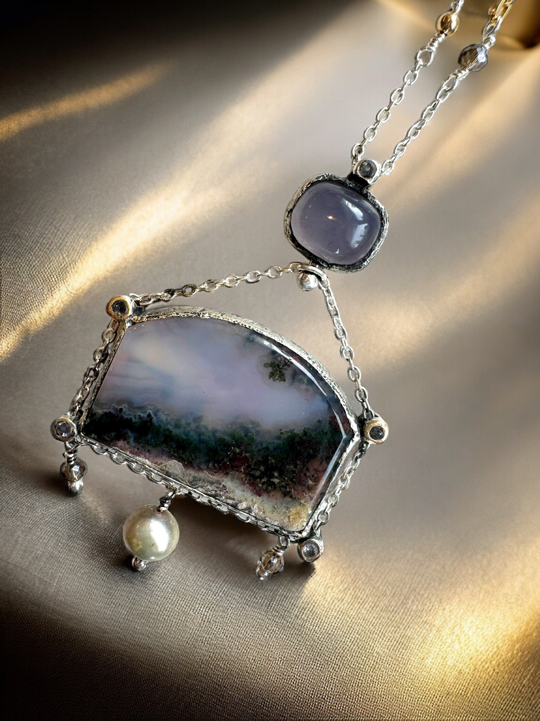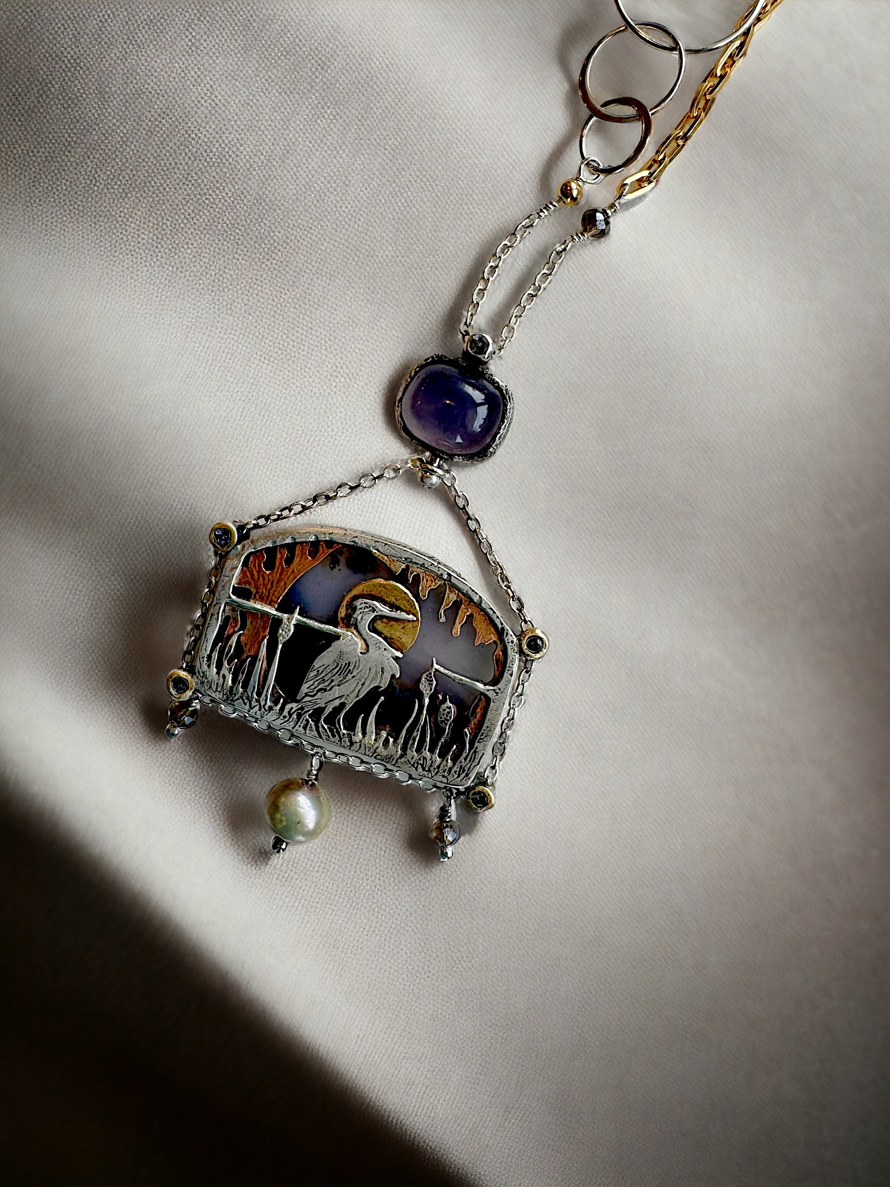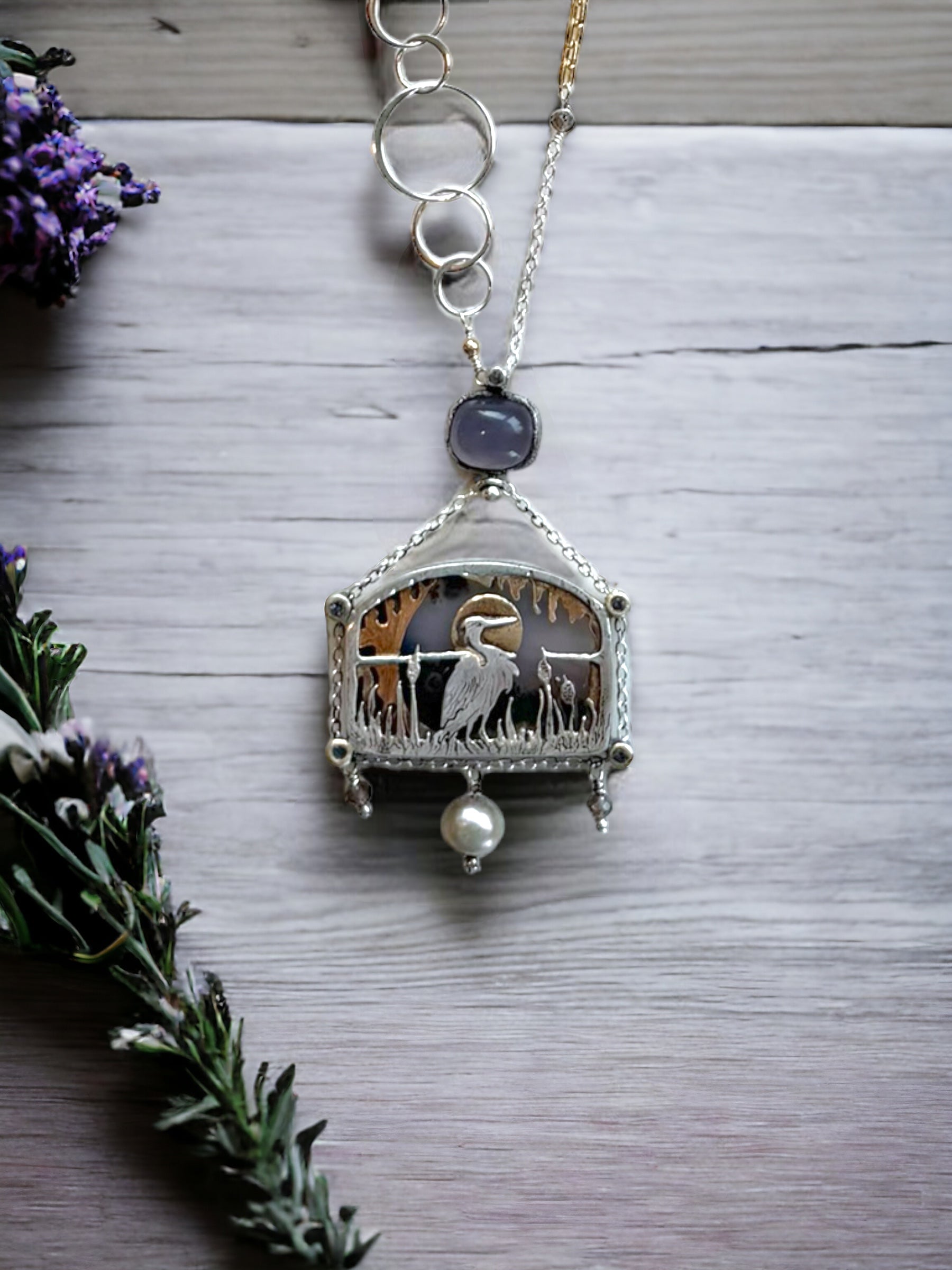 Crafted with a combination of gold, silver, and bronze, this stunning heron pendant features a focal stone of mossy agate and accents of Holley Blue chalcedony, tanzanites, labradorite, and grey pearls. Its adjustable length of 18” to 24” and signature mixed media style chain make it versatile for any occasion.