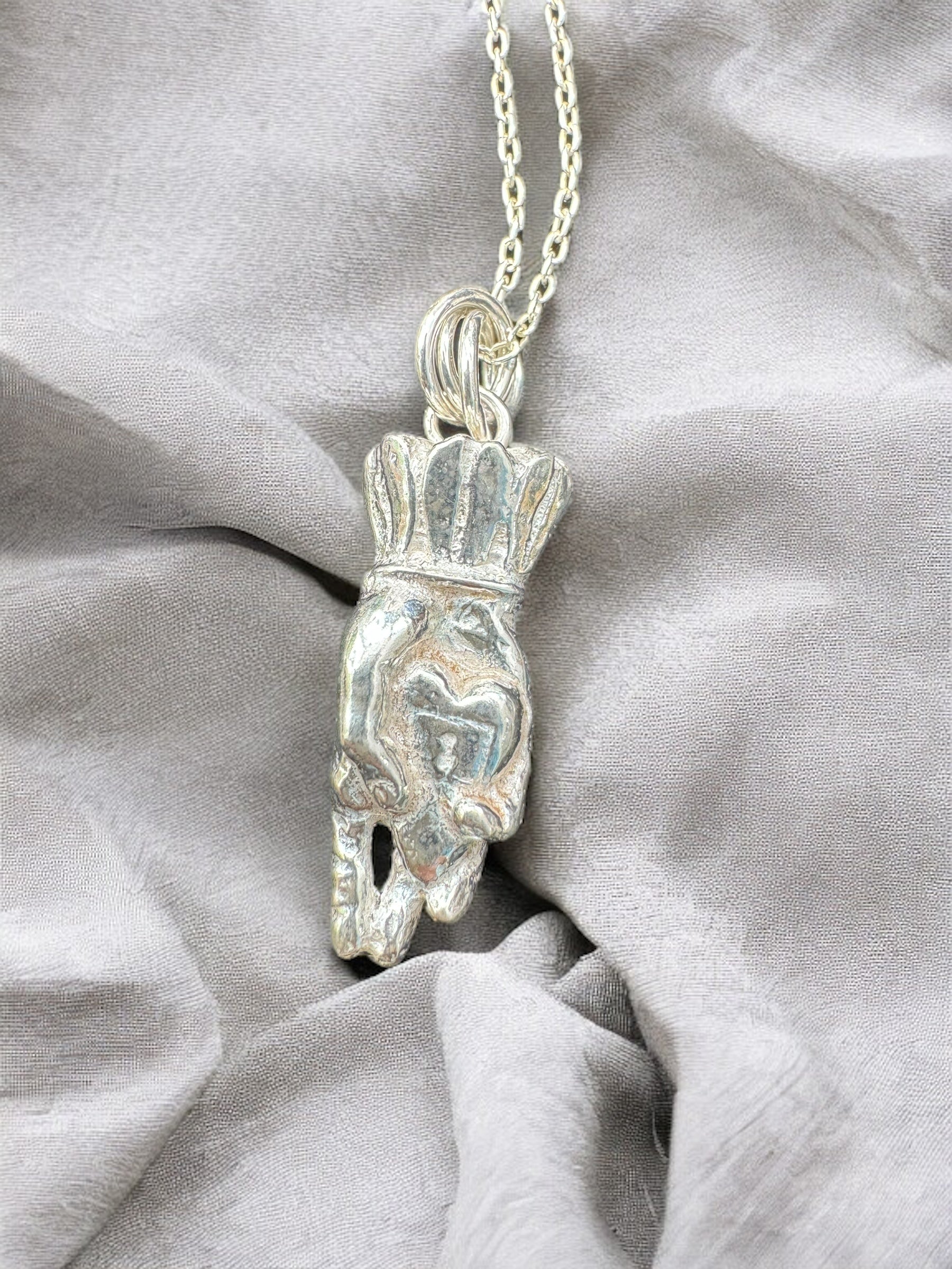 Crafted from solid silver, this pendant features a heart and skeleton key lock design. Oxidized version has a tiny diamond set in the lock held in the palm.
