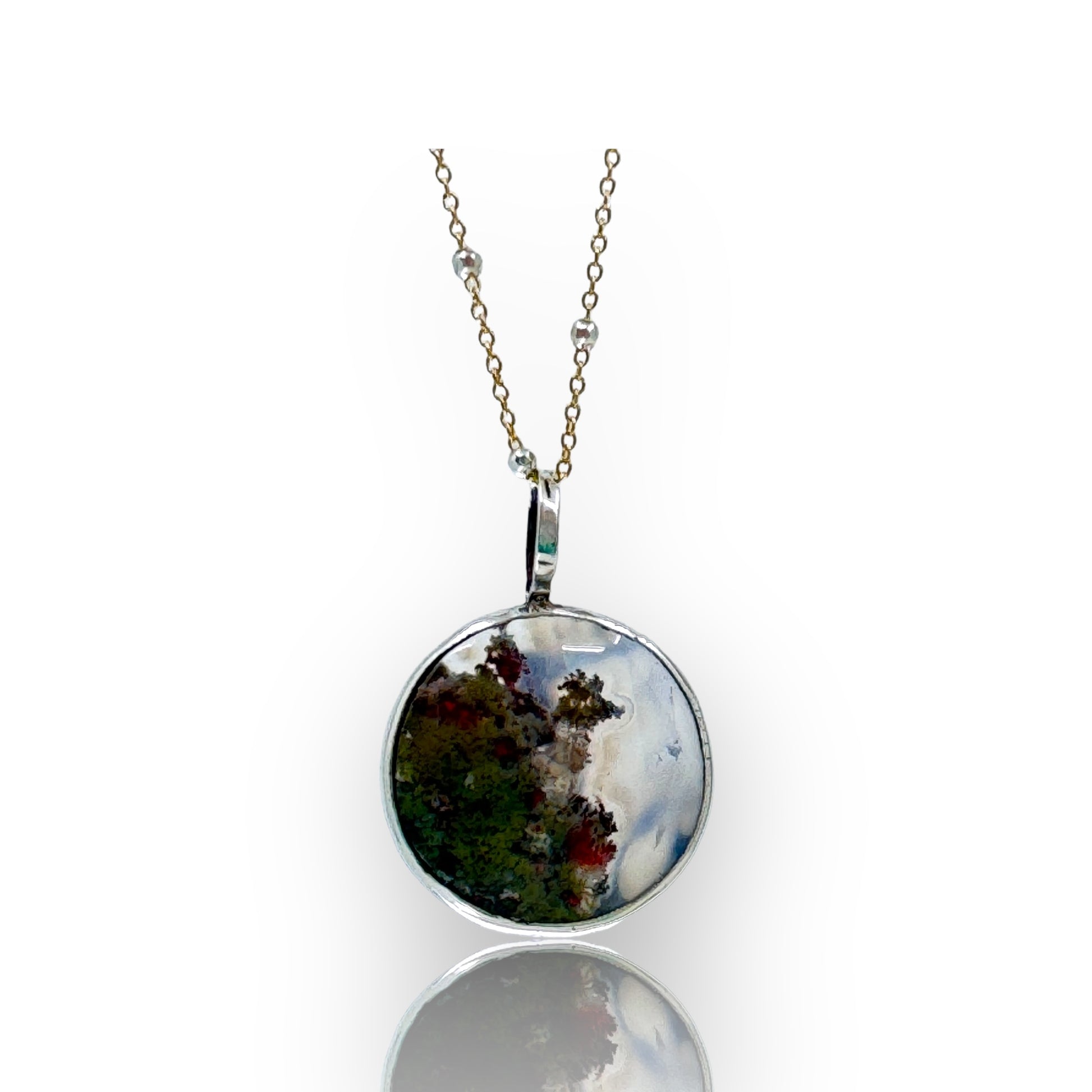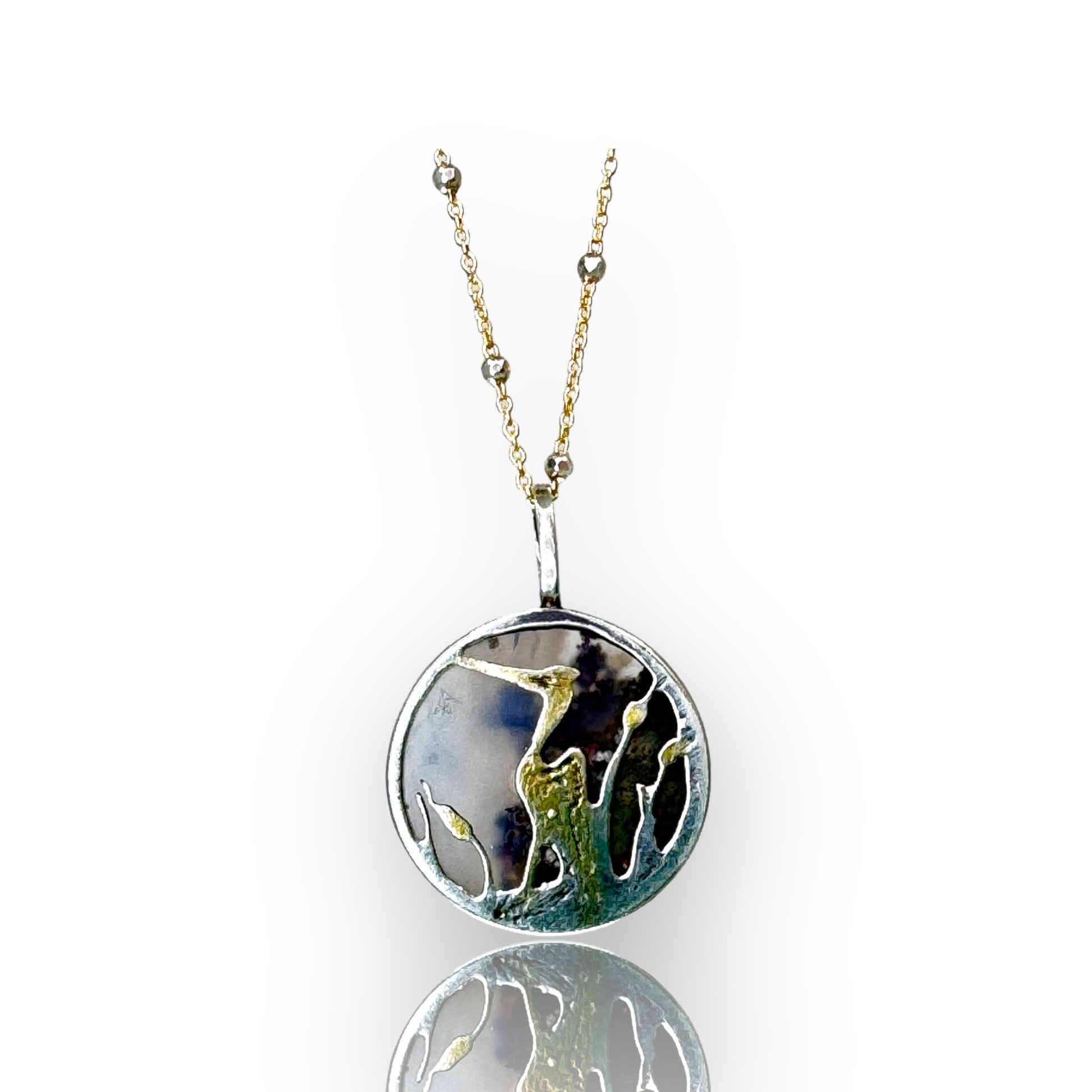 A delicate and fashionable garden agate necklace, featuring a meticulously hand-pierced heron scene and luxurious 24k gold accents. Included is a coordinating 18” 14k gold filled chain with sterling silver balls along the length.