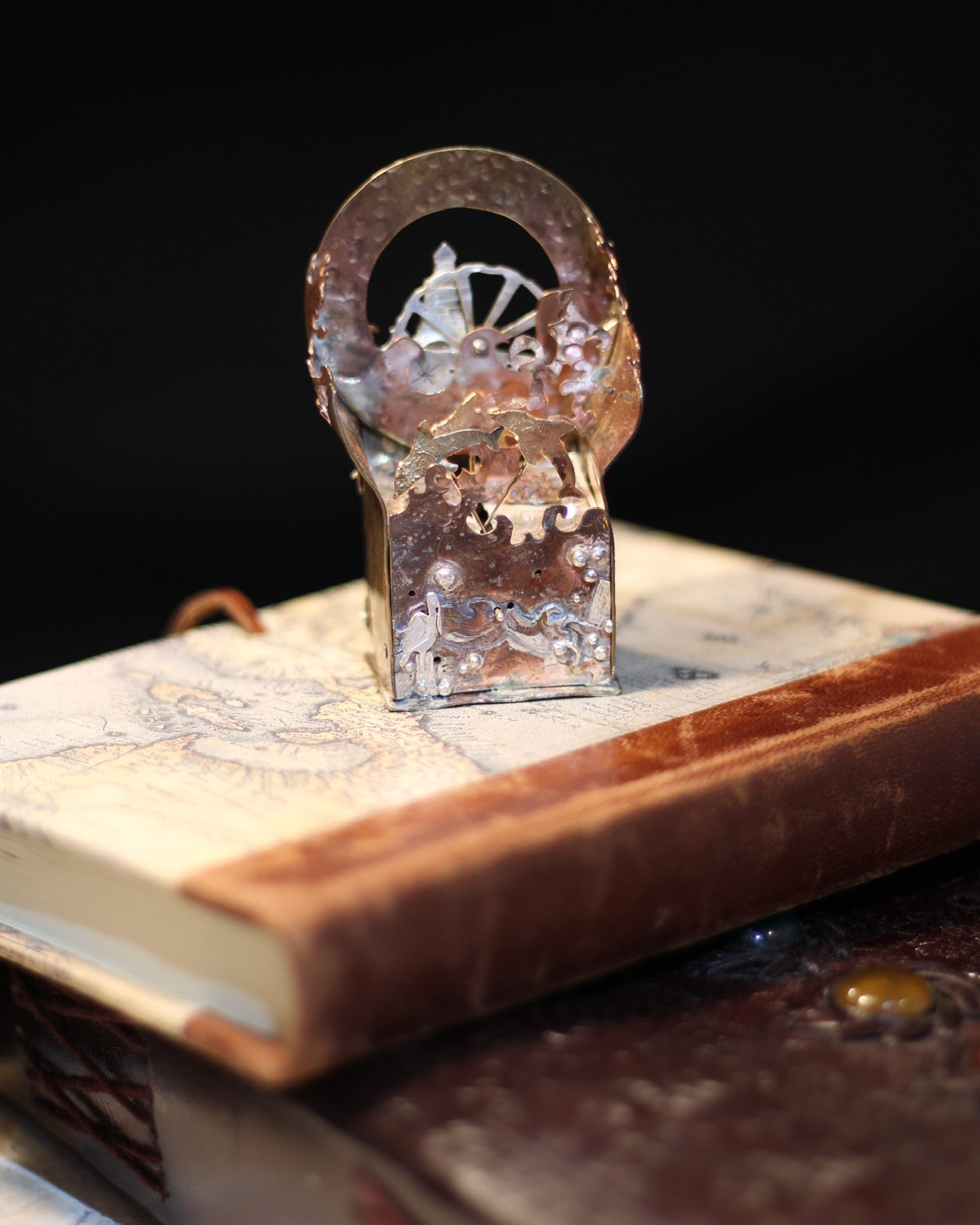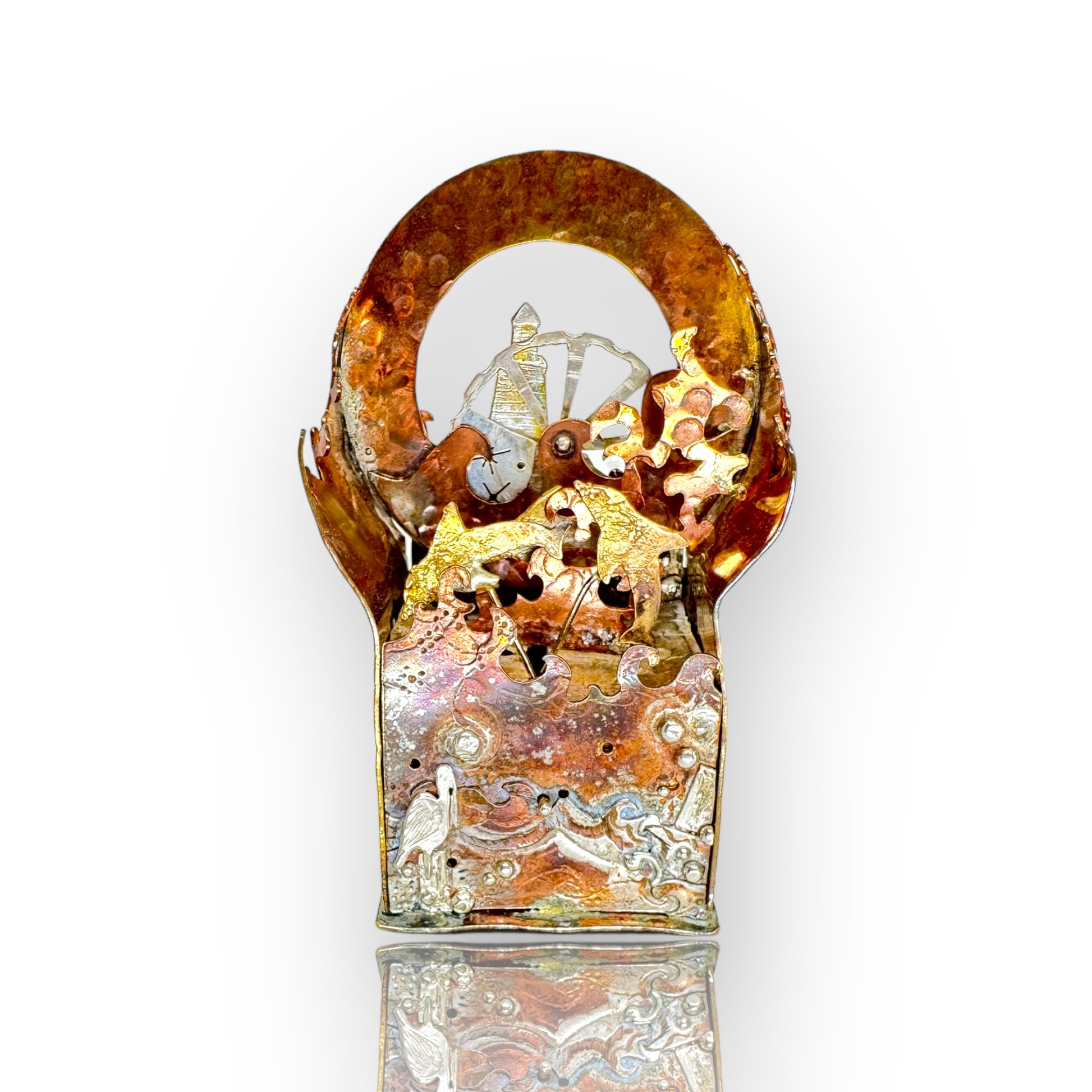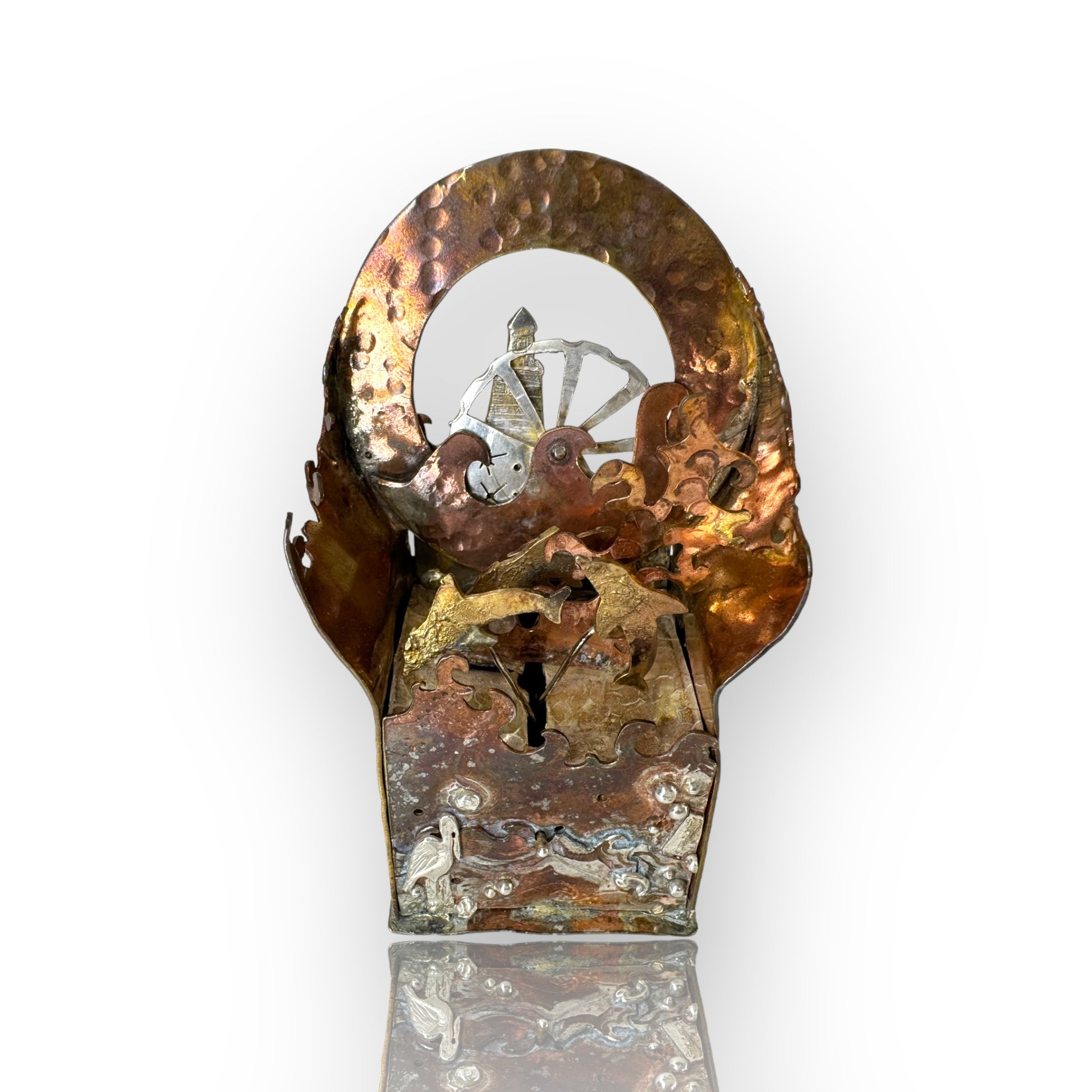 Gold, silver, bronze, and brass combine to make this kinetic sculpture. Every piece has been sawn out by hand and soldered or riveted together to create a stunning gem. The dolphins leap and play with a counterclockwise turn of the gear on the back. A quote by Jacques Cousteau on the bottom reads “the sea, once it casts it spell, holds one in its net of wonder forever”. A true collectors item.