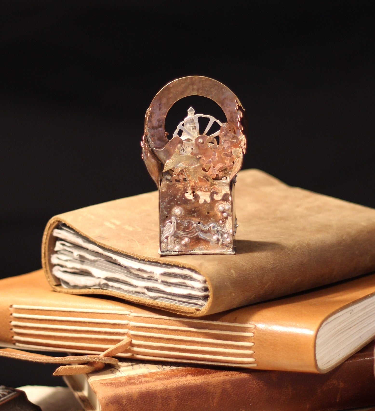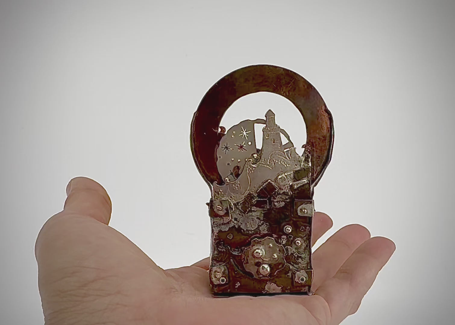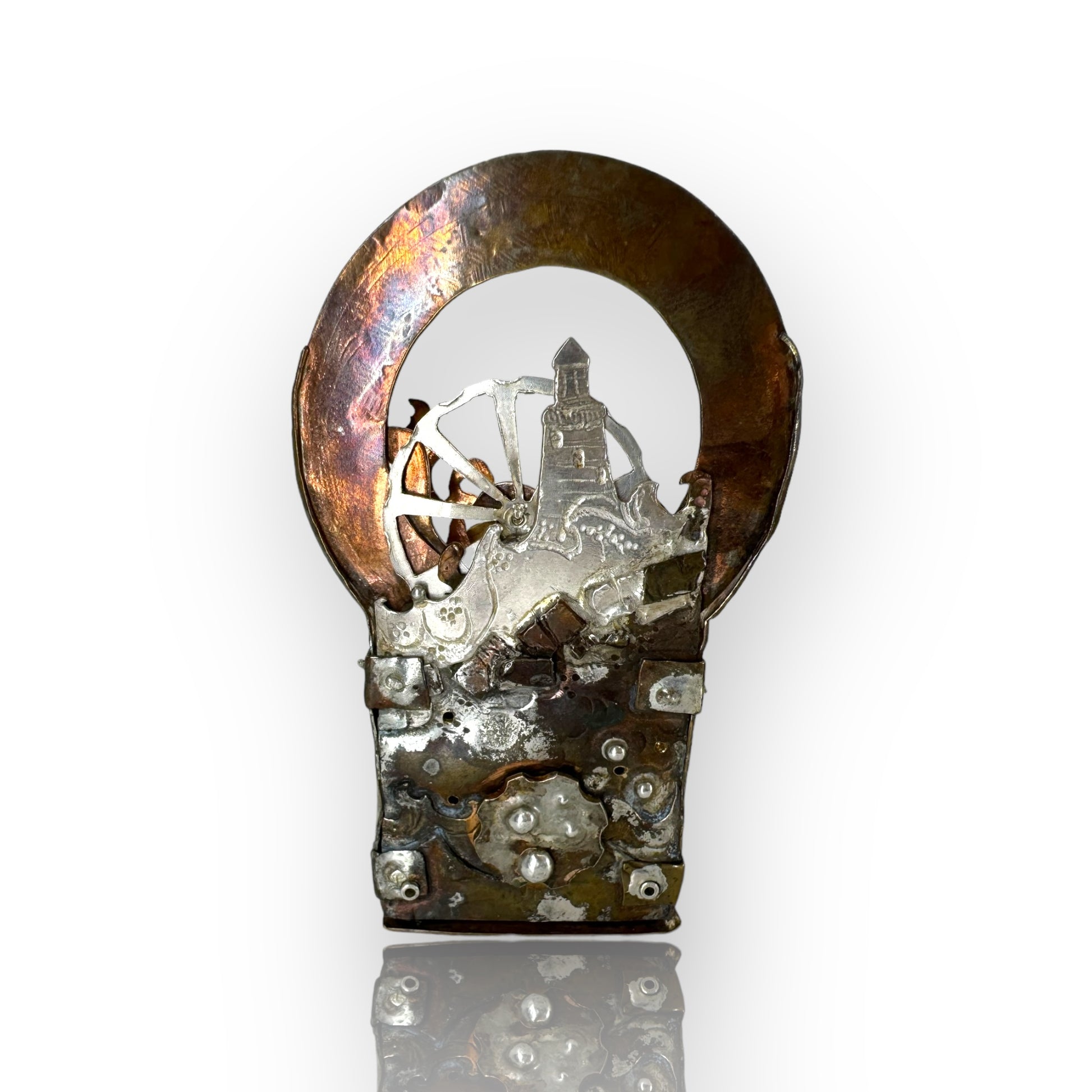 Gold, silver, bronze, and brass combine to make this kinetic sculpture. Every piece has been sawn out by hand and soldered or riveted together to create a stunning gem. The dolphins leap and play with a counterclockwise turn of the gear on the back. A quote by Jacques Cousteau on the bottom reads “the sea, once it casts it spell, holds one in its net of wonder forever”. A true collectors item.