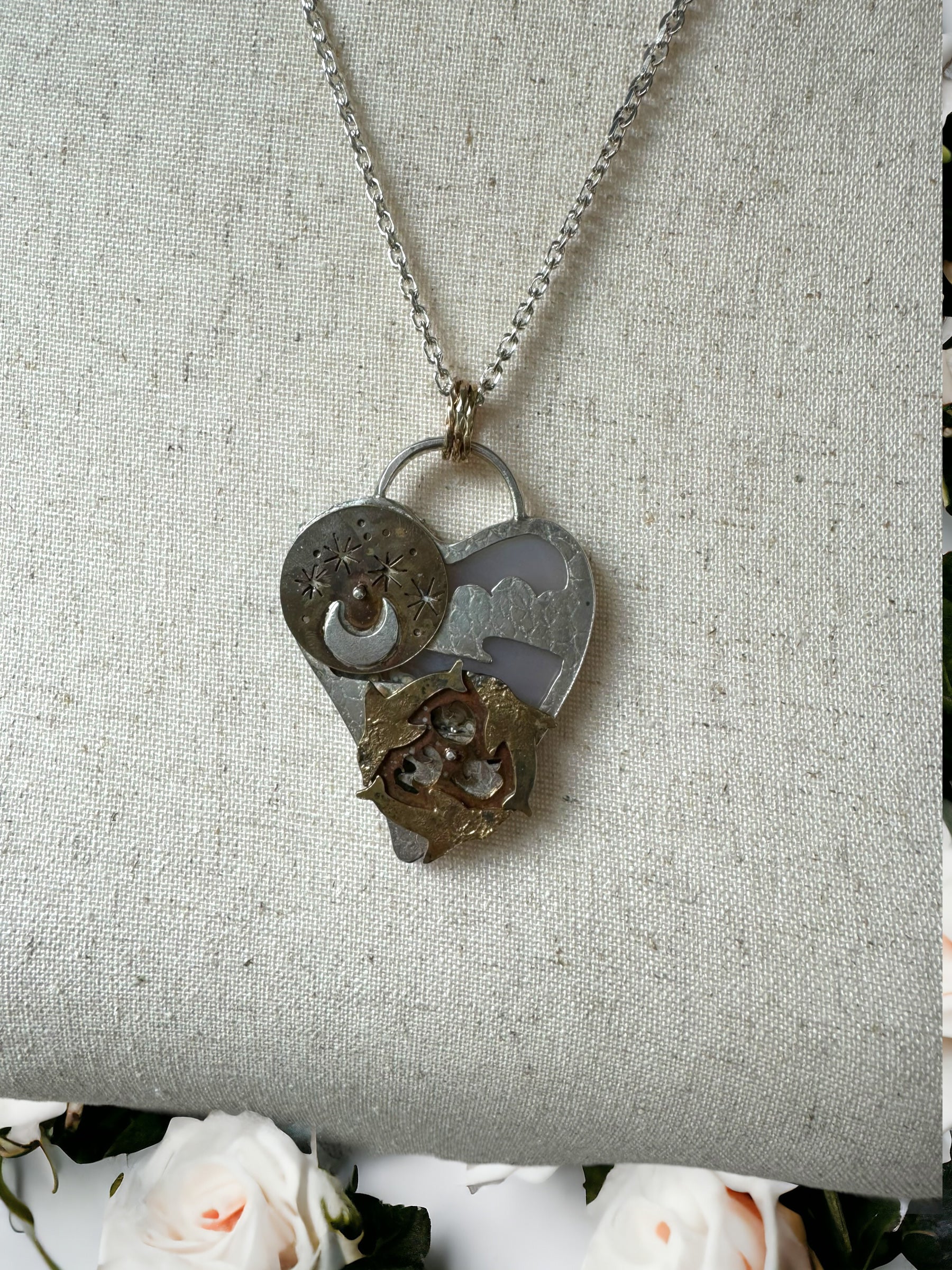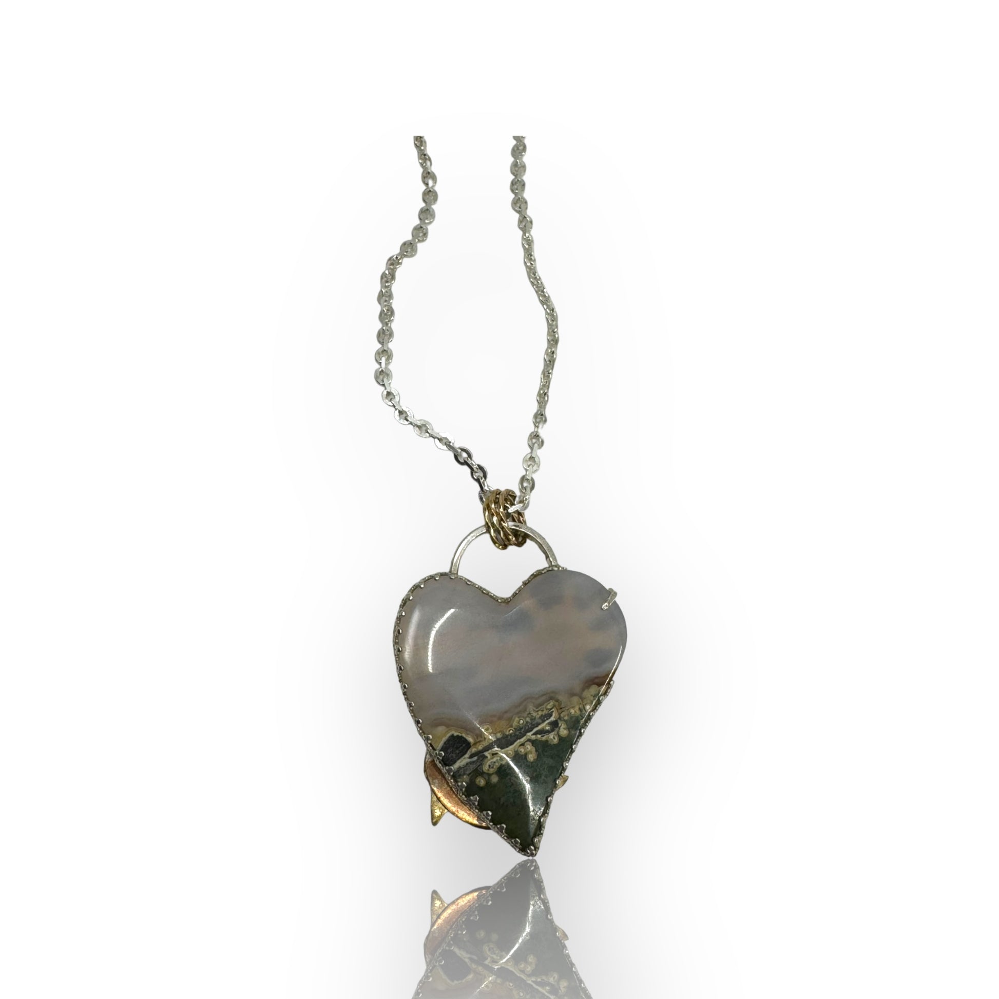This intricate heart-shaped agate pendant, set in sterling silver, features a mesmerizing mixed-metal kinetic design on the reverse side with spinning stars and diving dolphins. Not only does it serve as a stunning accessory, but it also provides a source of endless entertainment.