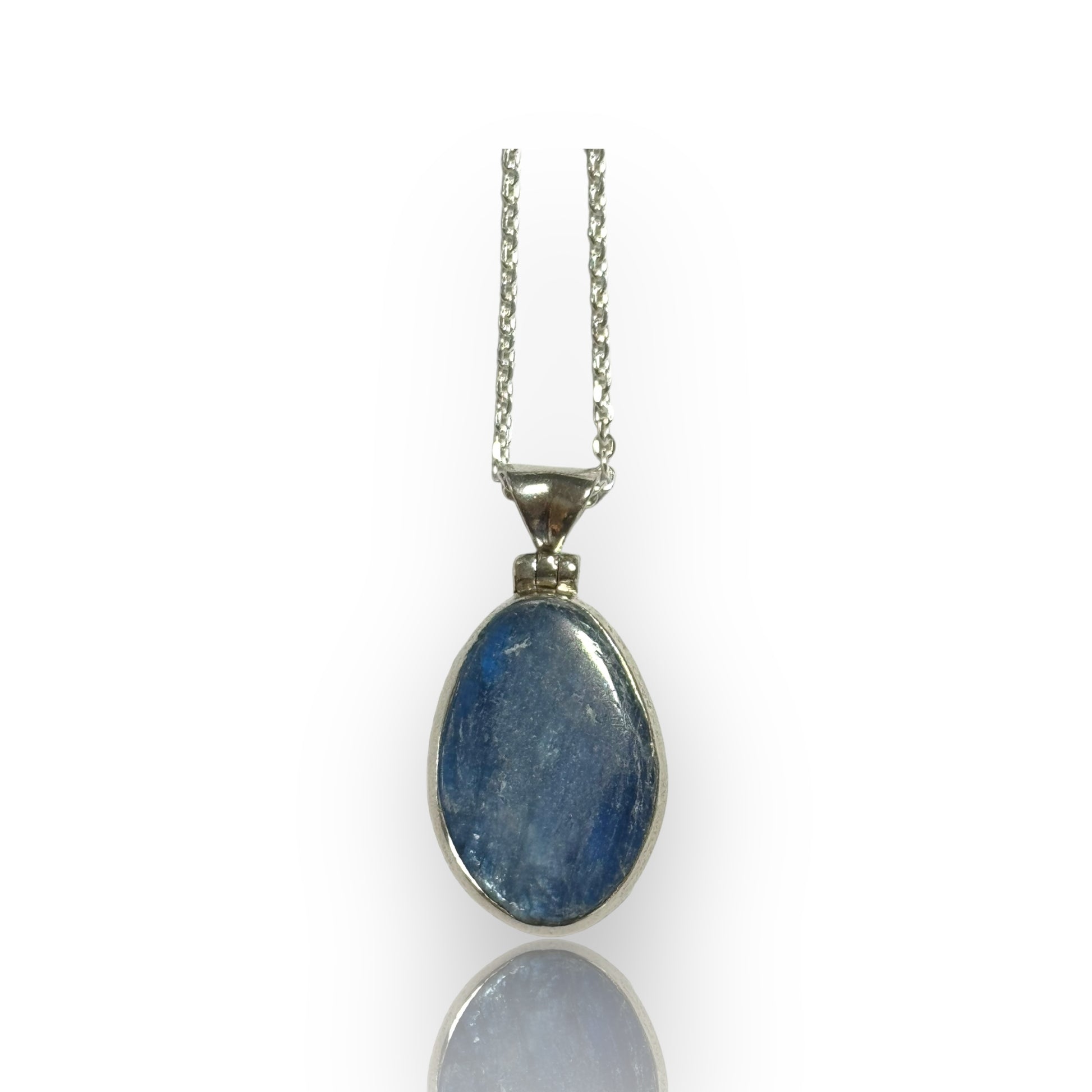 Expertly set in a sterling silver bezel with an open back, this kyanite pendant boasts a translucent blue hue. Ethereal and captivating, this pendant will elevate any outfit. Experience the unmatched beauty of natural gemstones with this exclusive piece.