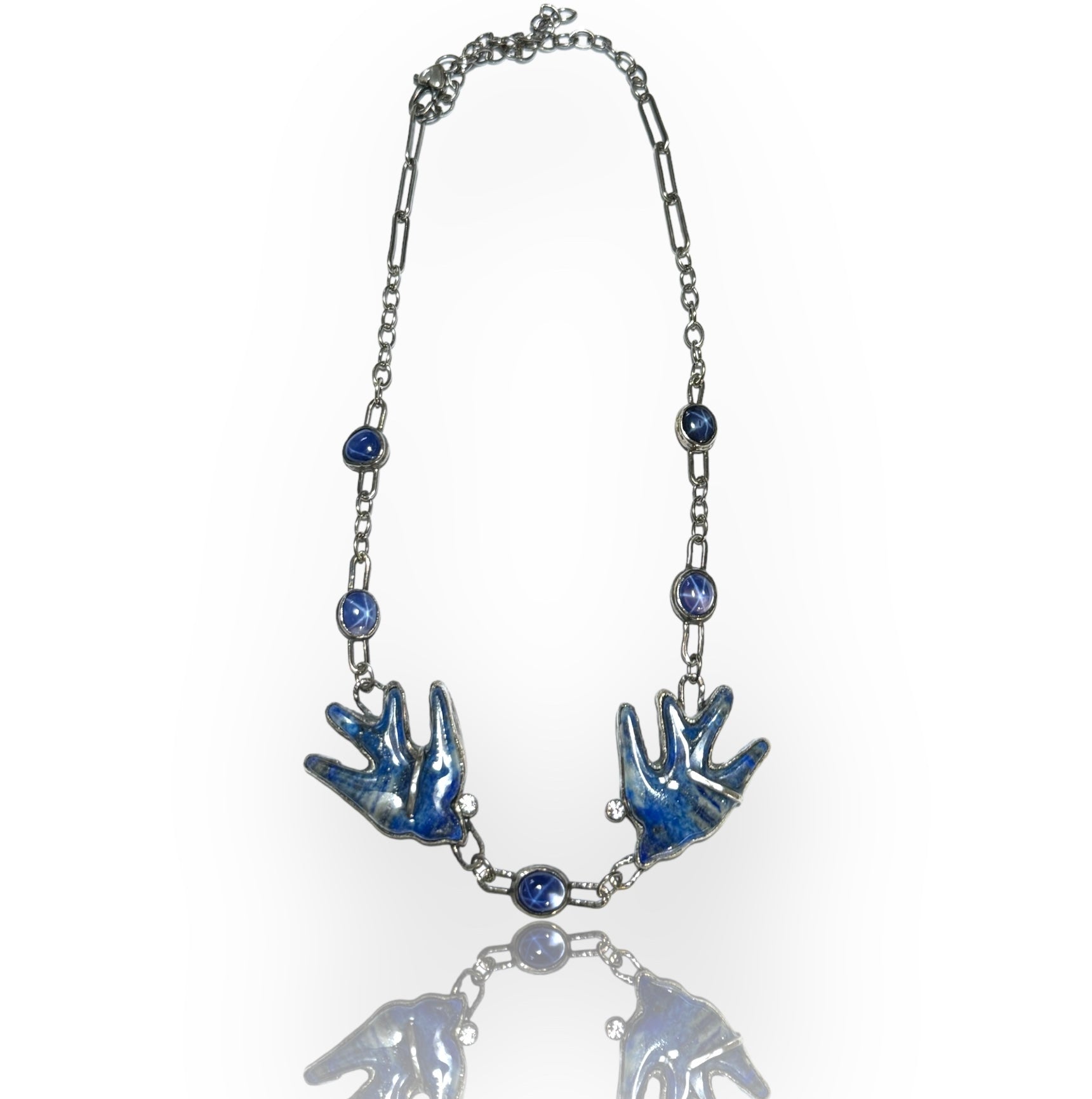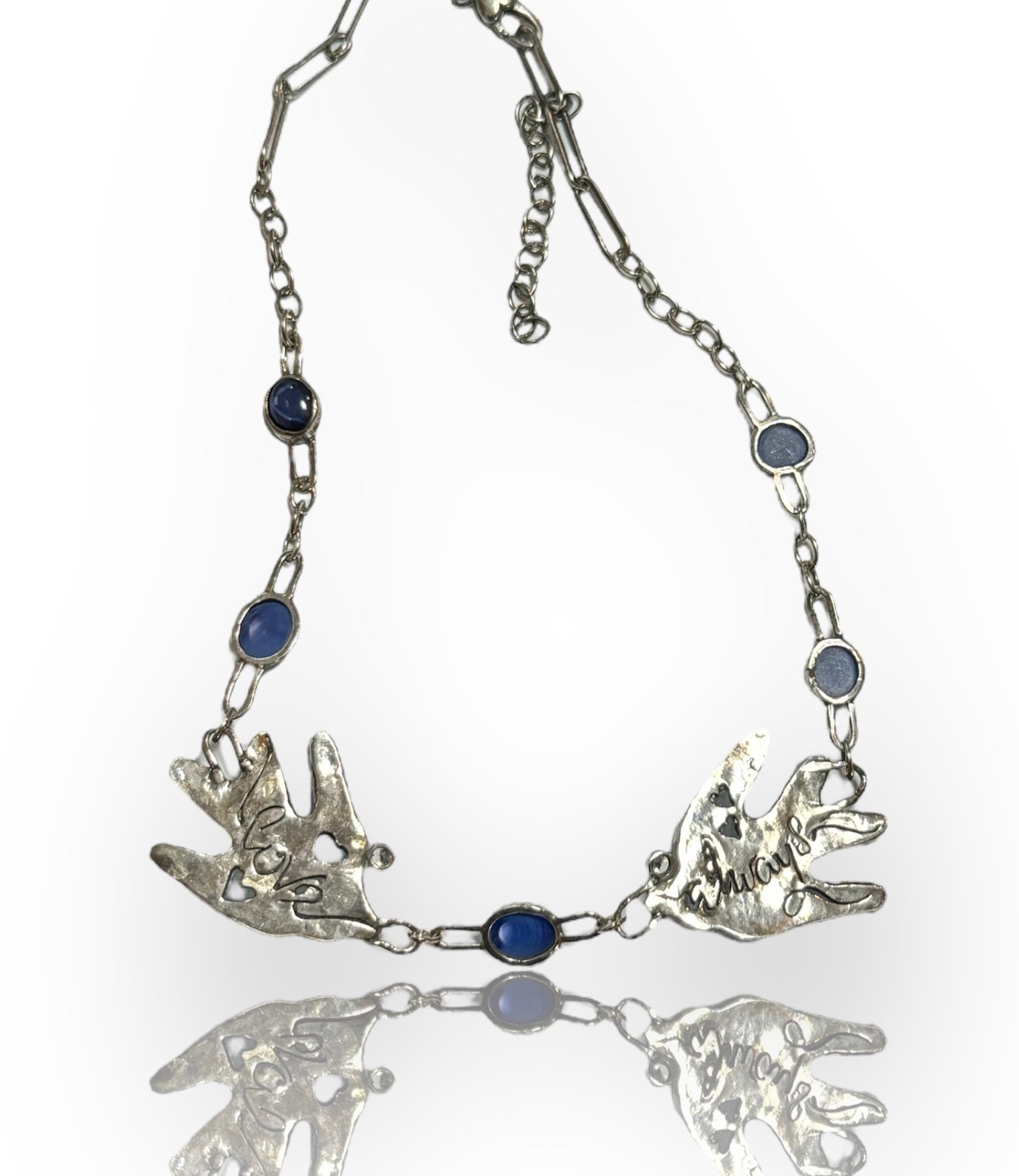 Indulge in luxury with our Lapis and Sapphire Bird Necklace. Hand-carved lapis swallows and star-sapphires adorn your neck with elegance. The adjustable length ensures a perfect fit. The back features a heartfelt message, making this one-of-a-kind piece a love-filled treasure.