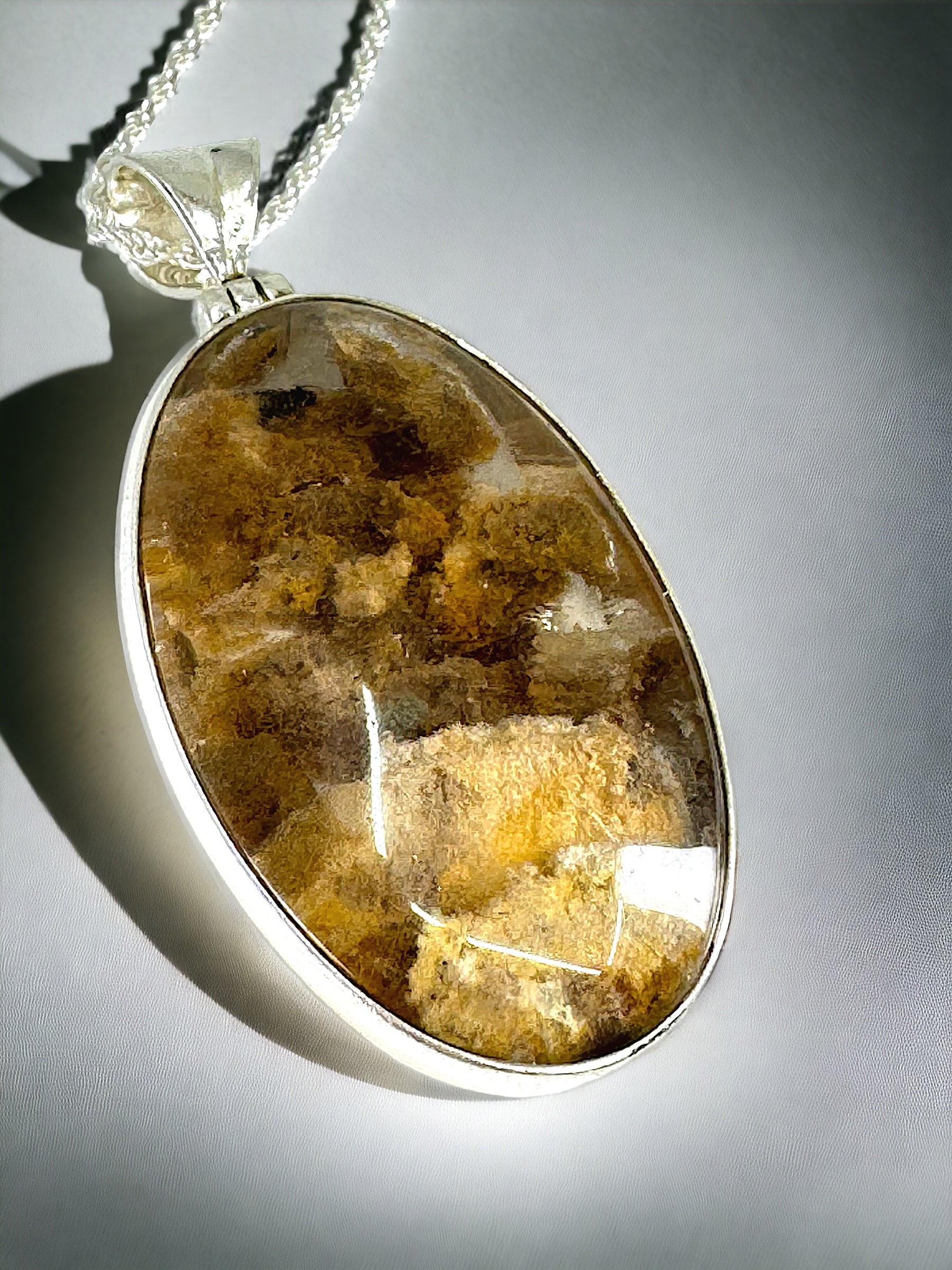 This exquisite garden quartz stone boasts a generous size with stunning mica inclusions, gracefully encircled by an open-backed sterling silver bezel that allows the light to highlight its captivating depth. Suspended on an adjustable sterling silver rope chain. Pendant measures nearly two inches long.