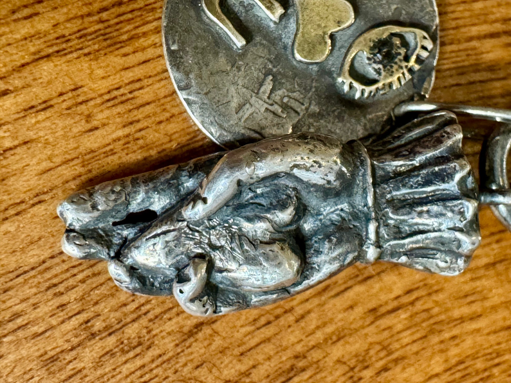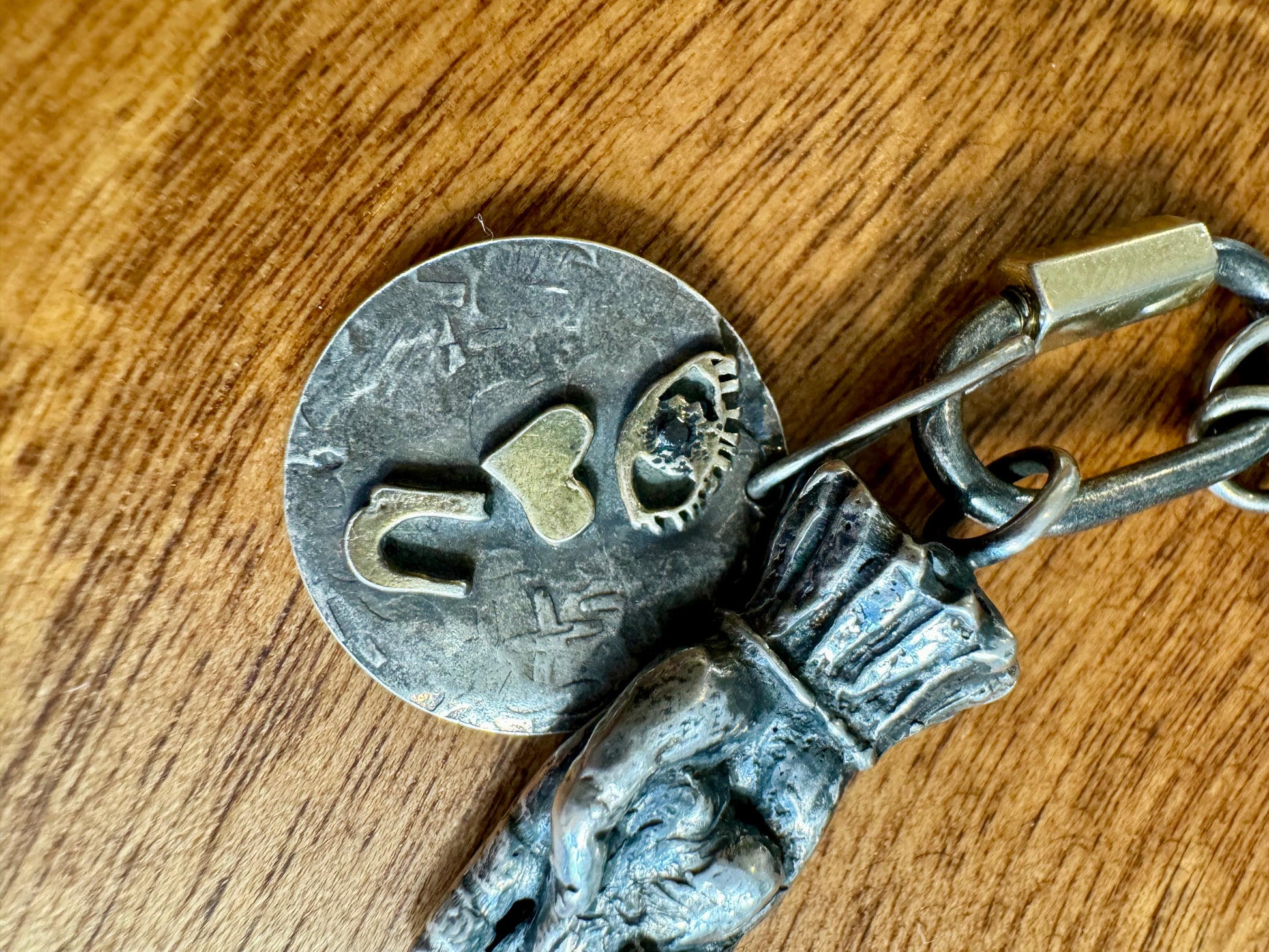 Oxidized sterling silver links, gold filled wire, apatite beads, sterling silver and 14k gold screw carabiner clasp. Two heavy sterling silver charms - a Victorian cast hand with a white diamond in the lock of the heart in the middle, and a pictograph “I Love You” charm with a black diamond in the eye.