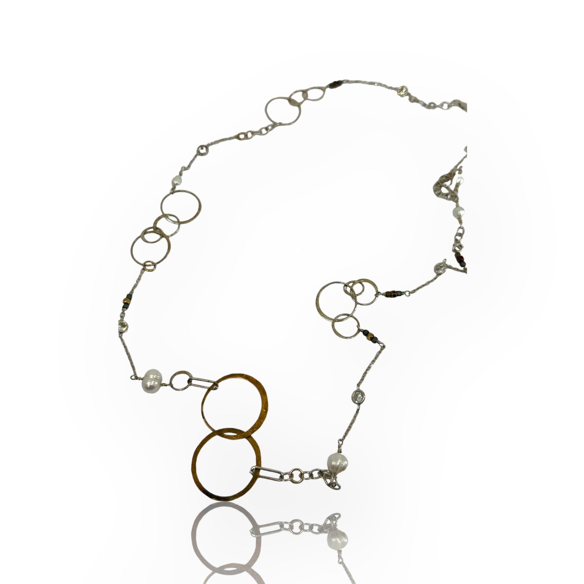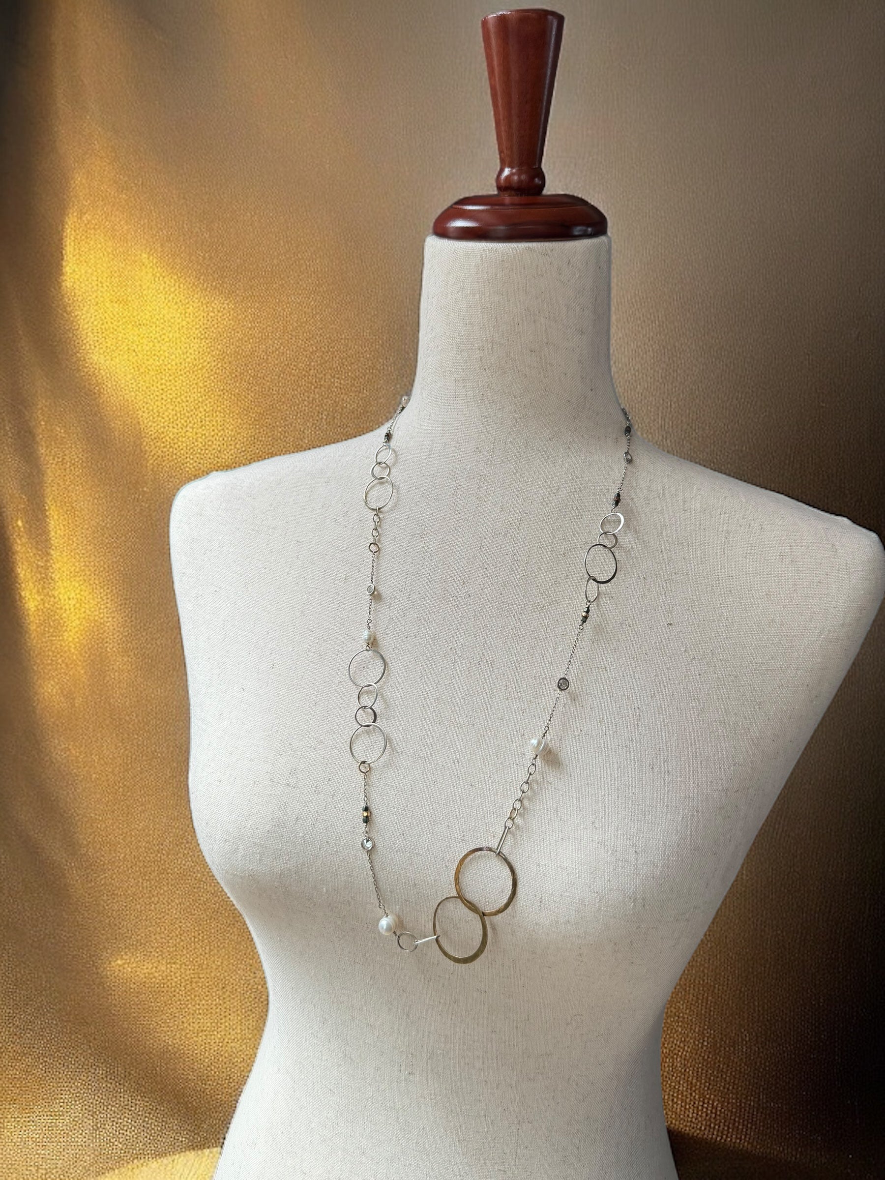 Expertly crafted from high-quality pearls, beads, Swarovski crystals, sterling silver, and bronze, this versatile long chain offers endless styling options. Whether you prefer to double it up, wear it long, or pair it with a pendant, you can effortlessly elevate any outfit for any occasion.