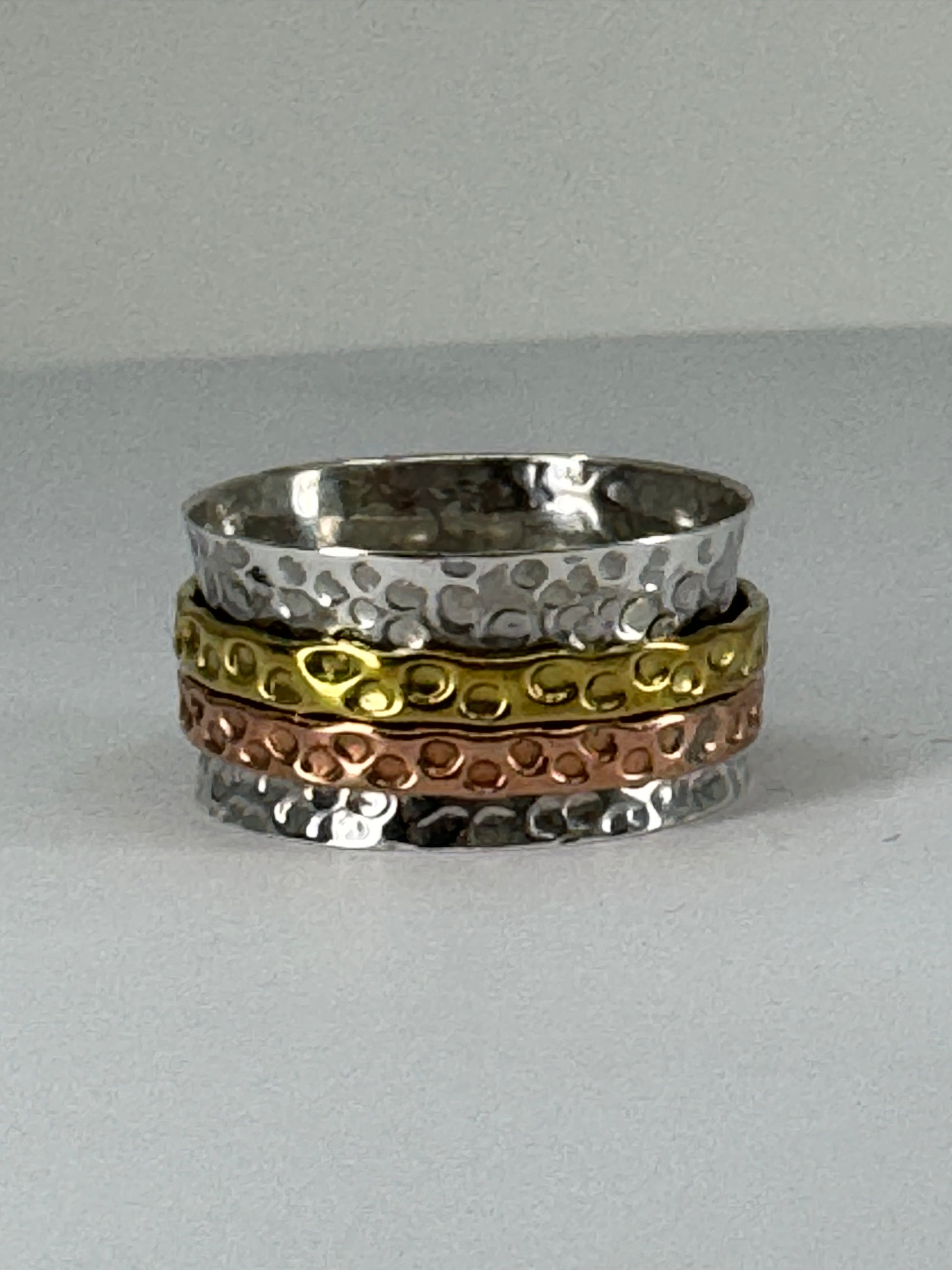 Mixed metal spinner featuring two spinning bands in textured brass and bronze on a wide textured sterling silver base. Approximate size US 9
