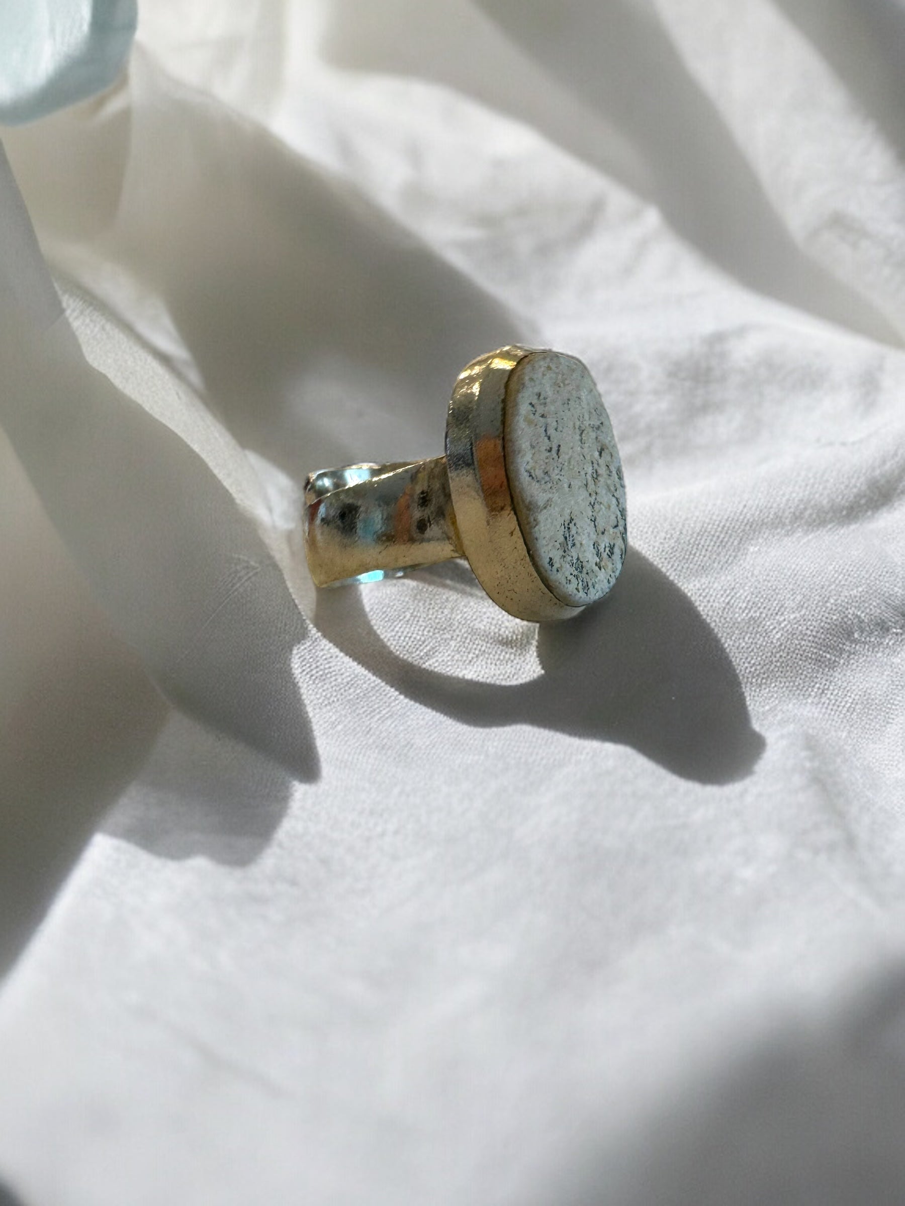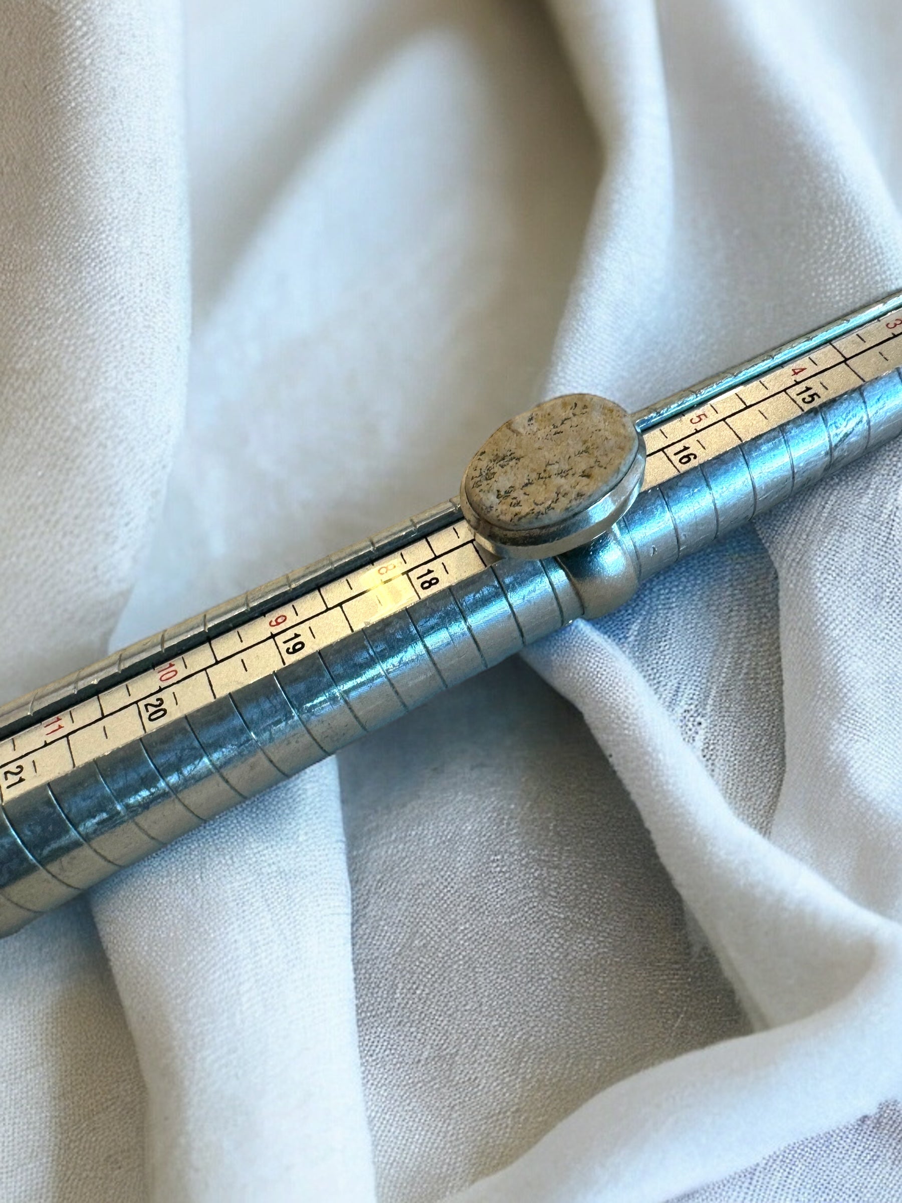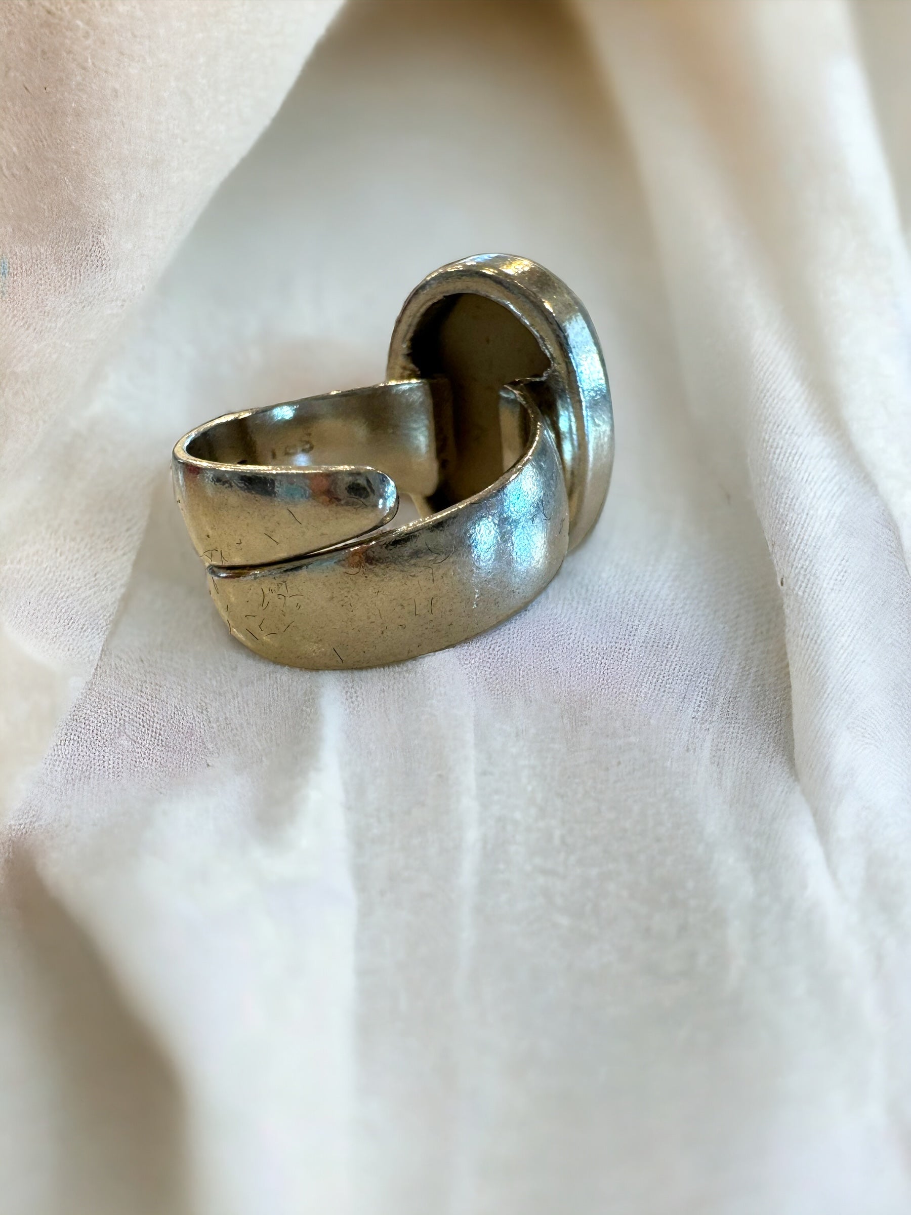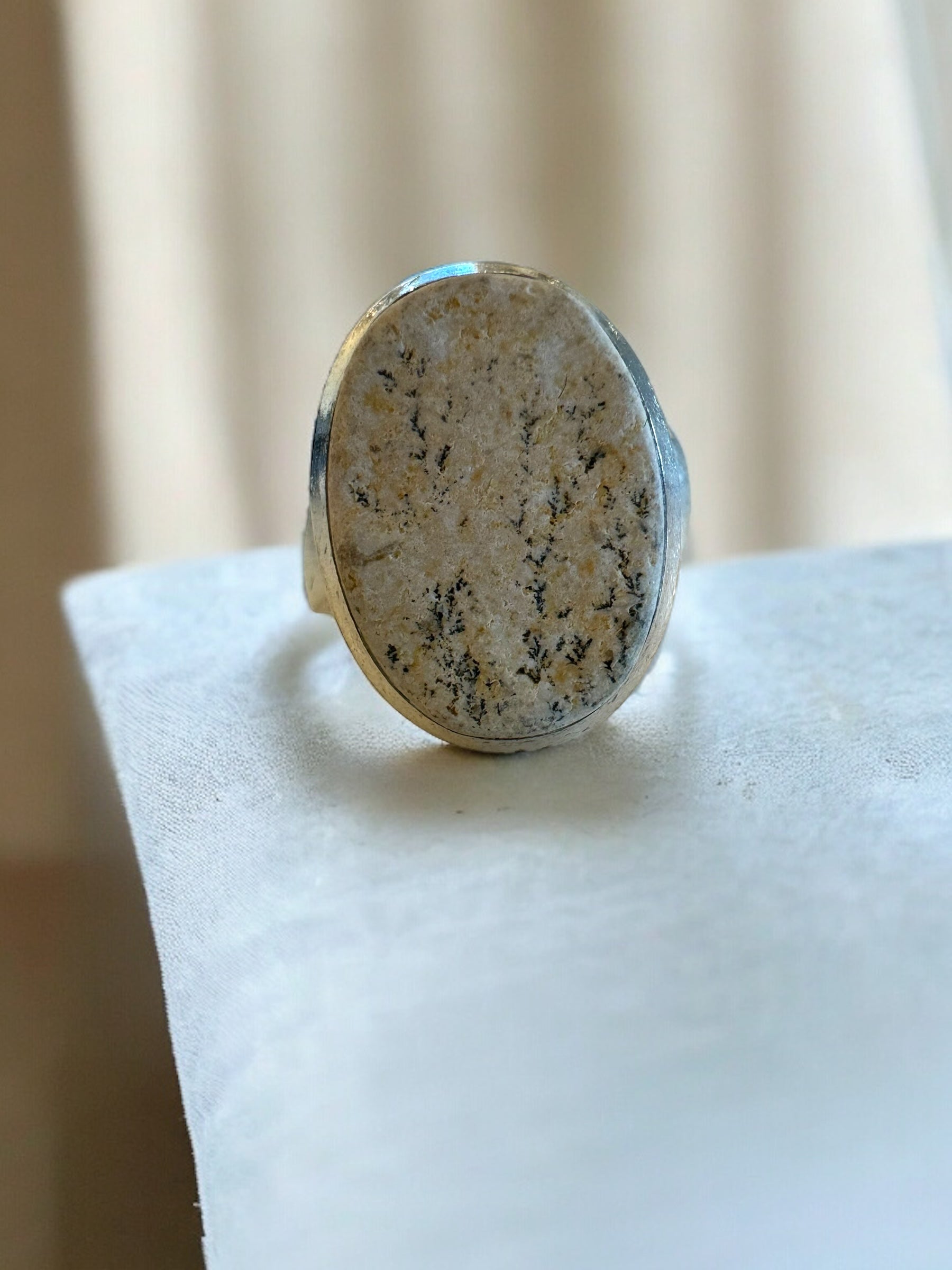 Dendrites adorn the face of this stone set in a chunky adjustable sterling silver ring. US size 5-9 approximately.
