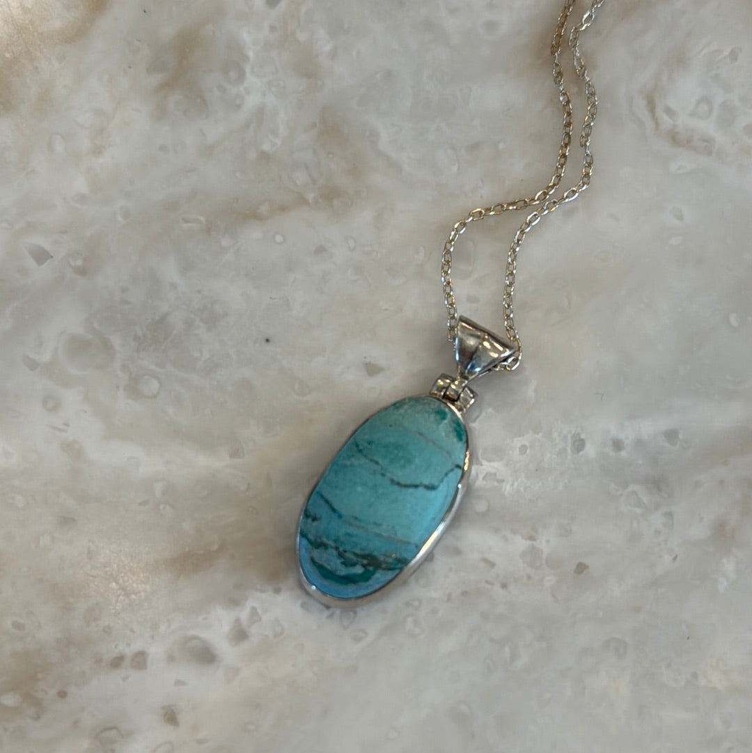The Oval Chrysocolla Pendant features an elegantly carved open-backed sterling silver bezel.