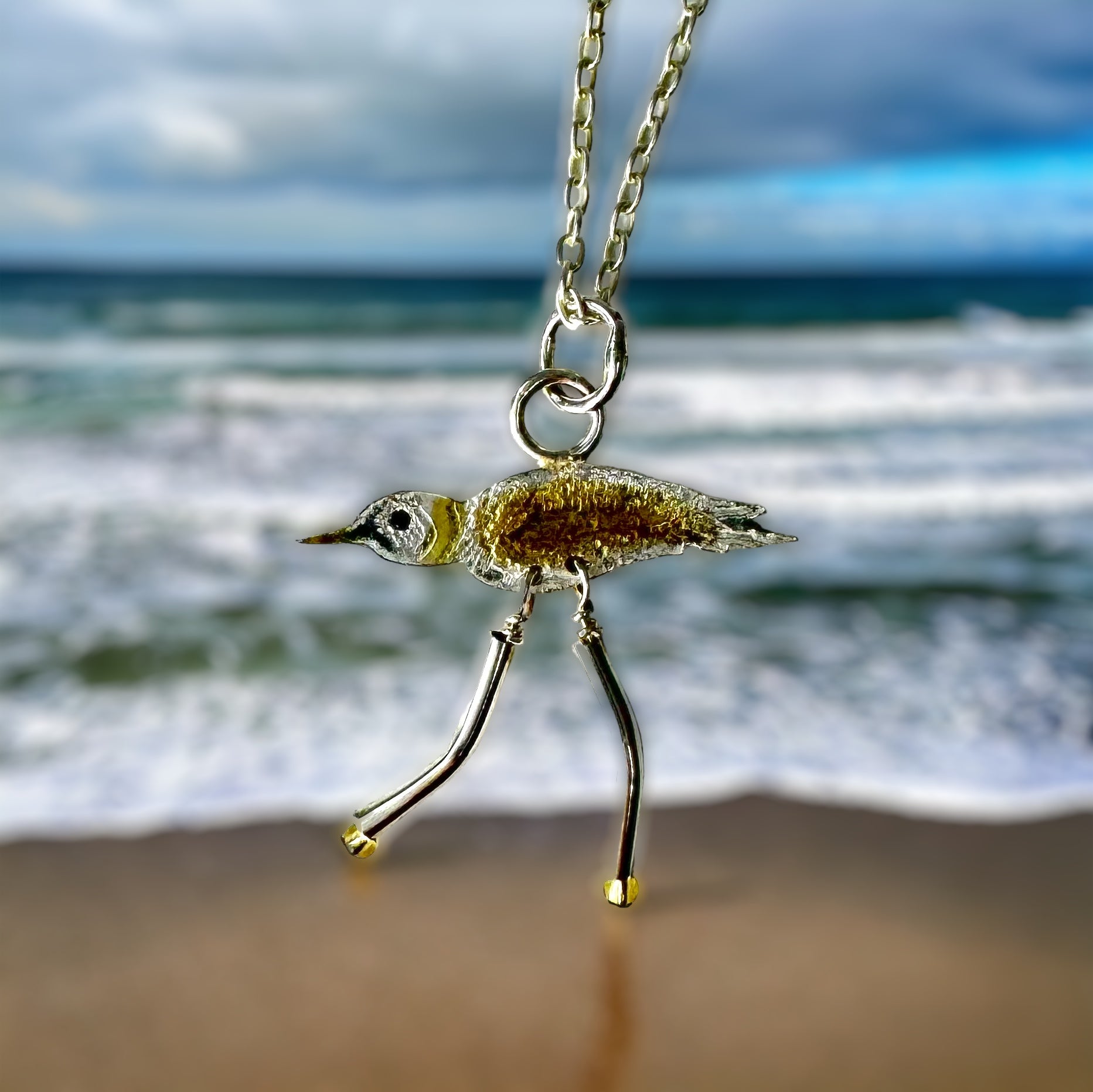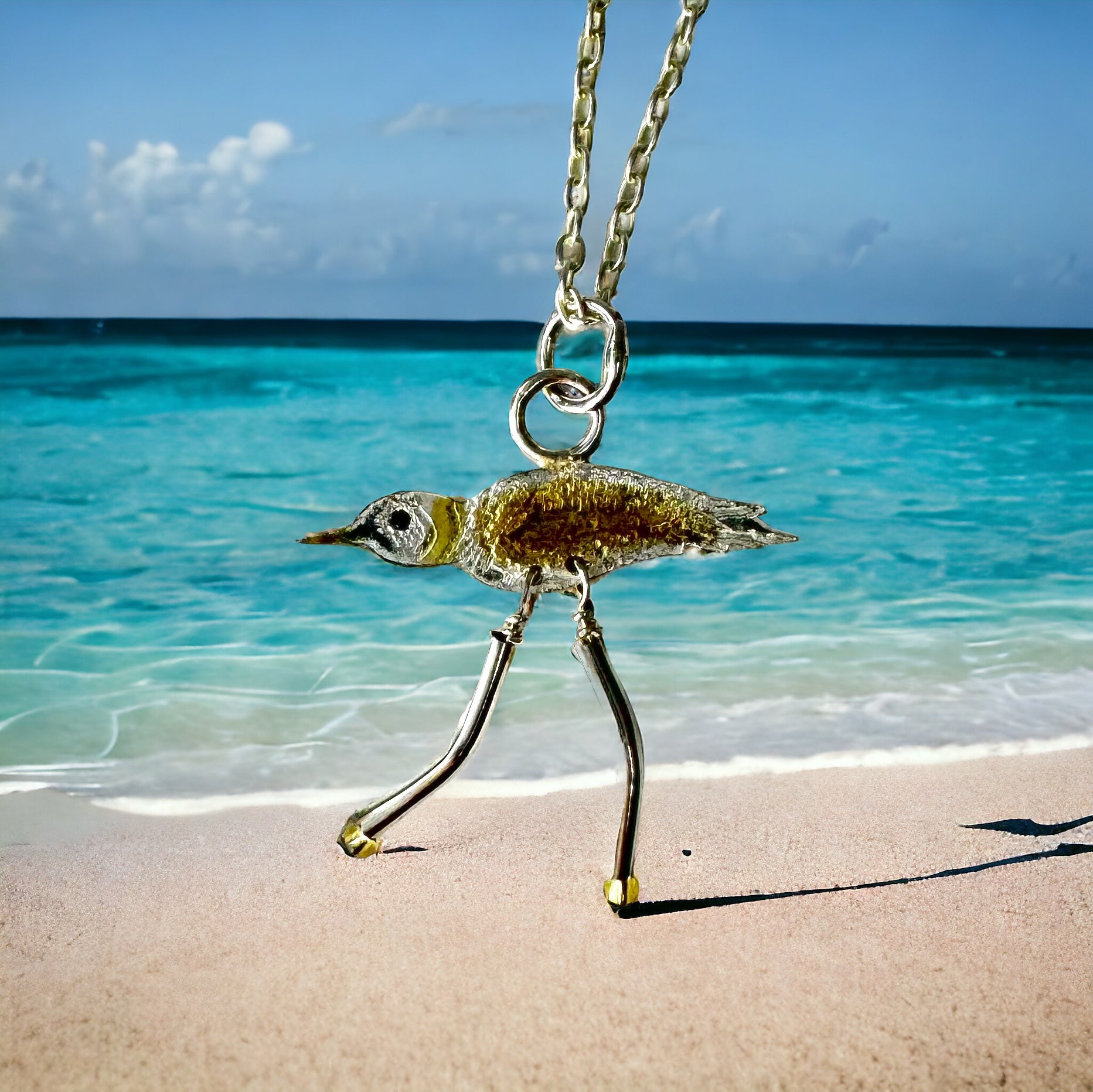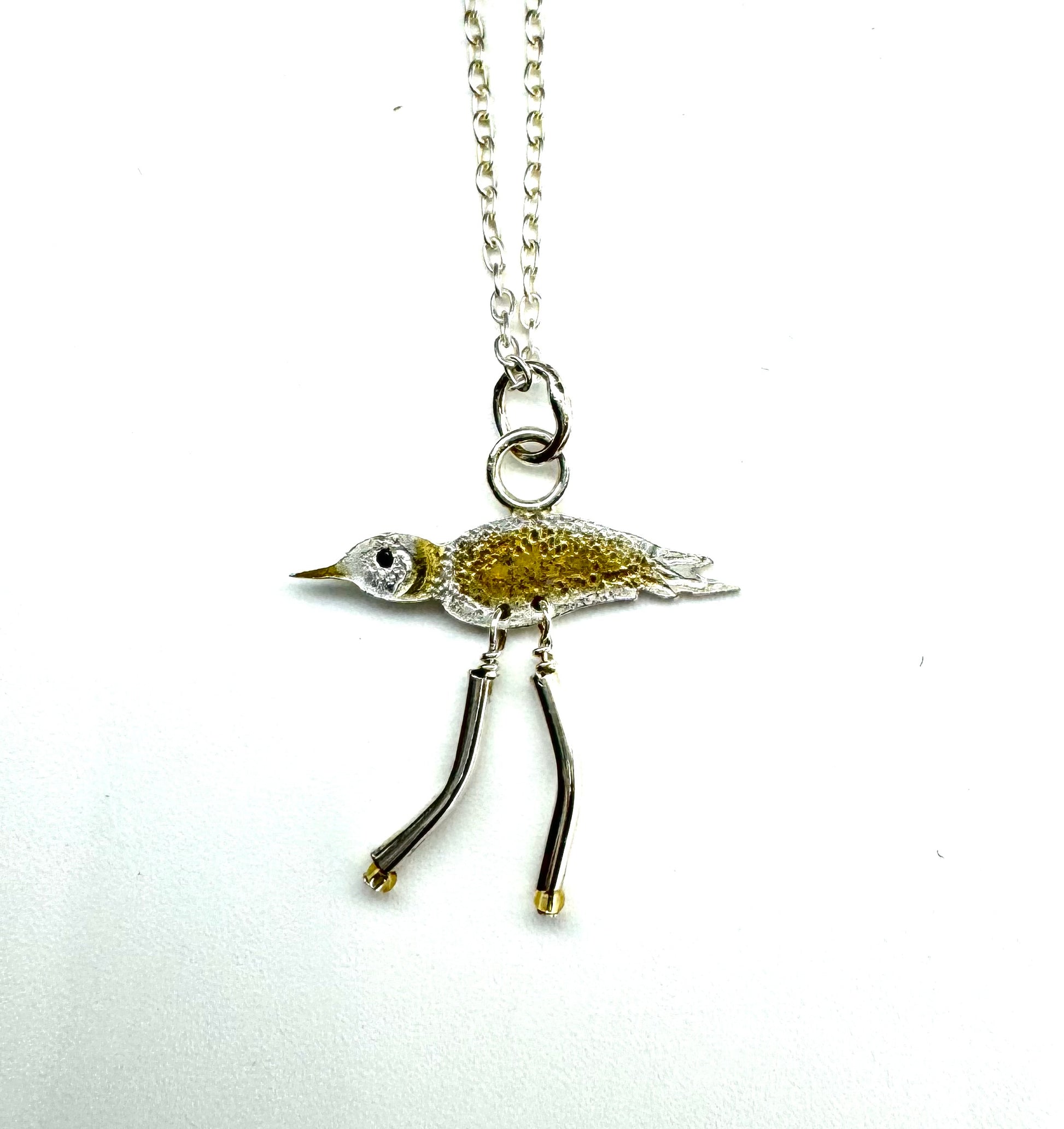 This Piping Plover Pendant is crafted from sterling silver and adorned with 24k gold, featuring moving legs and a striking black spinel eye. A unique and elegant piece of jewelry that captures the beauty and grace of this beloved bird. Perfect for nature and bird enthusiasts. Every one is handmade and will be slightly different.