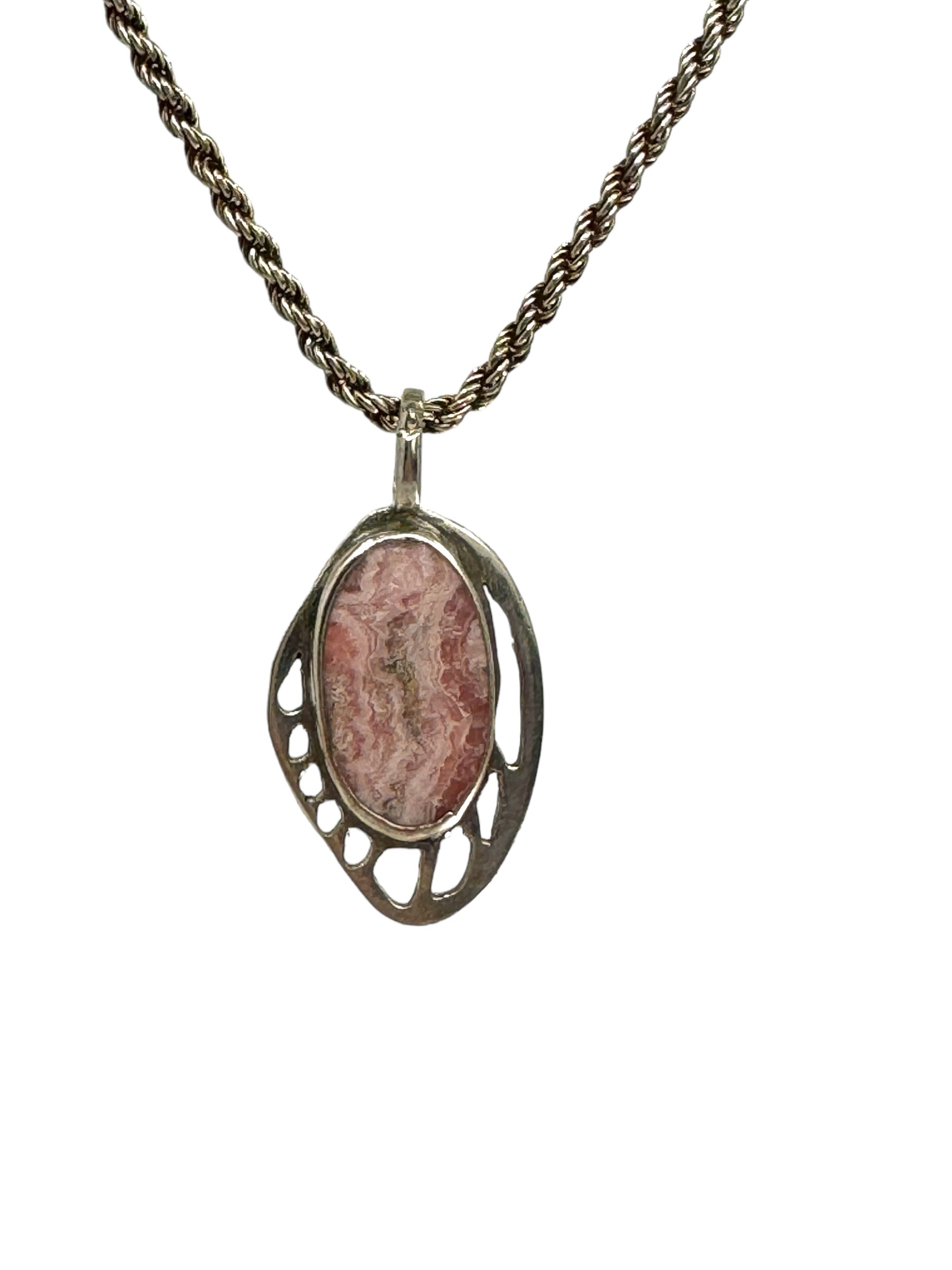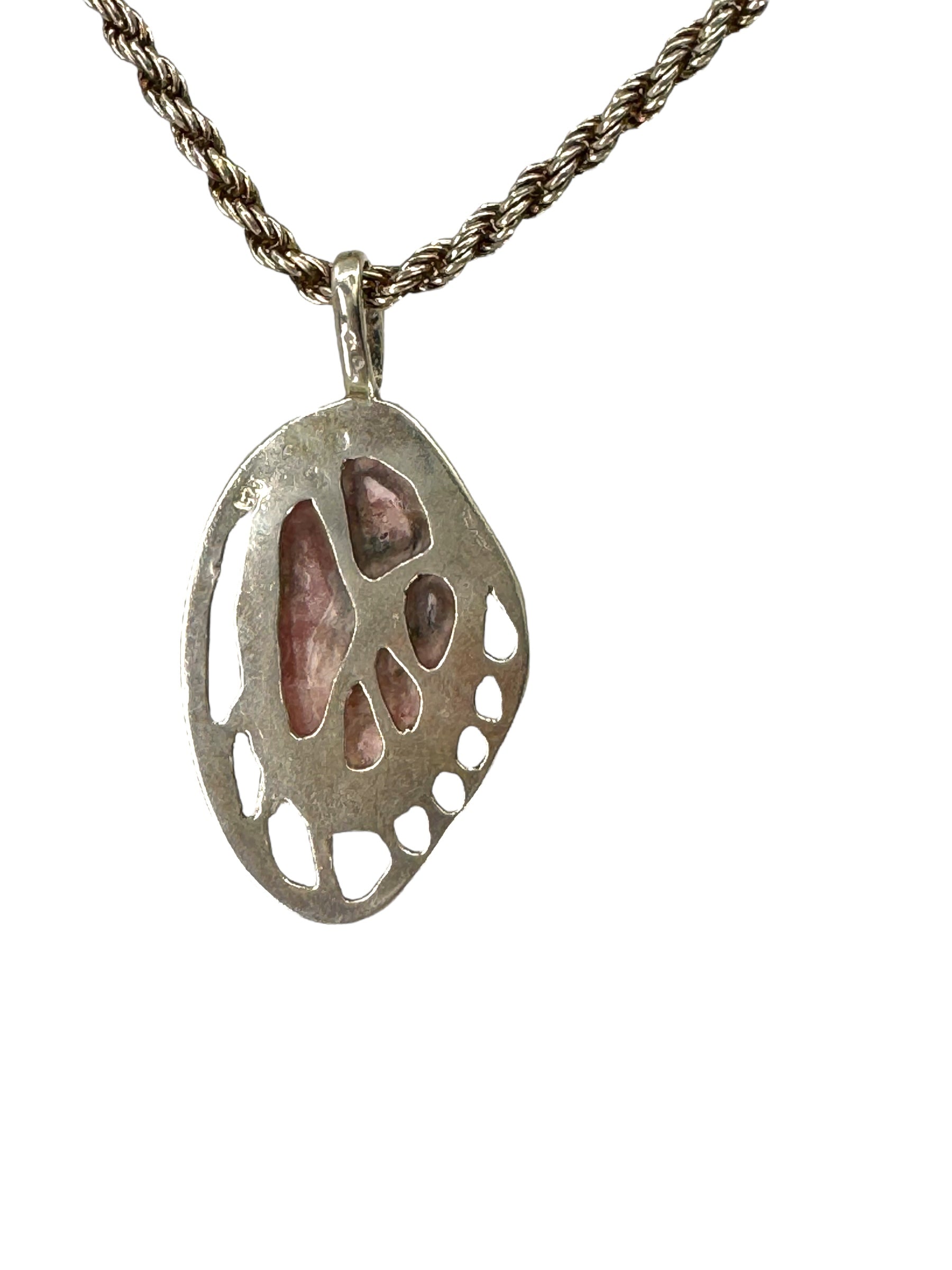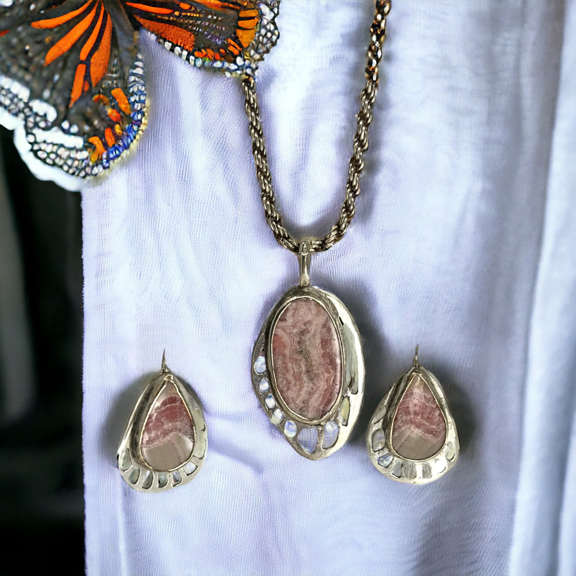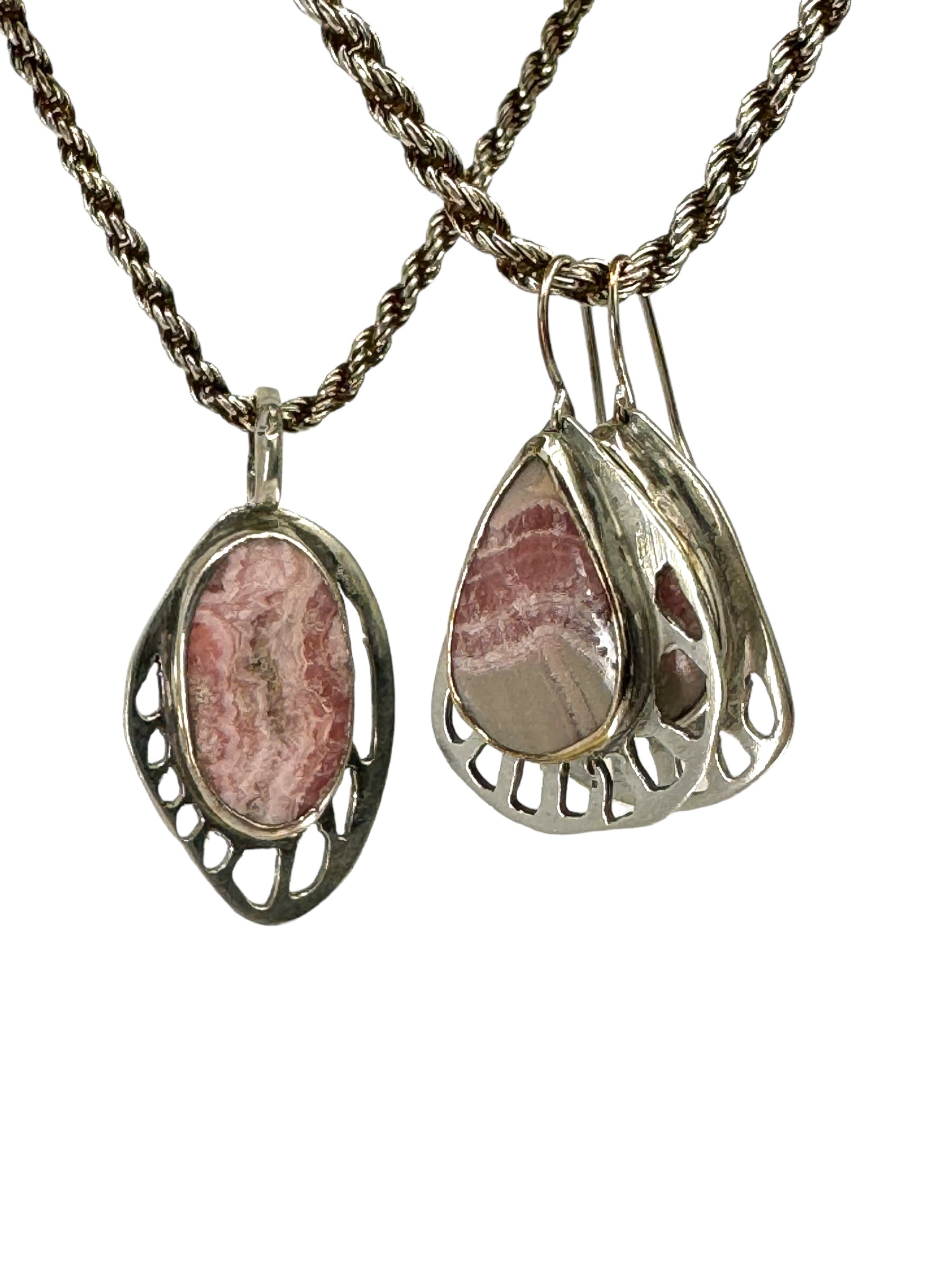 Experience the opulent sophistication of this sterling silver earring and necklace set, embellished with a breathtaking matched duo and accompanying piece of dainty, soft pink rhodochrosite gemstones. The exposed pierced backs of the bezel settings highlight and elevate the butterfly wing motif. The necklace comes on an 18" heavy sterling silver French rope chain.