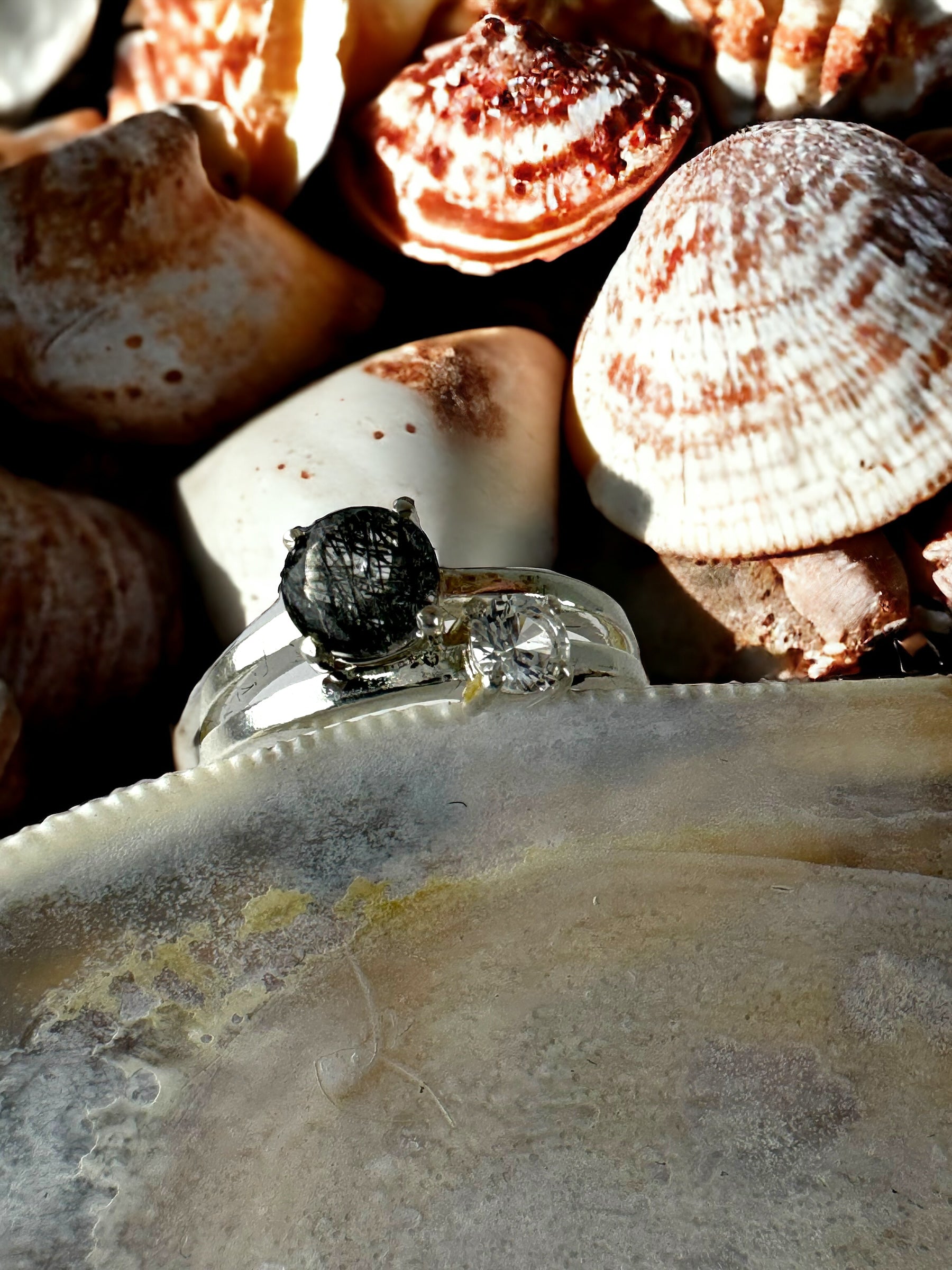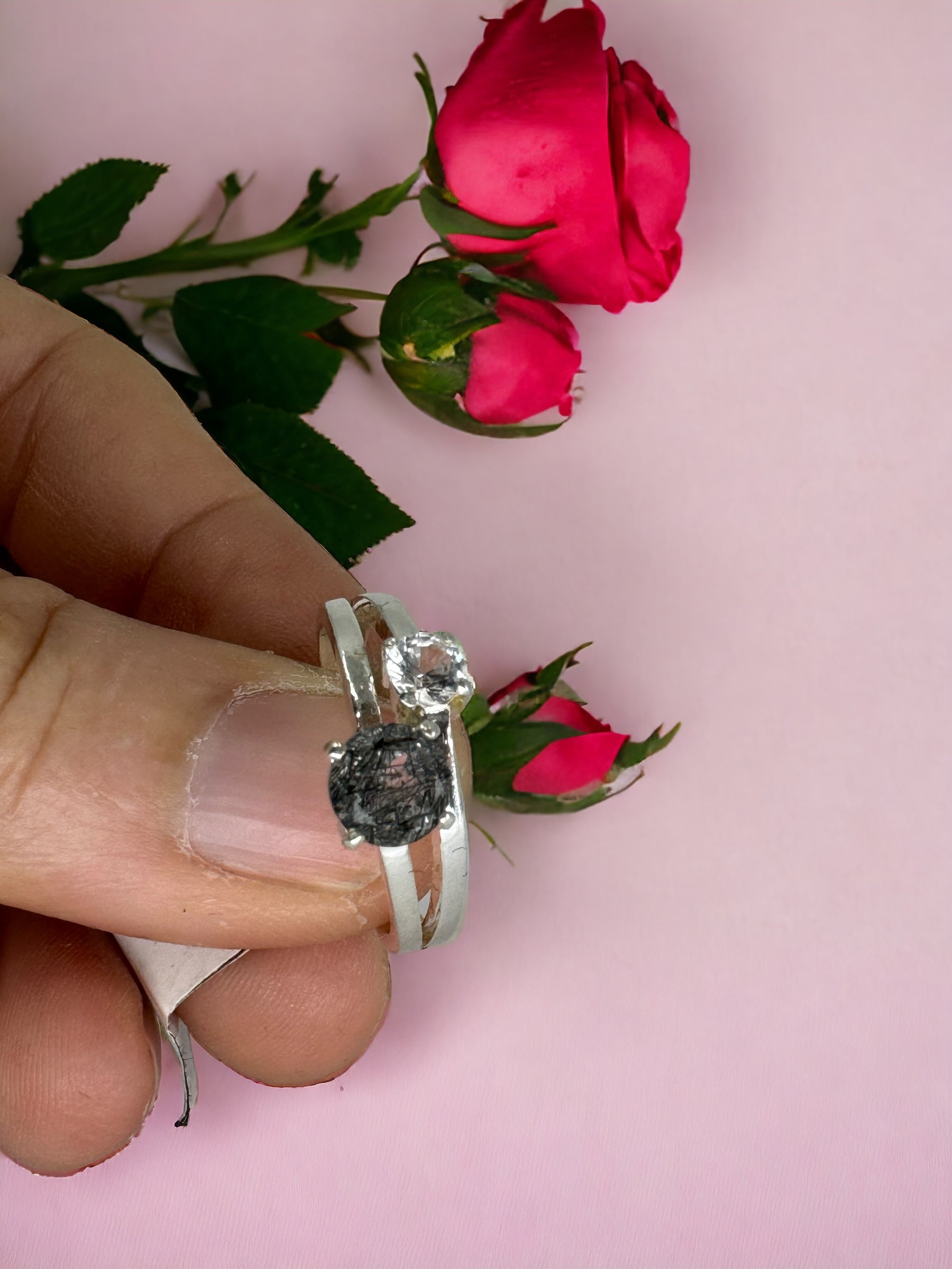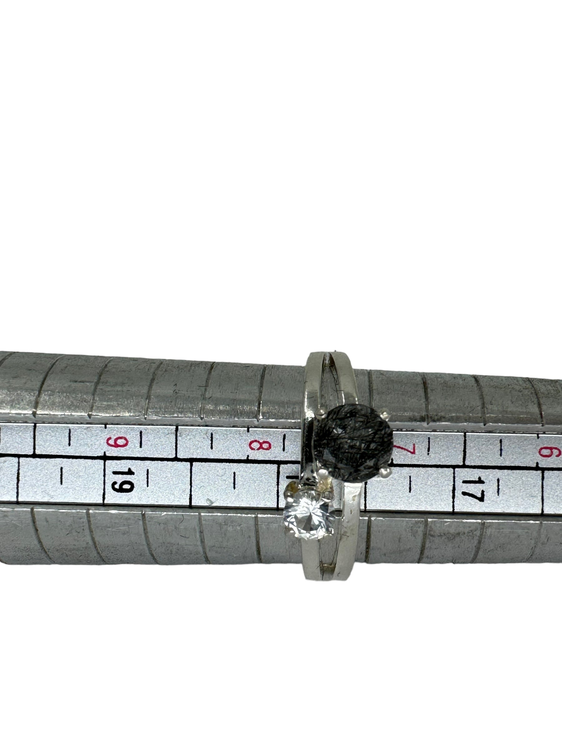 The connected sterling silver bands of this exquisite piece display a stunning round rutilated quartz and a round brilliant cut white sapphire. Crafted to fit a US size 7.5, this luxurious ring exudes understated sophistication. (Can be sized)