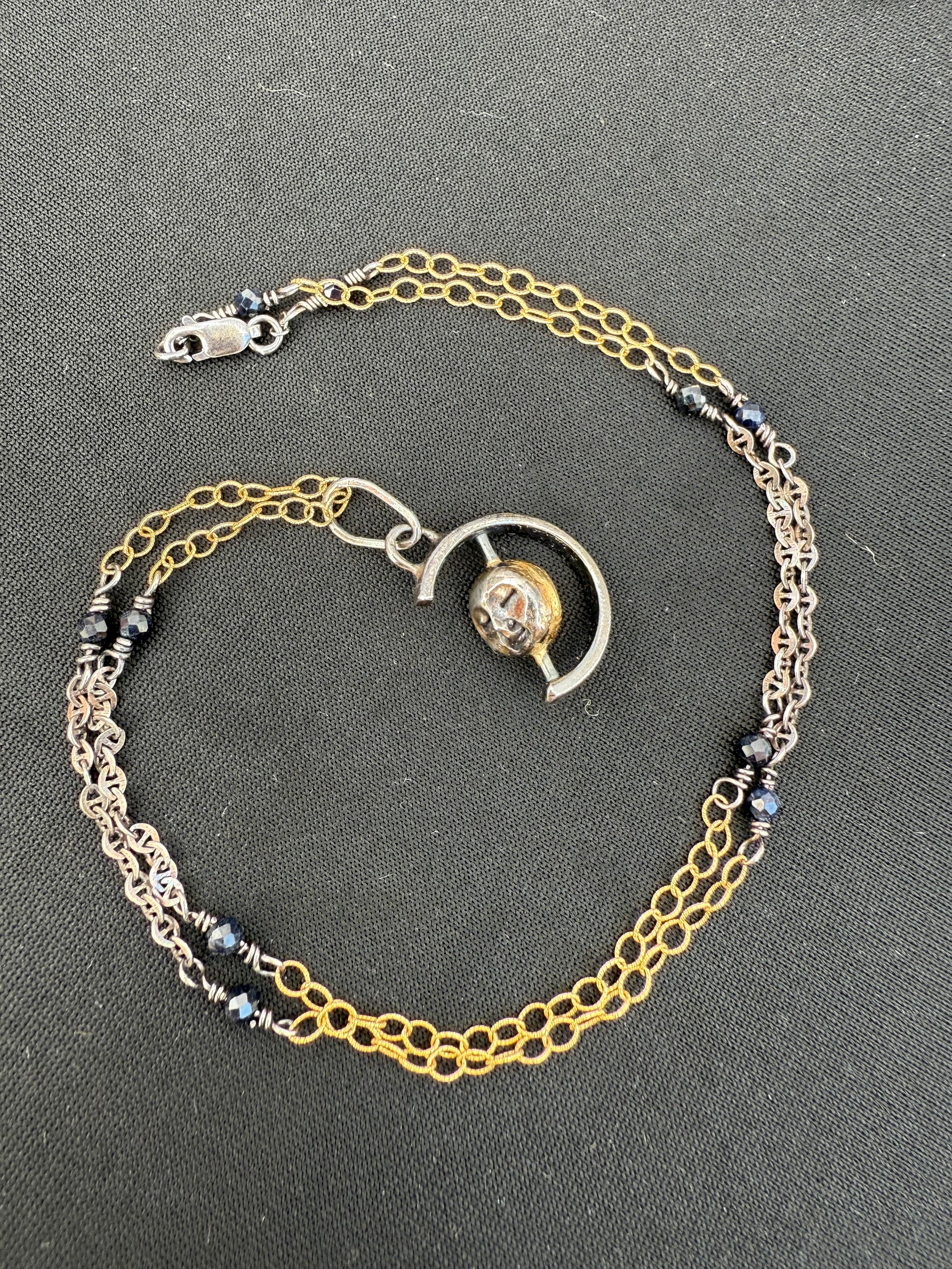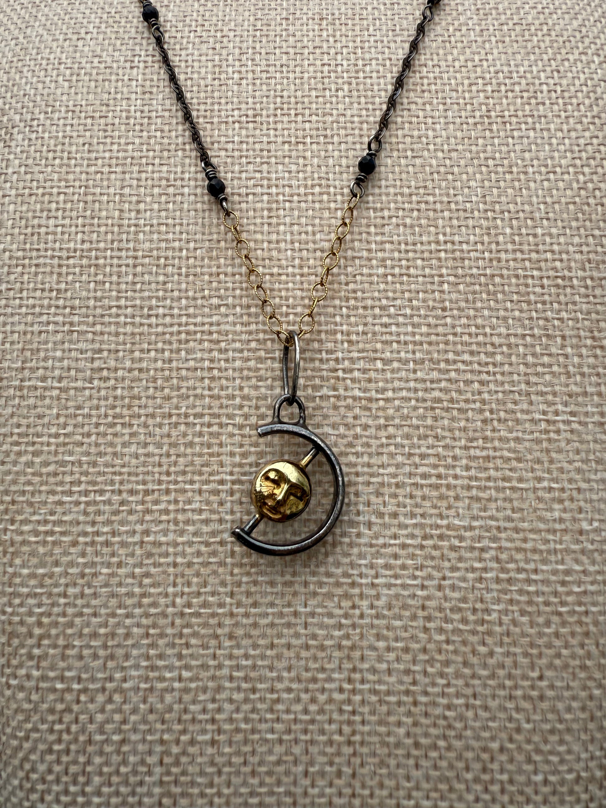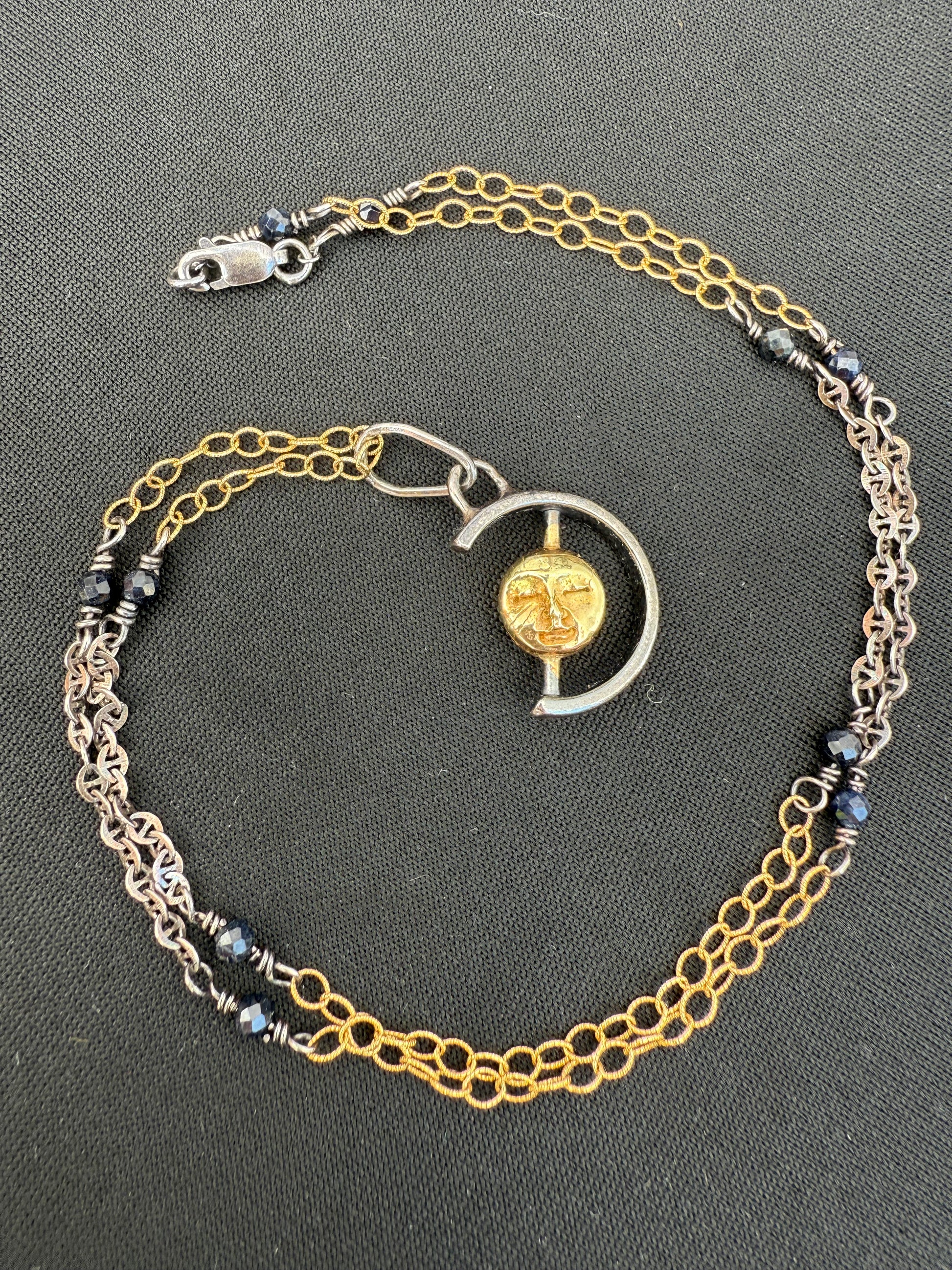 14 karat gold, sterling silver, moon/sun face spins on its axis. Included custom chain is 20 inches long. 14/20 GF, Sterling silver with sapphire beads.