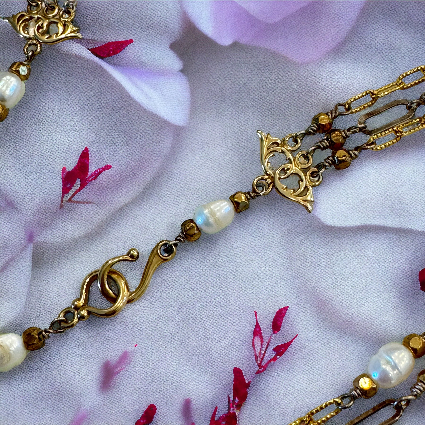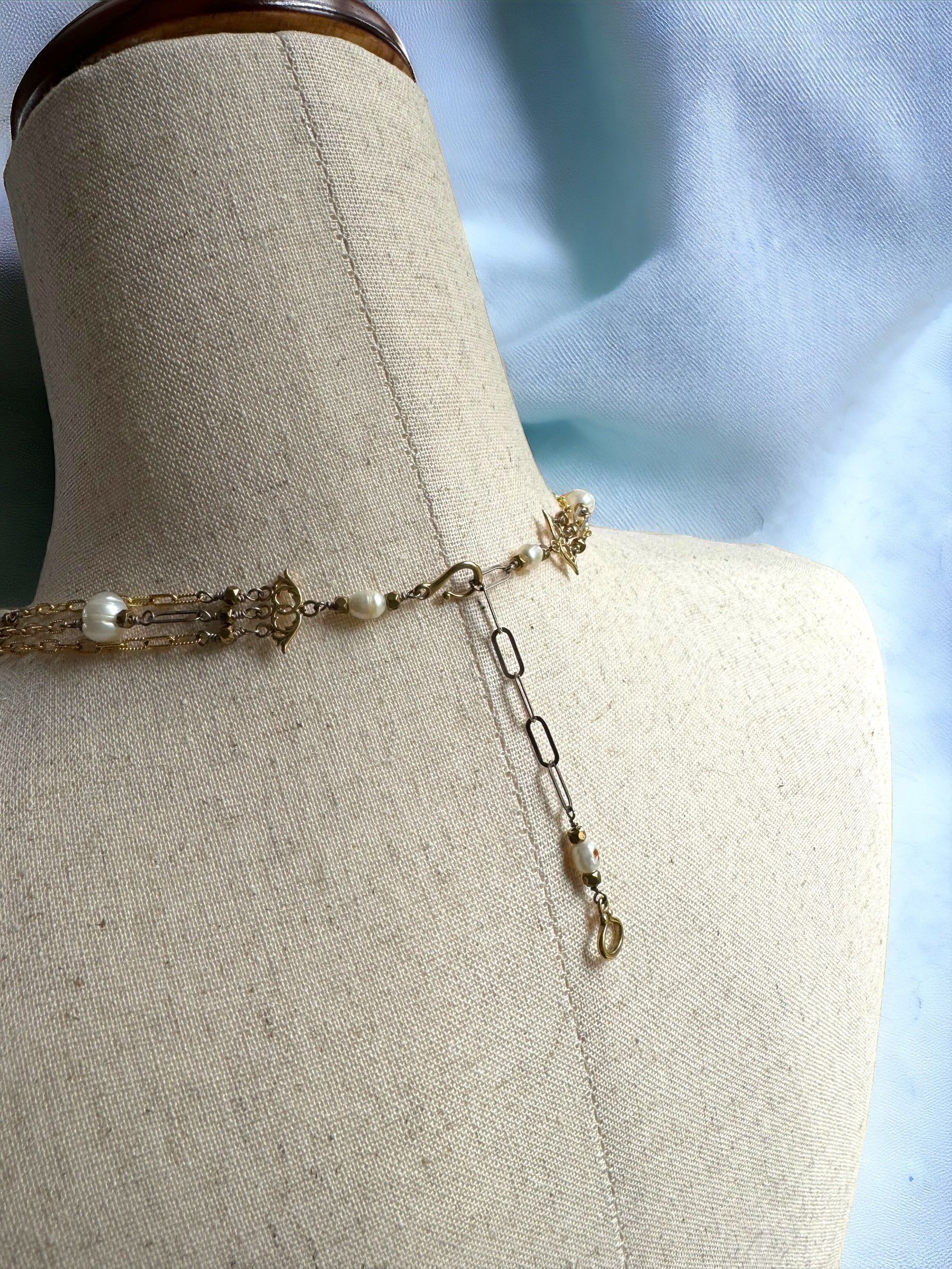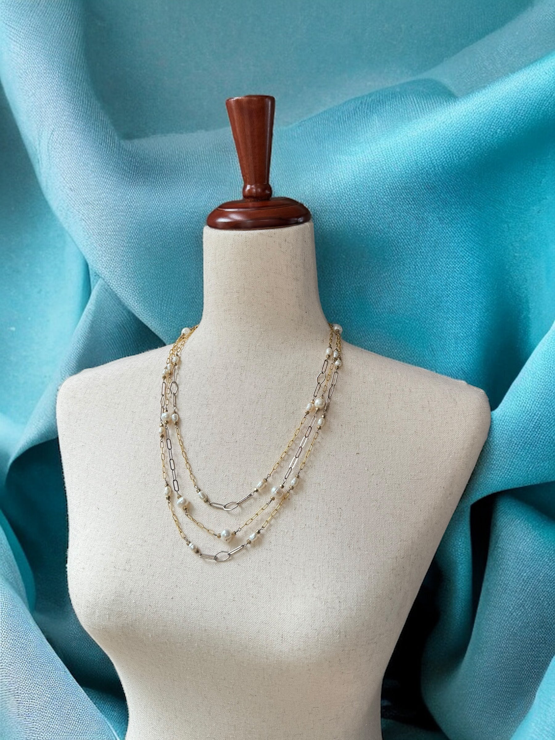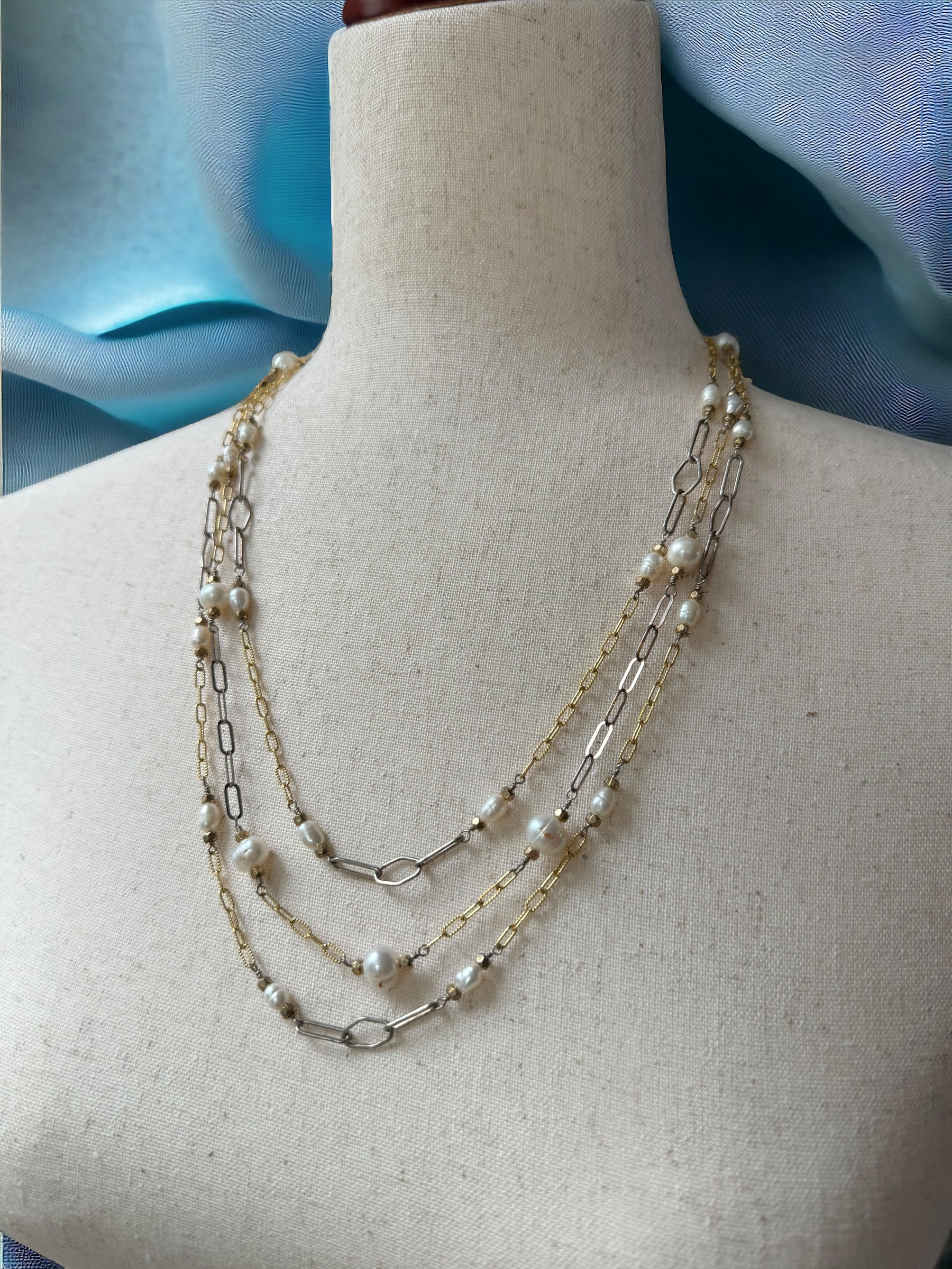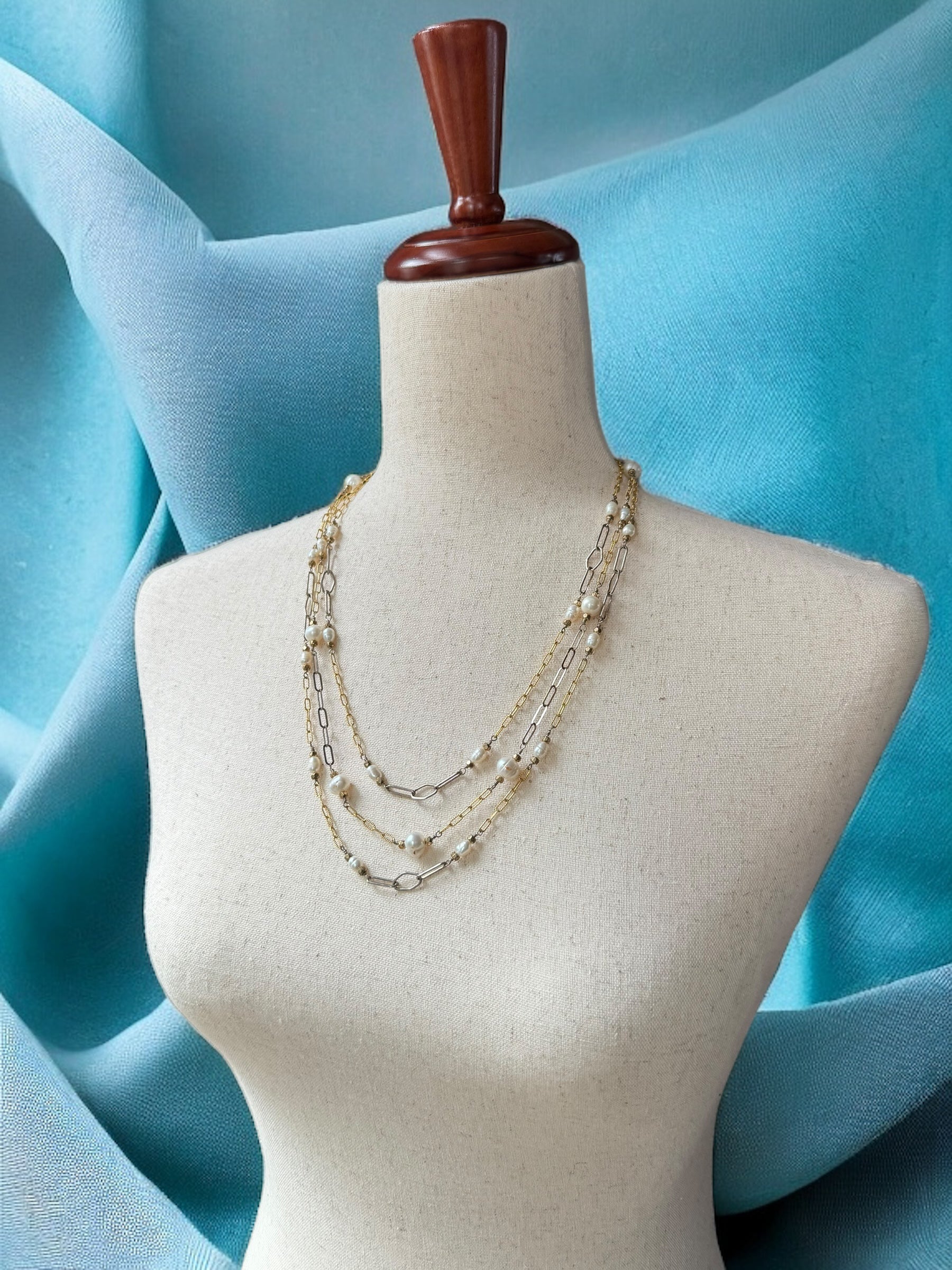 Indulge in the opulence of this Three Strand Gold and Pearl Necklace, featuring intricate strands of sterling silver and 14k gold, embellished with hand-wired pearls and bronze beads. Adorned with 14k gold strand separators, an adjustable sterling chain, and a sophisticated 14k hook and eye clasp, this luxurious piece can easily be dressed up or down.