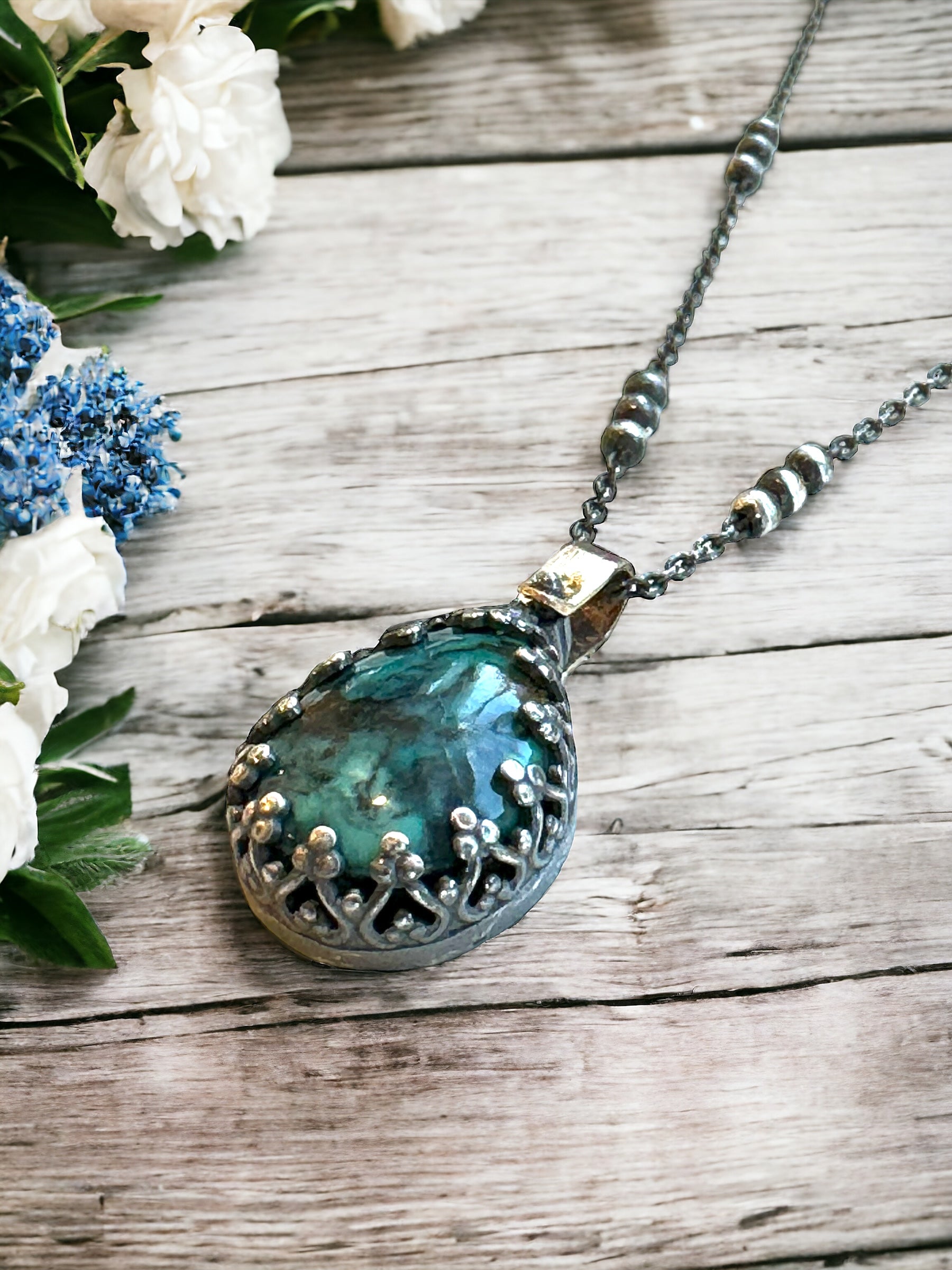 This turquoise teardrop pendant is encased in a stunning sterling silver bezel and features a 14k rose-gold bail. The first two pictures showcase the pendant on a beaded silver chain, which is included with purchase. Other charm and chain options shown are available for separate purchase.
