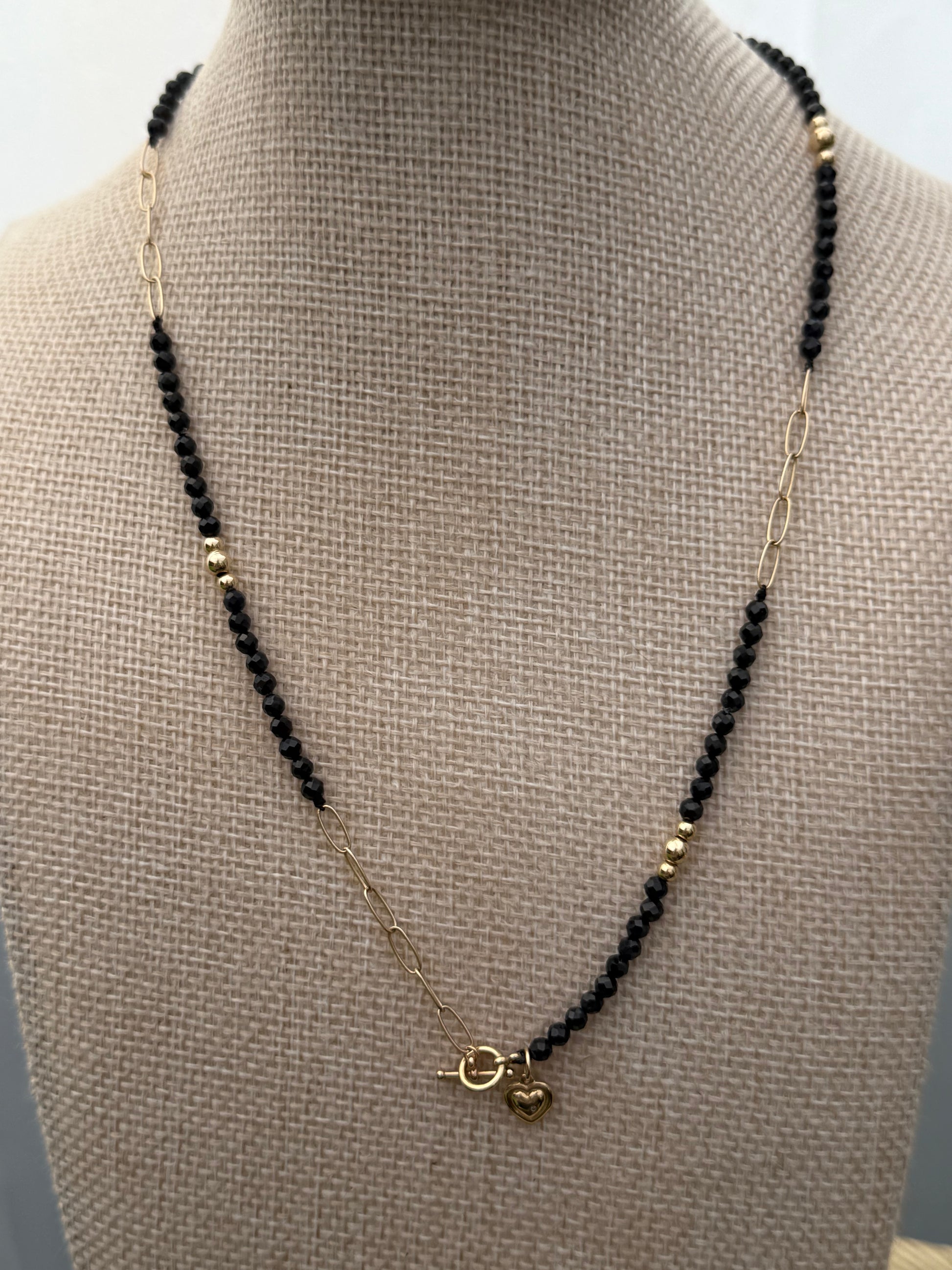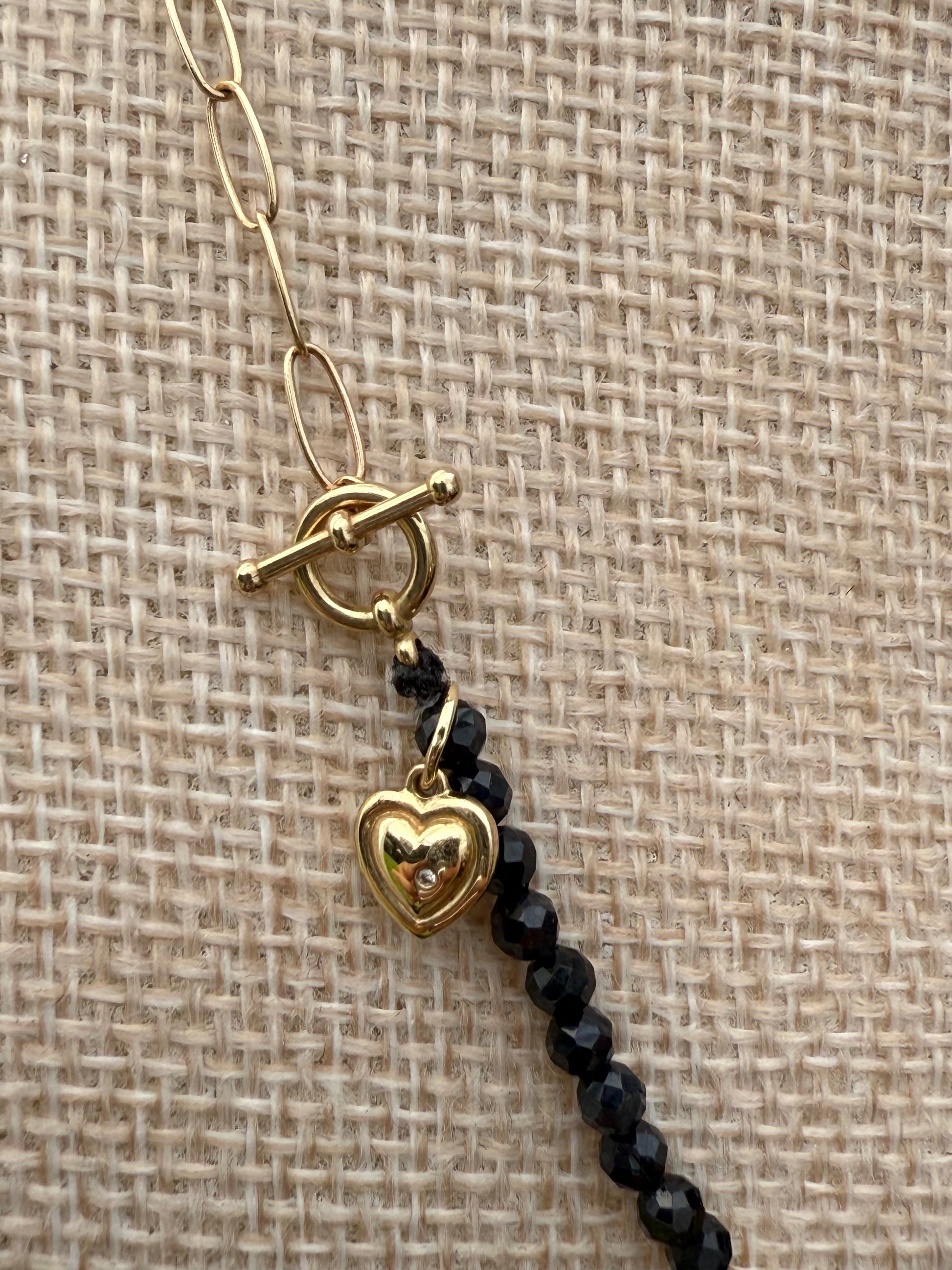 Faceted Sapphire beads and 14k round beads alternate with 14k chain. 14k gold toggle with a 14k gold heart charm with a tiny diamond accent.