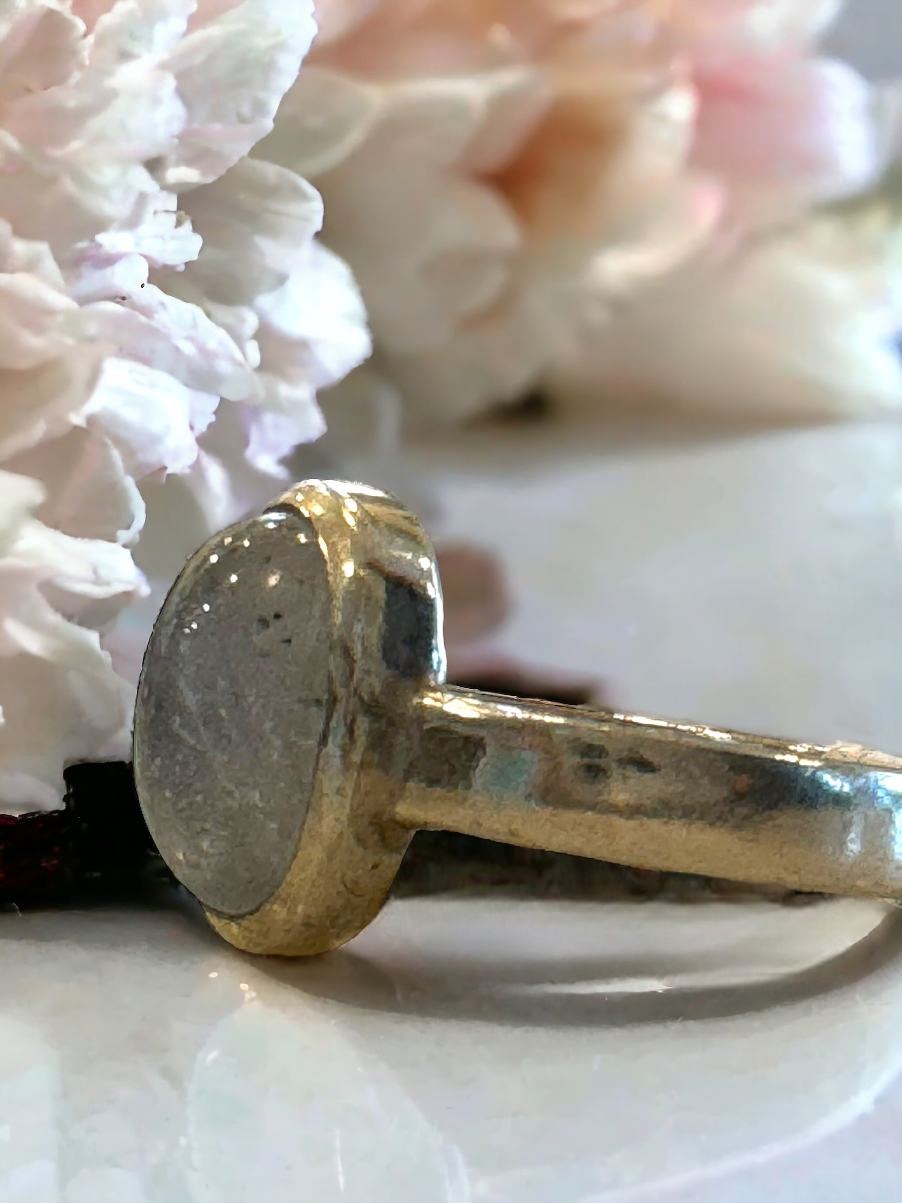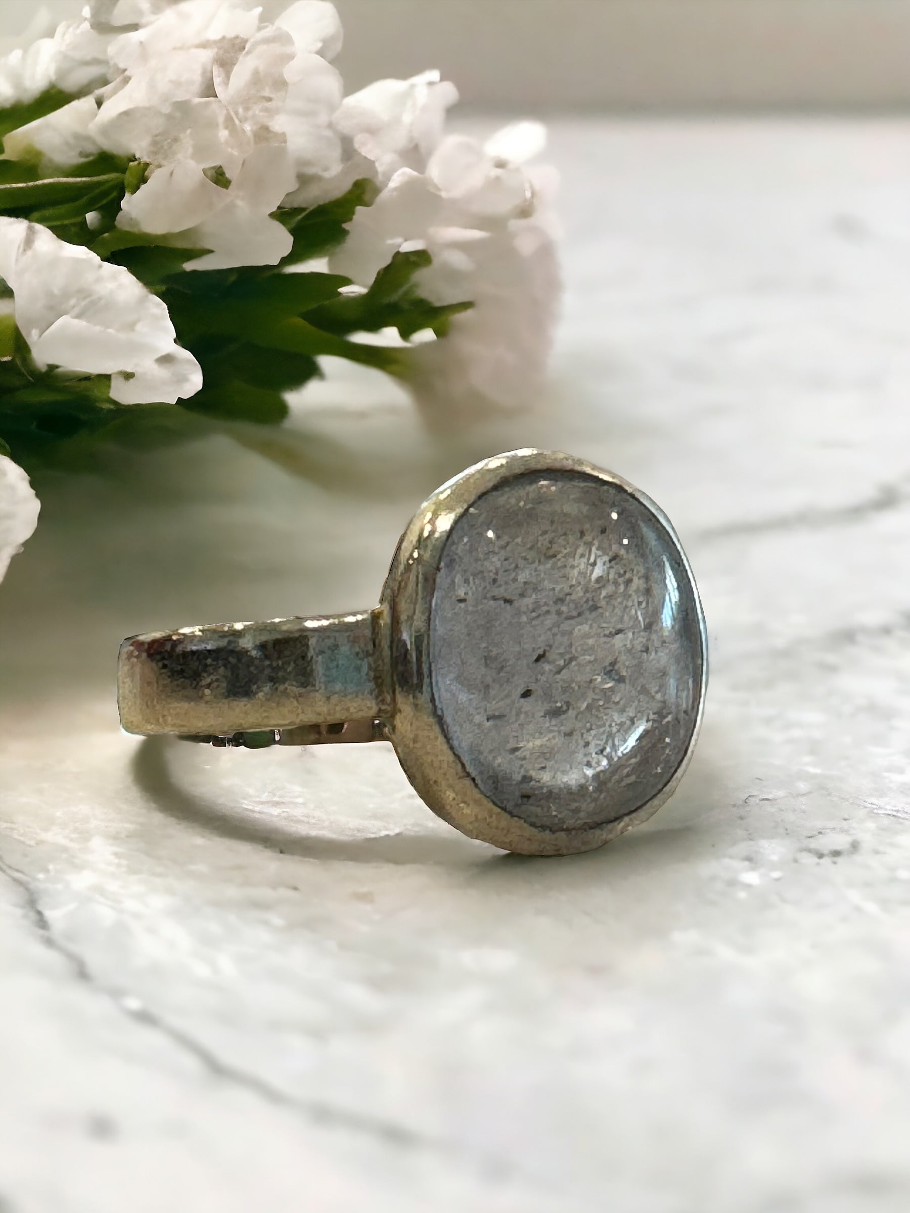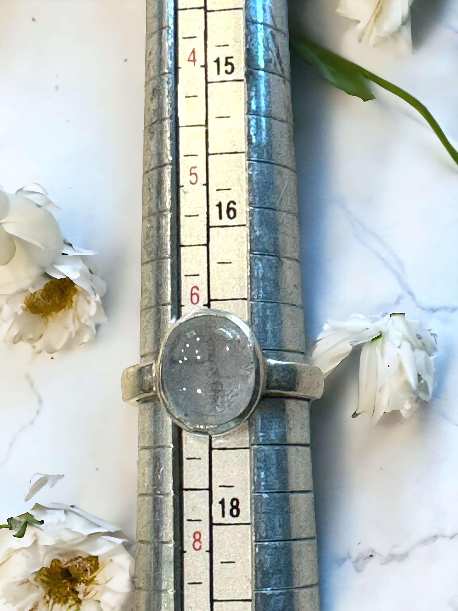 Experience the unique beauty of Goshenite with our stunning cabochon ring, expertly crafted in sterling silver. This rare gemstone, from the same family as aquamarine, boasts an icy blue hue and distinct inclusions that add character to each stone. Available in US size 7 (can be sized).